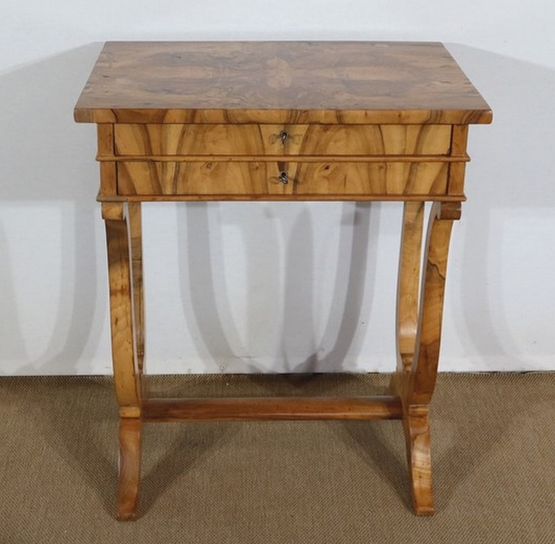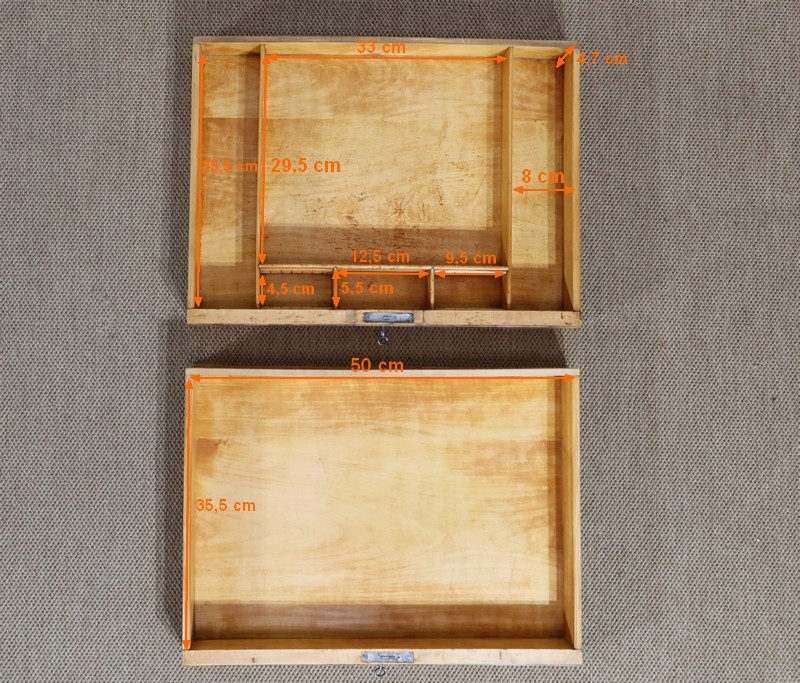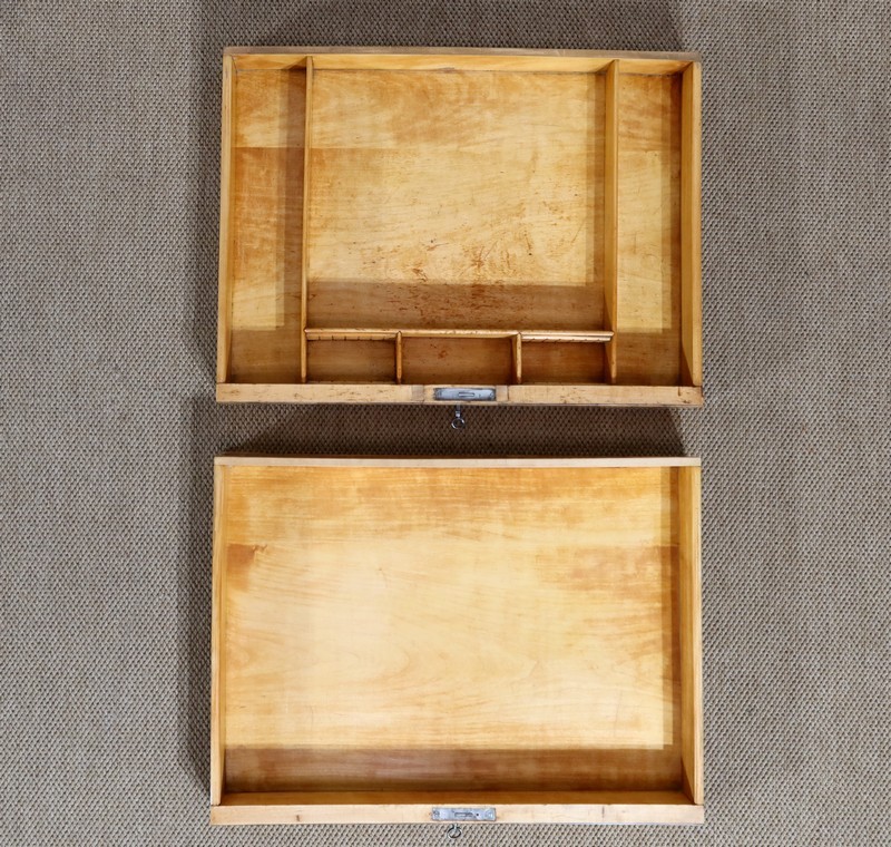 La ceinture ouvre en façade par 2 tiroirs, espacés d’une baguette de bois à demi-rond. Leurs faces avant sont constituées en placage de fil tombant et se suivant. Ils se verrouillent à l’aide de clés, qui accompagnent les serrures d’origine en parfait état de fonctionnement. L’intérieur du premier dispose de 2 grands et de 2 petits compartiments, ainsi que d’un espace central important. Le second n’étant pas compartimenté, il offre une possibilité de stockage plus conséquente.