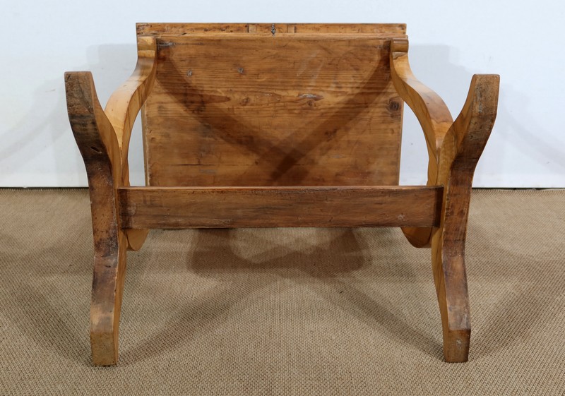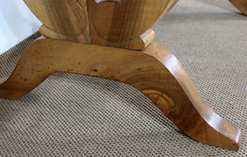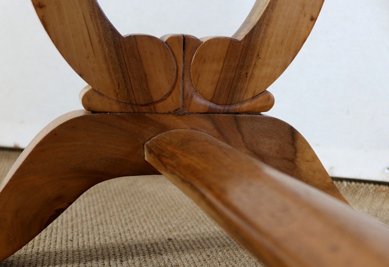 L’ensemble repose sur des pieds en forme de « Lyre », formés de 2 éléments en noyer massif à volutes qui se rejoignent, se terminant par une élégante découpe. Un léger façonnage de volutes dégagées vient enjoliver la partie basse du piétement, qui est elle-même renforcée par une entretoise, offrant robustesse et stabilité à ce mobilier.