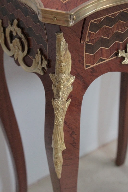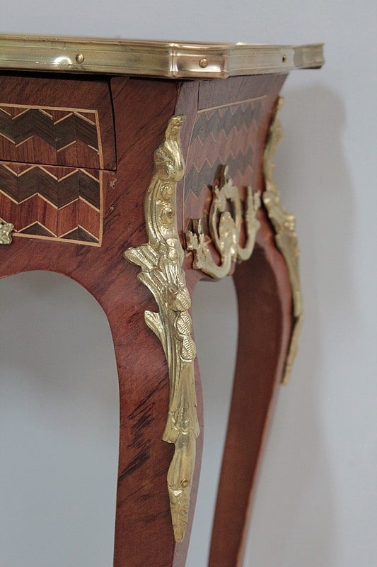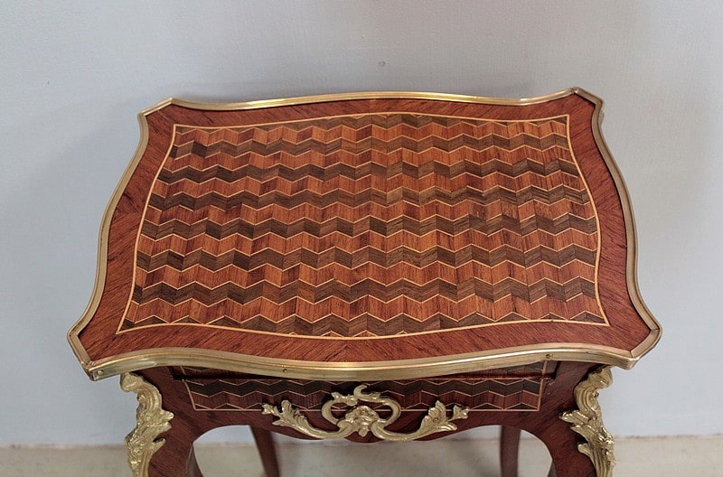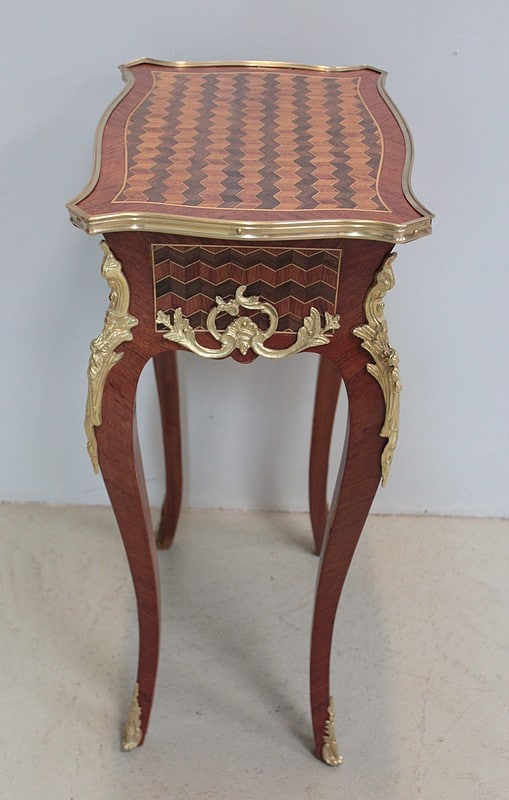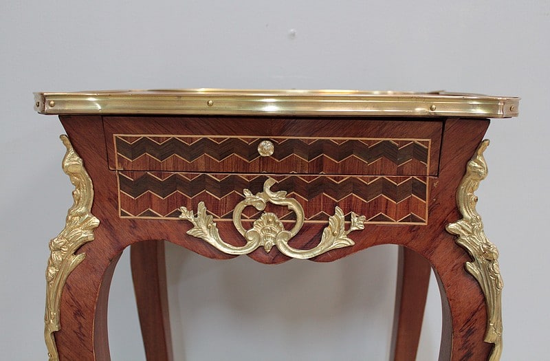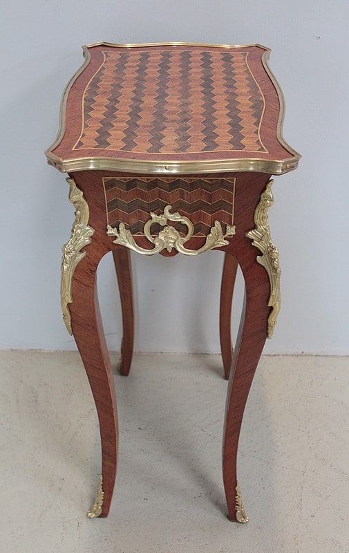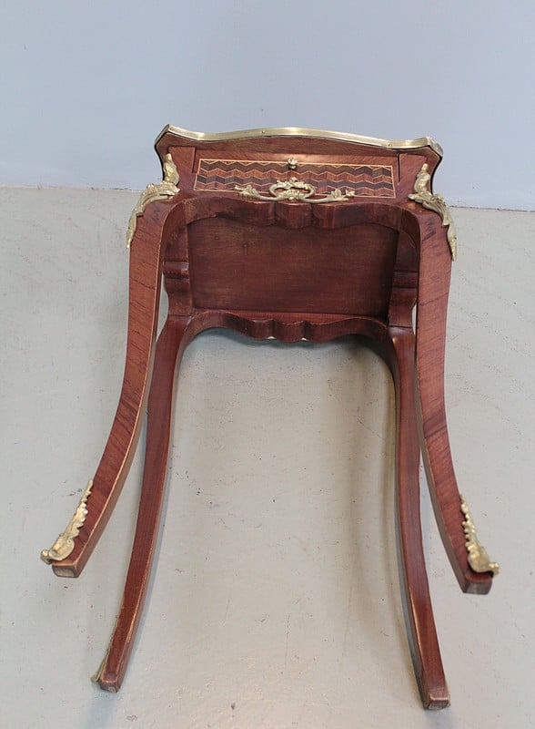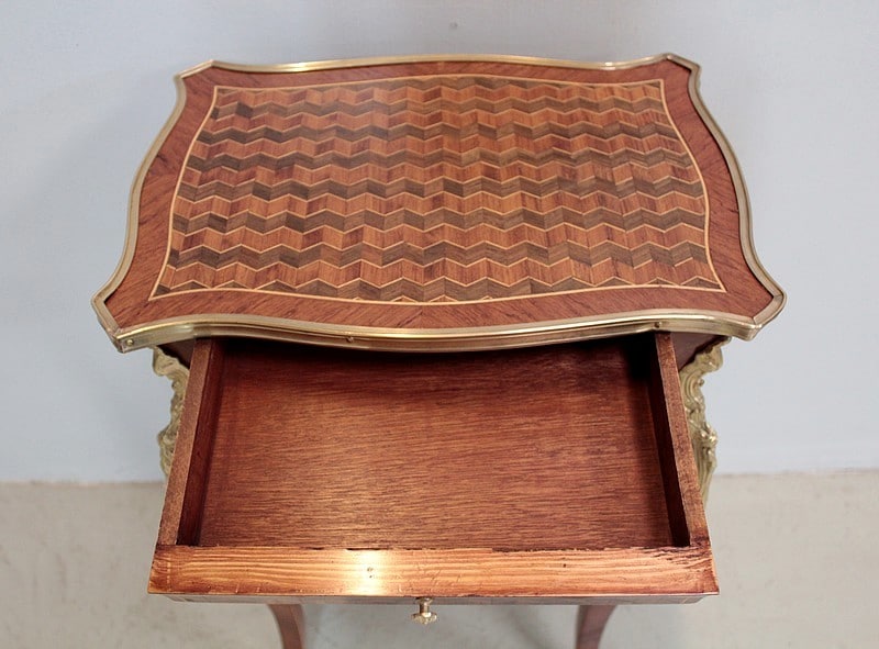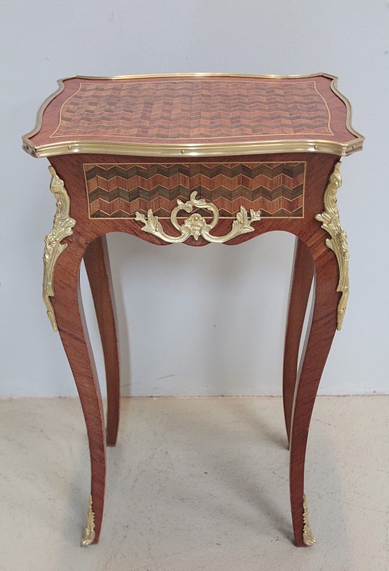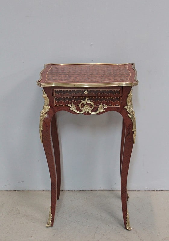Petite table de style Louis XV en marqueterie de Bois de rose, amarante et acajou ouvrant par un petit tiroir.
