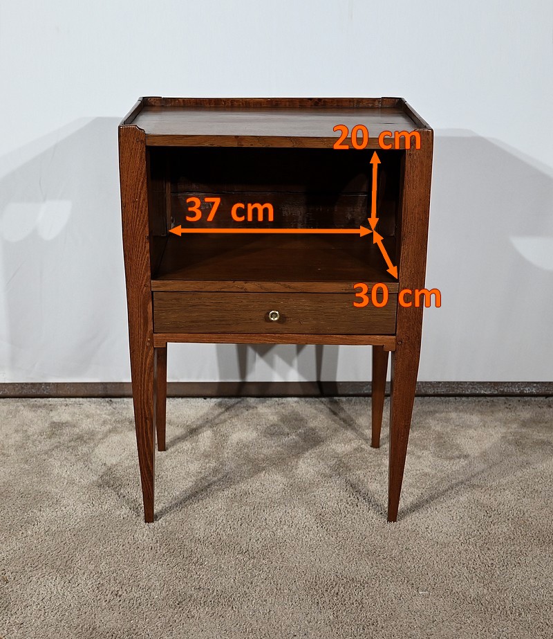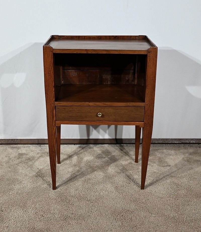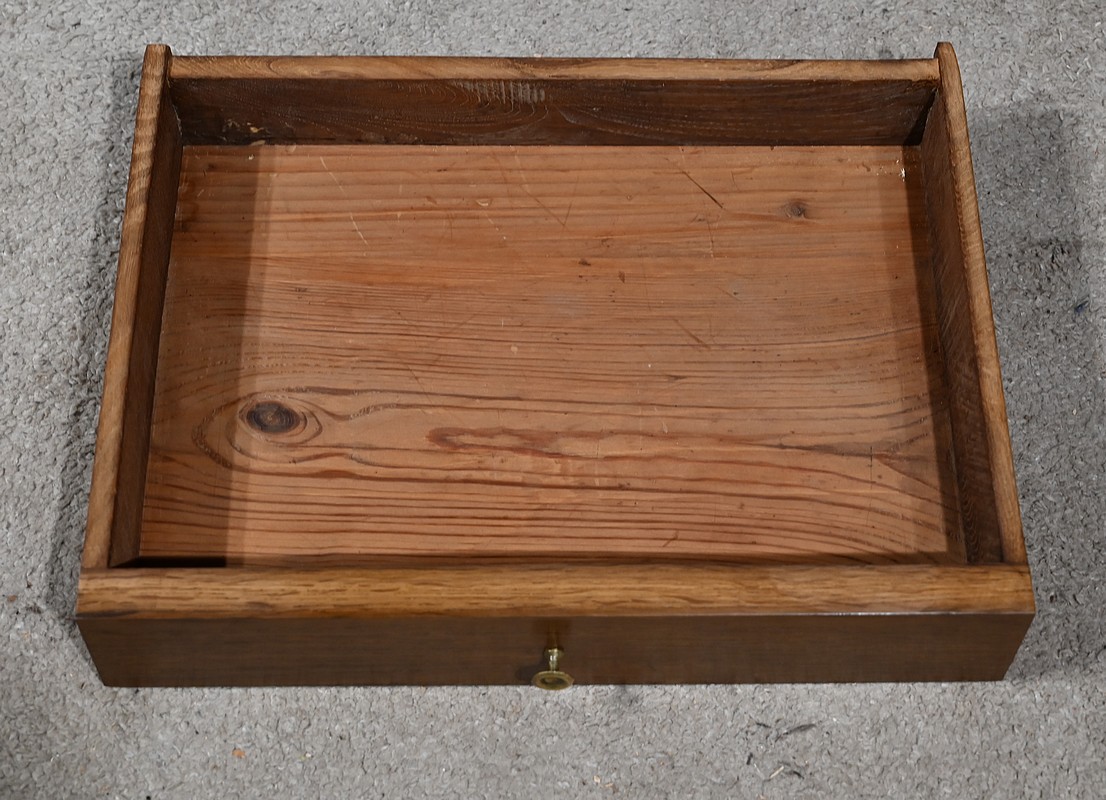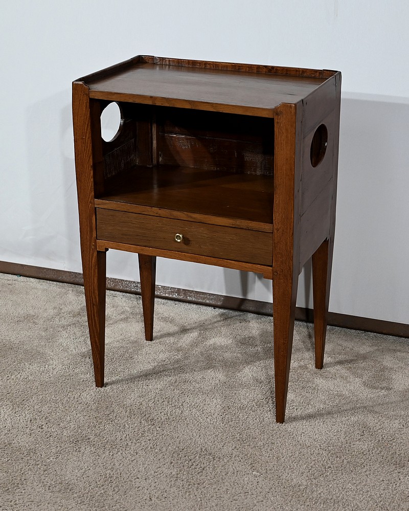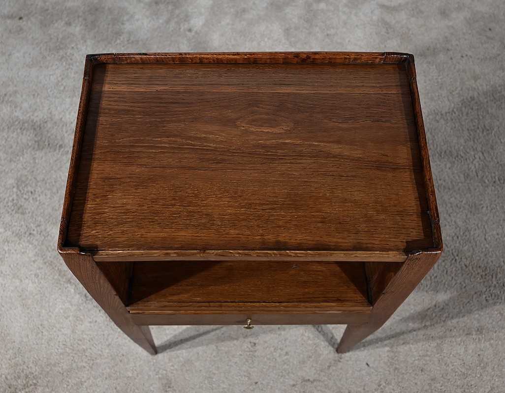 Table à en-cas en chêne massif, dotée d’un caisson formant une grande niche, reposant sur quatre pieds gainés en partie basse et anguleux en partie haute. Les côtés de ce meuble sont ajourés d’un ovale et en façade il possède un tiroir muni d’un bouton de tirage en laiton ciselé.