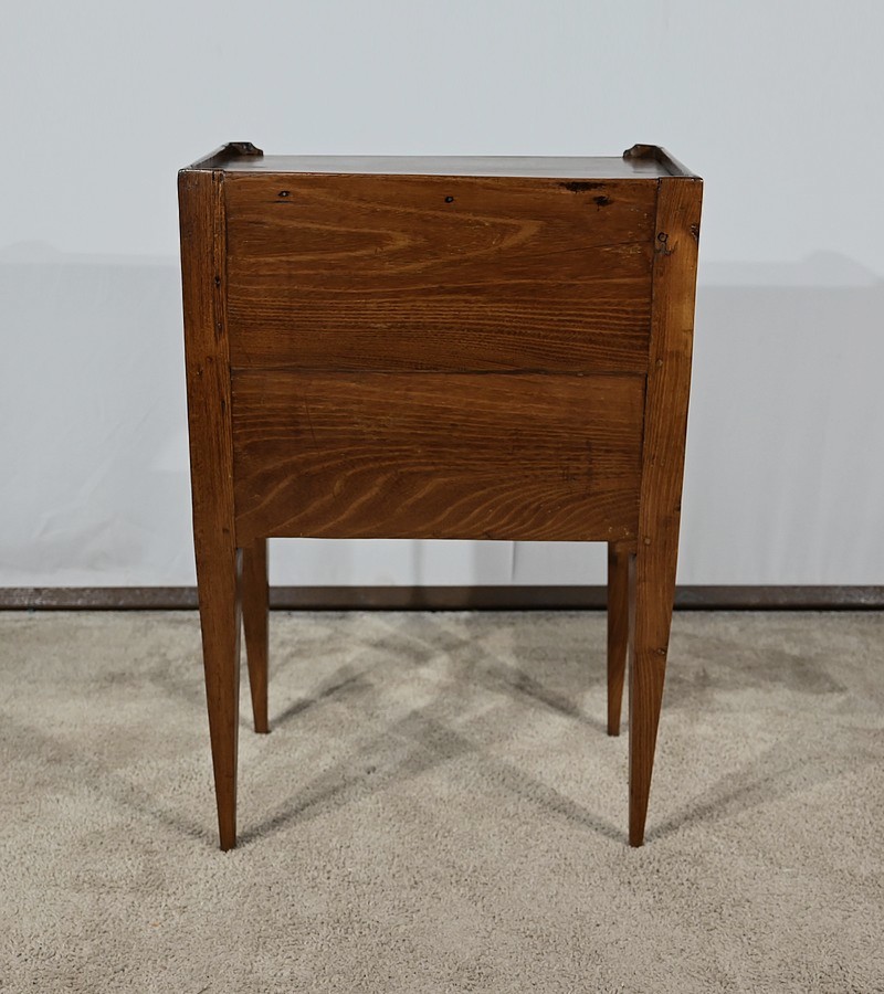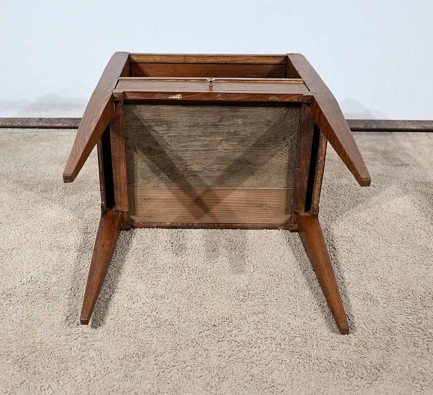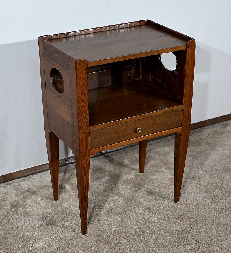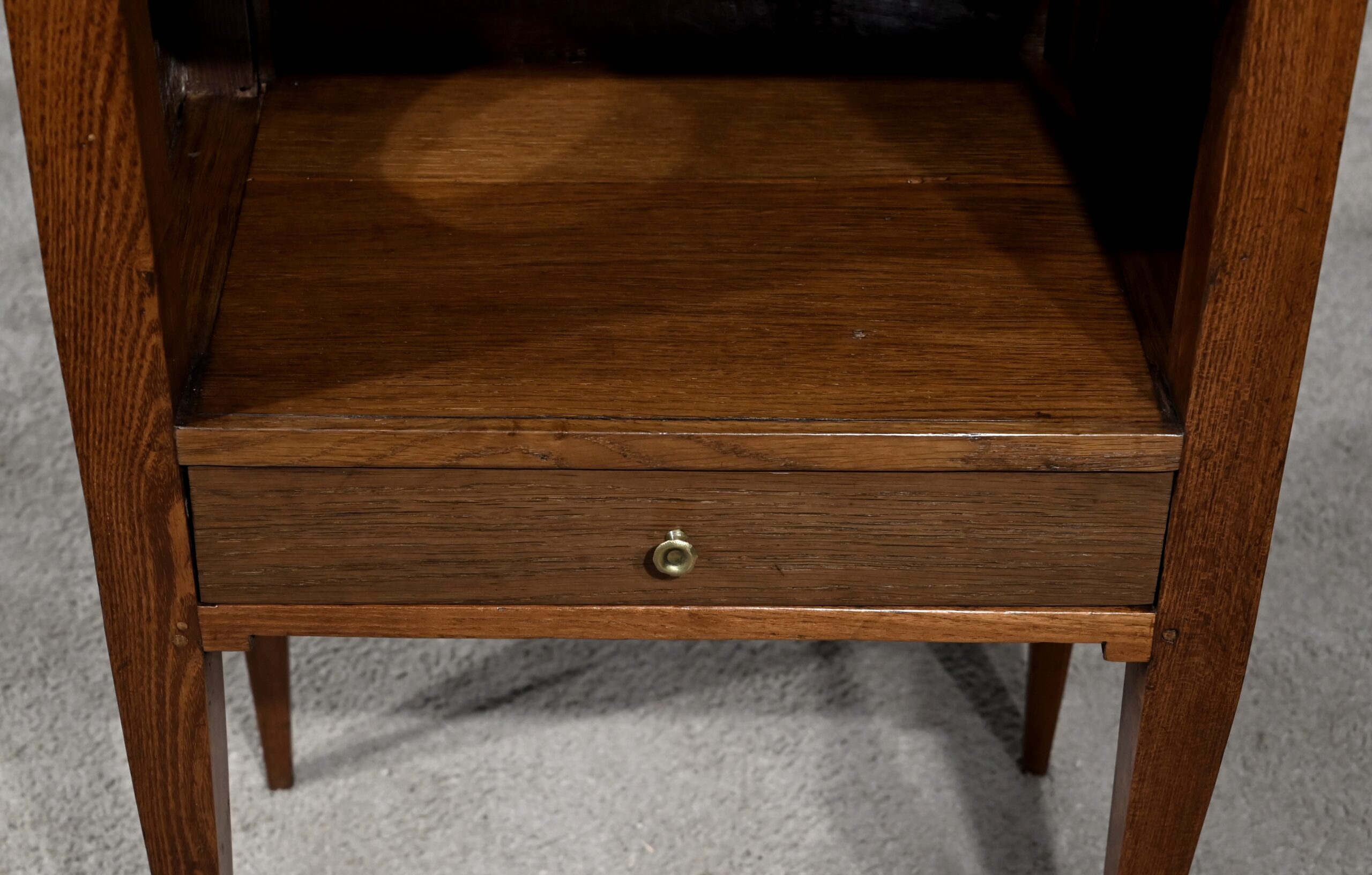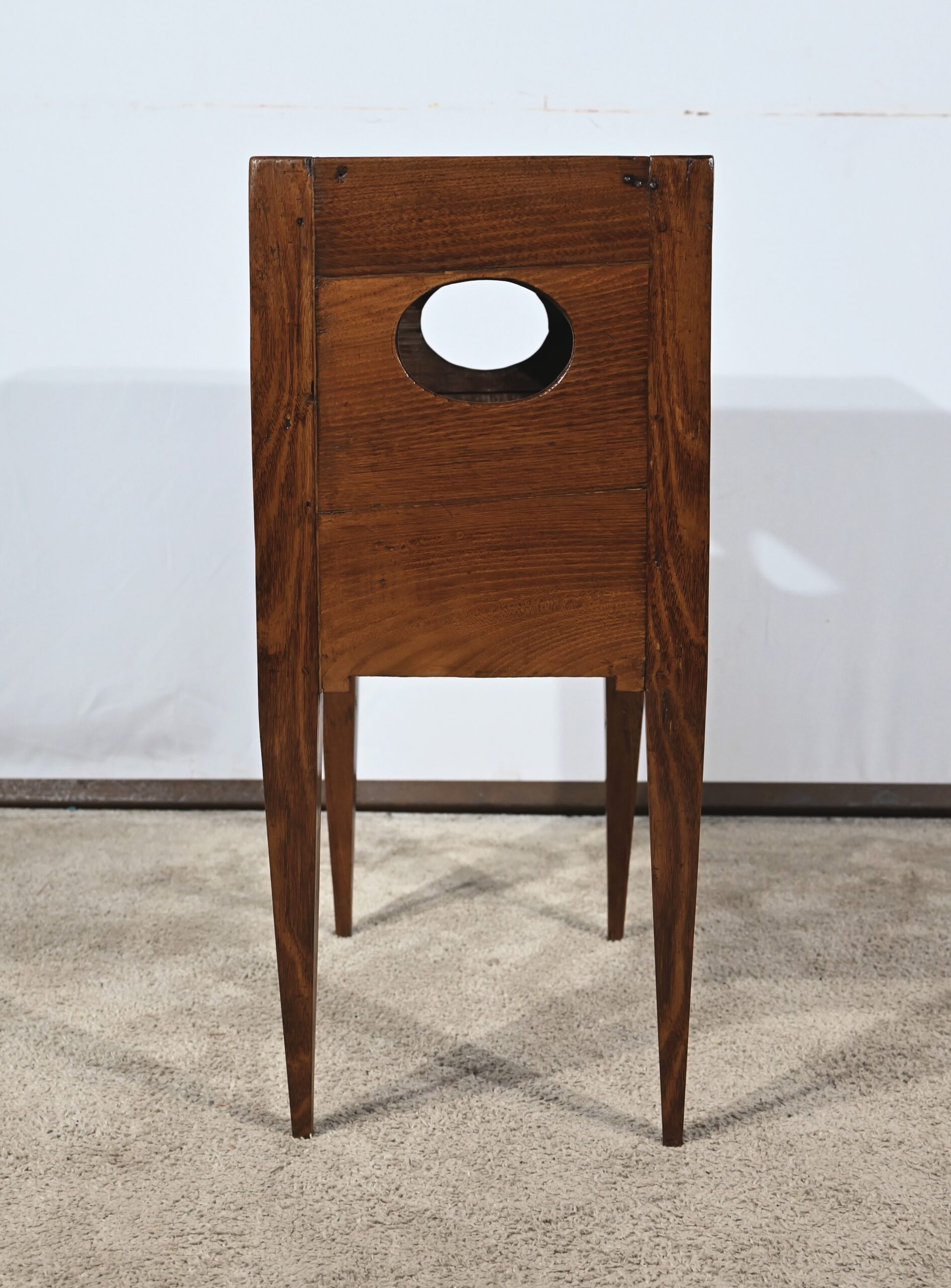 Table à en-cas en chêne massif, dotée d’un caisson formant une grande niche, reposant sur quatre pieds gainés en partie basse et anguleux en partie haute. Les côtés de ce meuble sont ajourés d’un ovale et en façade il possède un tiroir muni d’un bouton de tirage en laiton ciselé.