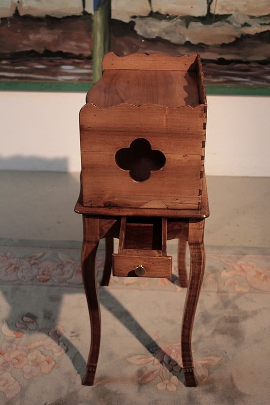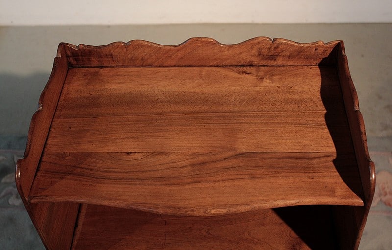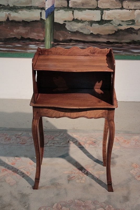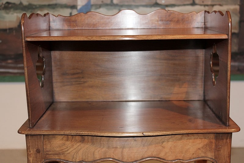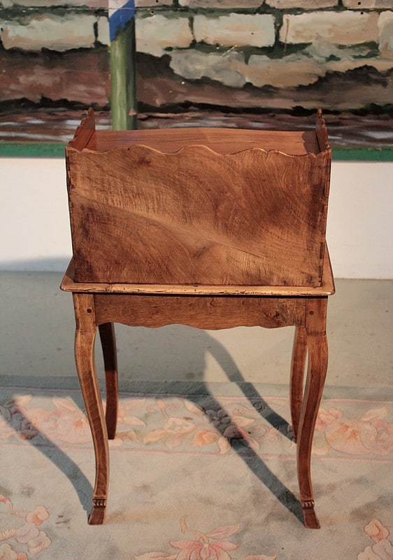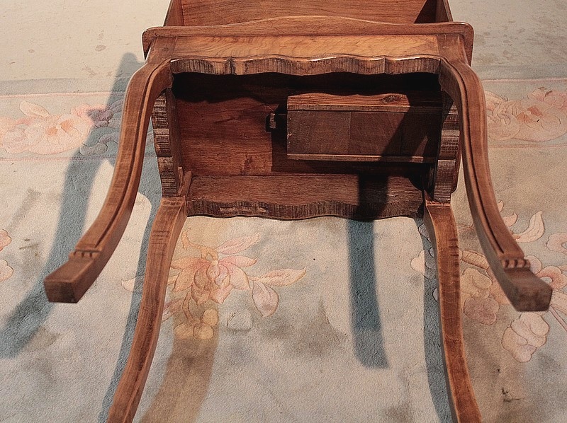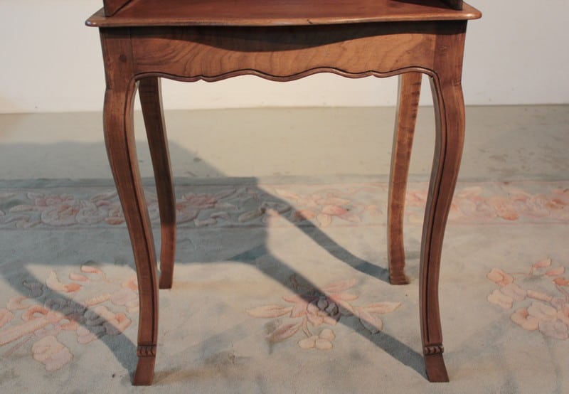 Table à ‘en-cas’ de style Louis XV en noyer et merisier. Elle repose sur 4 pieds cambrés. Son dessus est entouré, sur 3 côtés, d’une galerie chantournée. Époque : fin XIXe