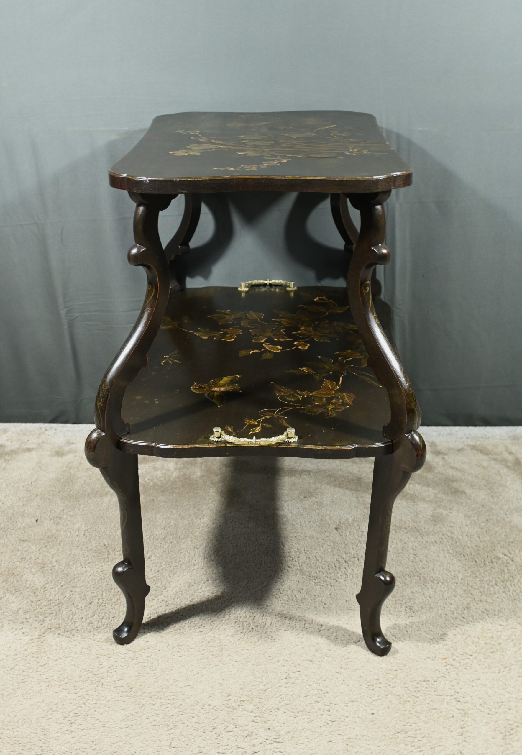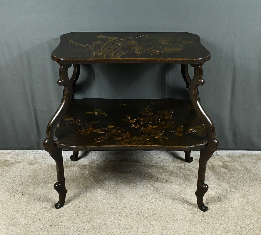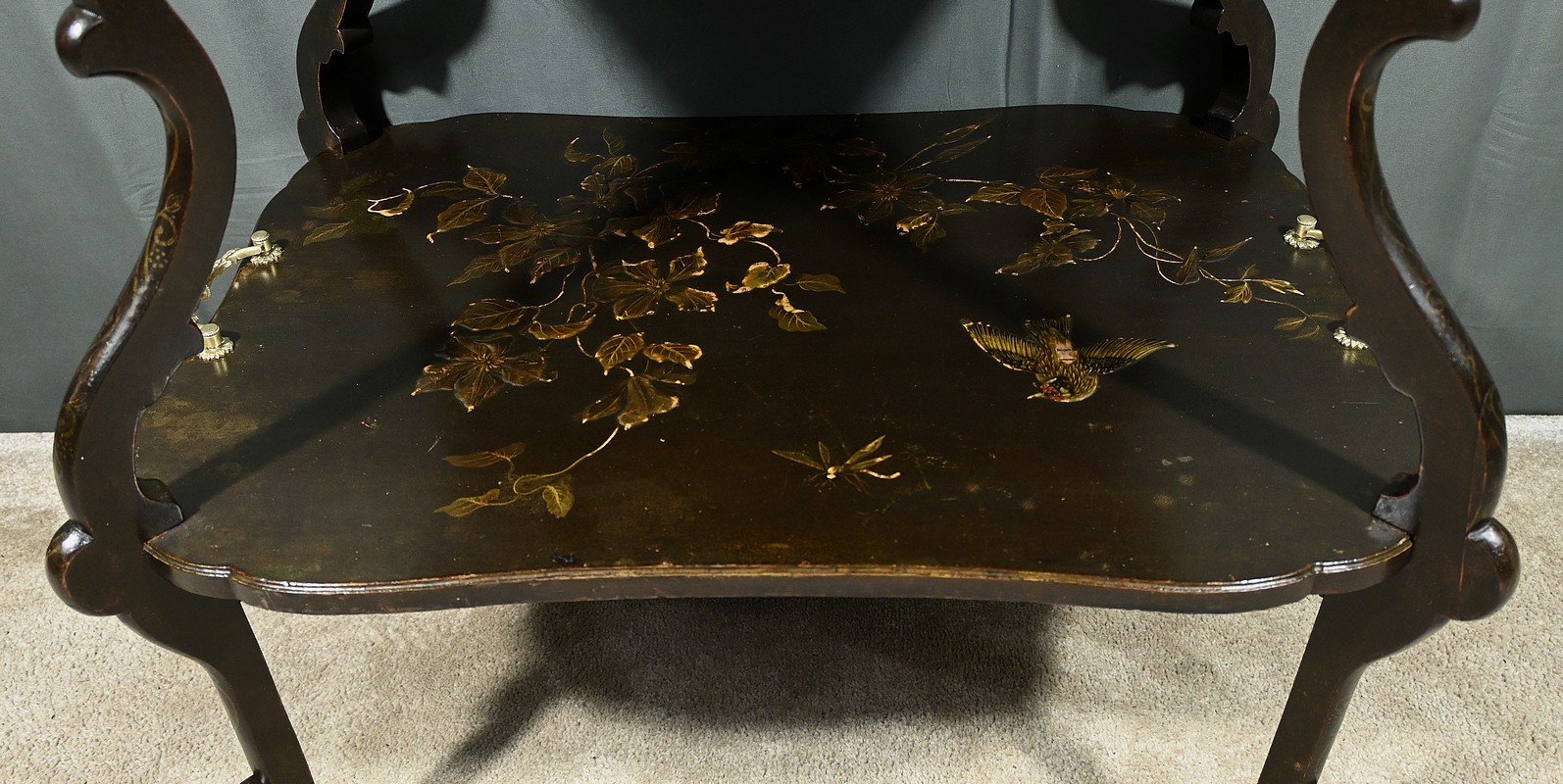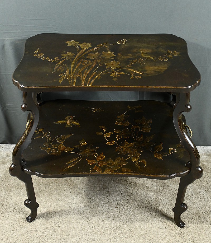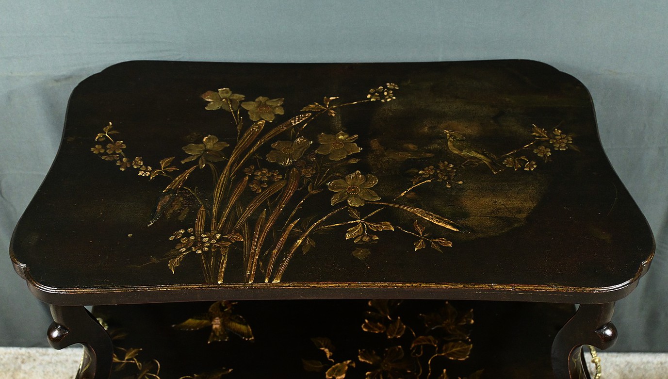 Table d’appoint dotée de deux plateaux mouvementés à décors japonisant en relief d’oiseaux de fleurs et de feuillage. Le grand plateau inférieur est muni de poignées en bronze ciselé. Le piétement en bois laqué est agrémenté d’arabesques dorées suivant les courbes et volutes formant les pieds. Cette table à thé est un pièce raffinée portant les signes de l’âge, parfaite pour une décoration élégante.