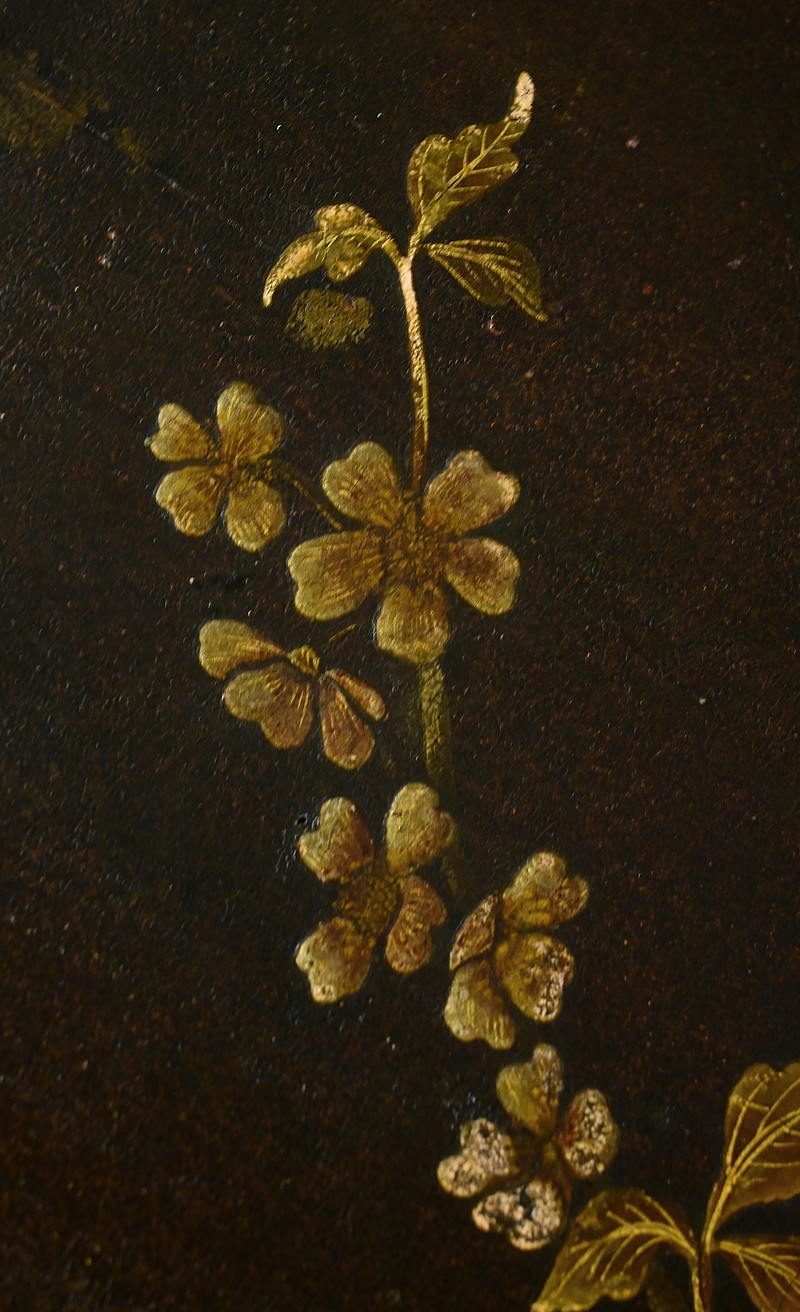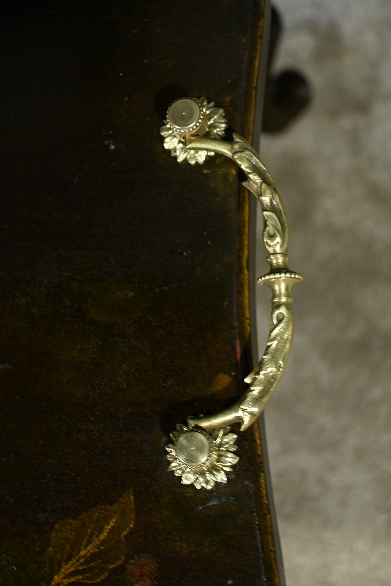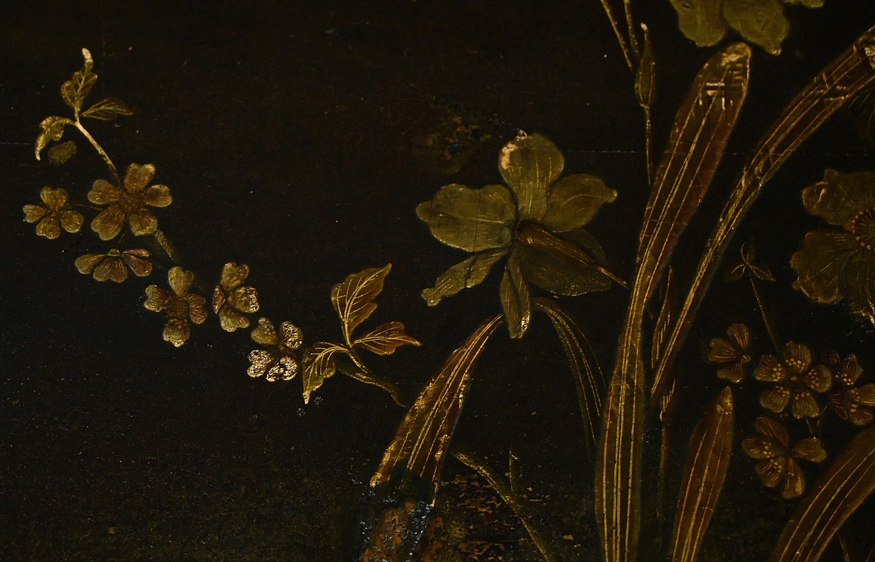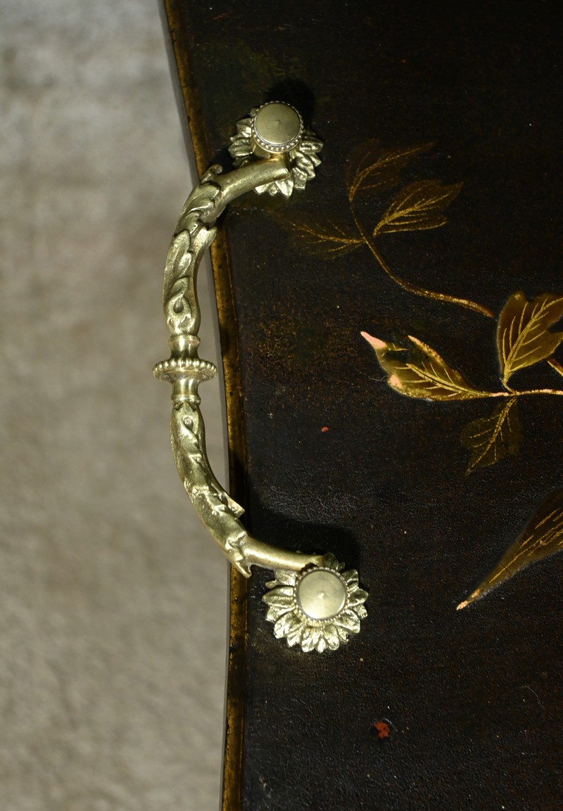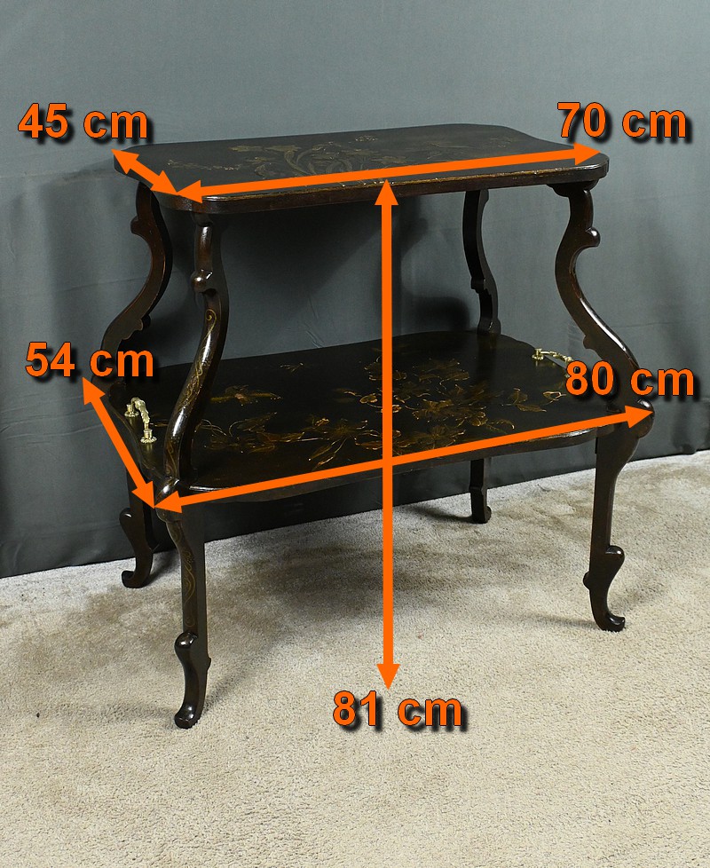 Table d’appoint dotée de deux plateaux mouvementés à décors japonisant en relief d’oiseaux de fleurs et de feuillage. Le grand plateau inférieur est muni de poignées en bronze ciselé. Le piétement en bois laqué est agrémenté d’arabesques dorées suivant les courbes et volutes formant les pieds. Cette table à thé est un pièce raffinée portant les signes de l’âge, parfaite pour une décoration élégante.