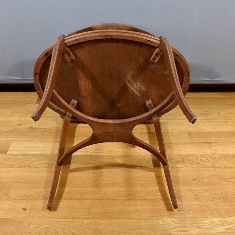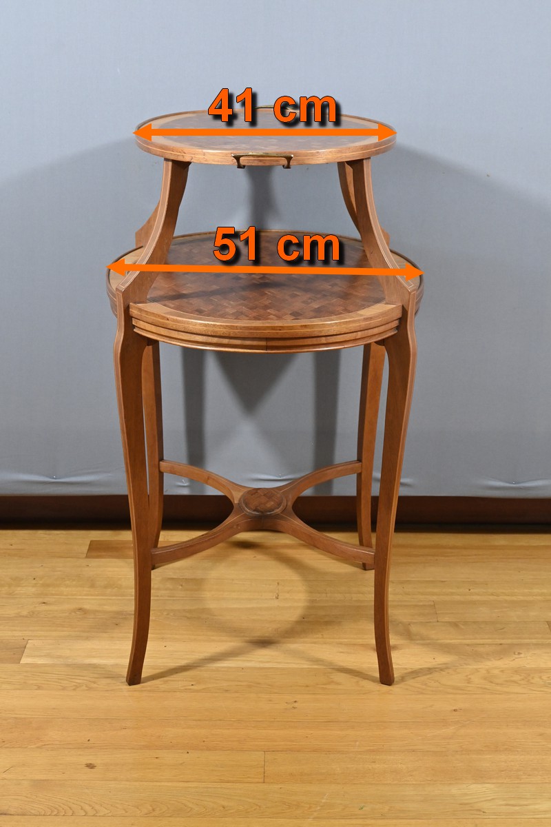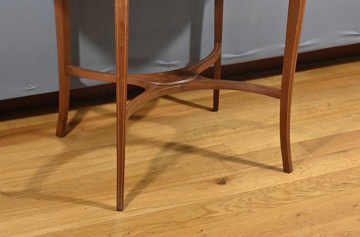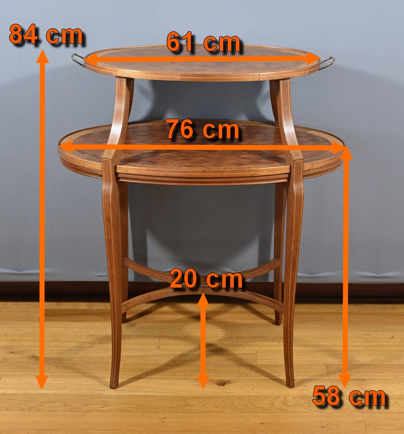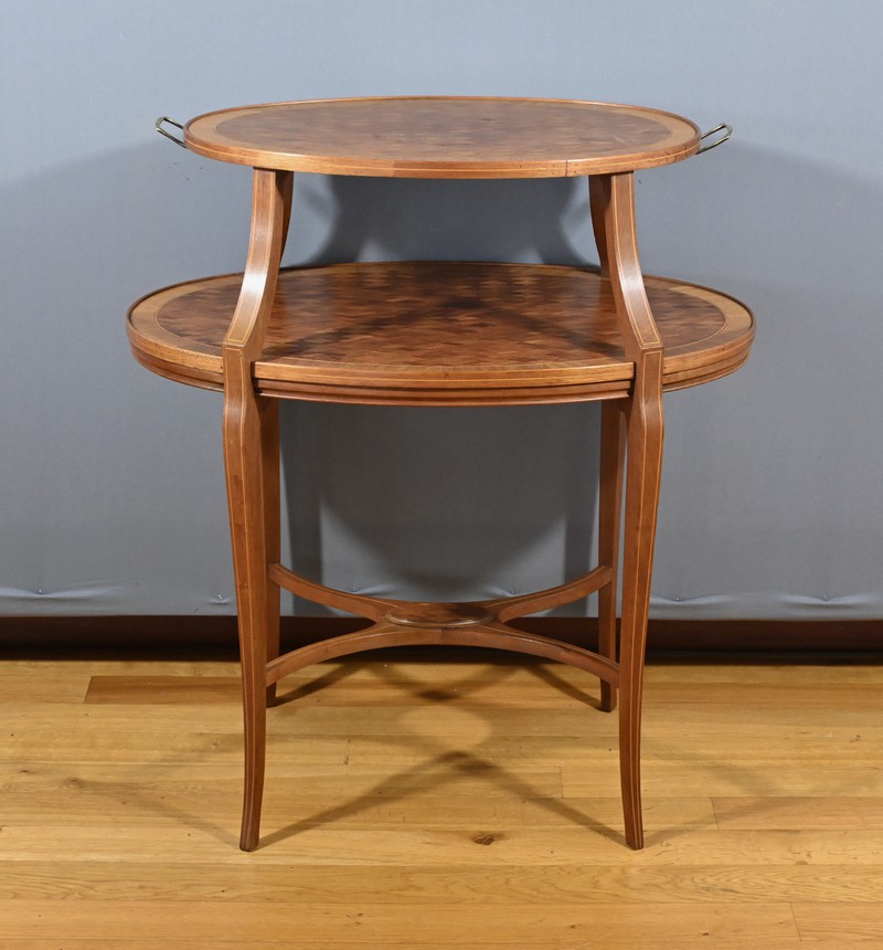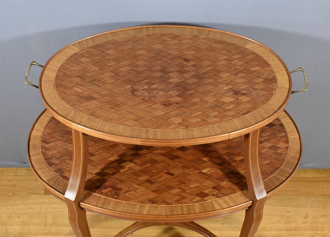 Charmante table de service à deux niveaux en acajou et marqueterie de damier. Les plateaux ovales, de taille différente, sont agrémentés d’une marqueterie de losanges entourés d’un filet de bois clair et de bois de fil. Chaque chant est incrusté d’un filet de bois clair. Le plateau supérieur est doté de poignées en bronze et repose sur quatre pieds concaves en partie haute. Le deuxième plateau est encastré dans les pieds. Ces derniers sont soulignés de filets de bois clair et s’affinent vers le bas. Cette desserte raffinée possède quatre pieds finement galbés, réunis par une tablette d’entrejambre en forme de X.
