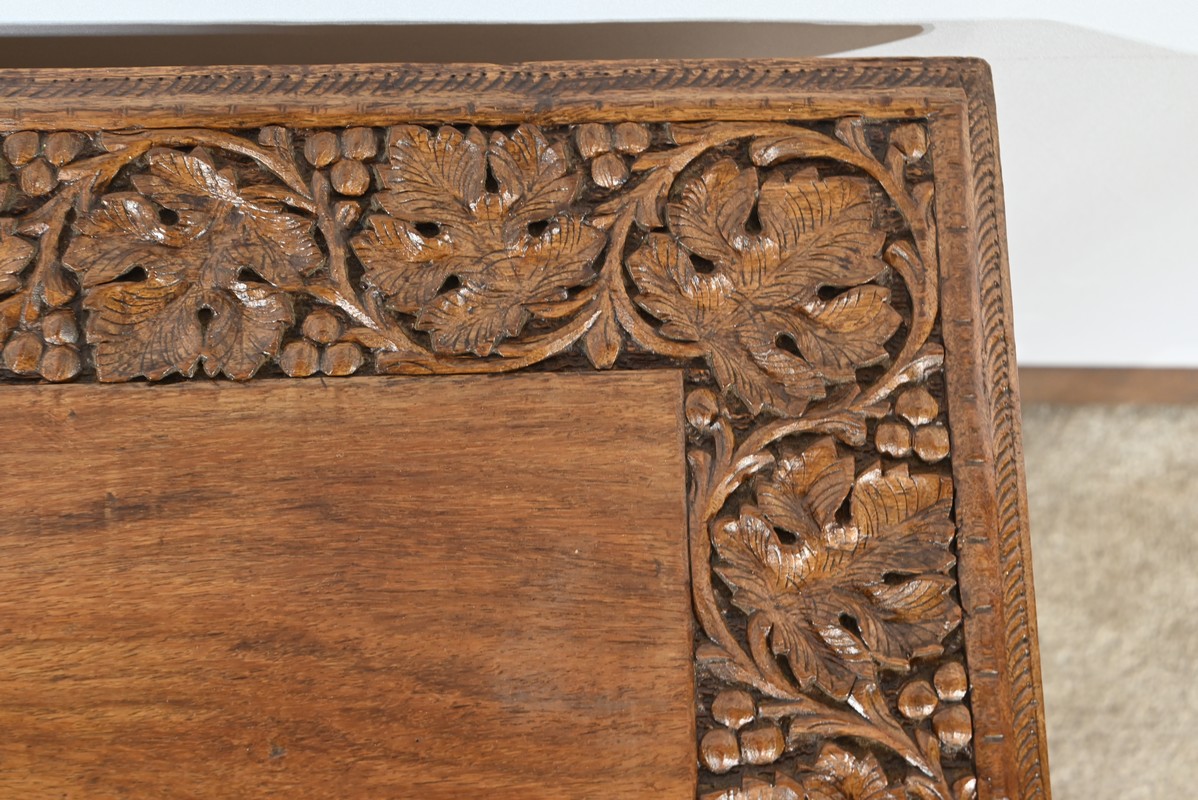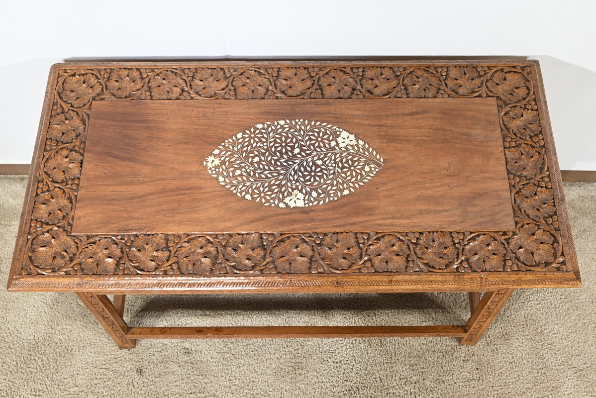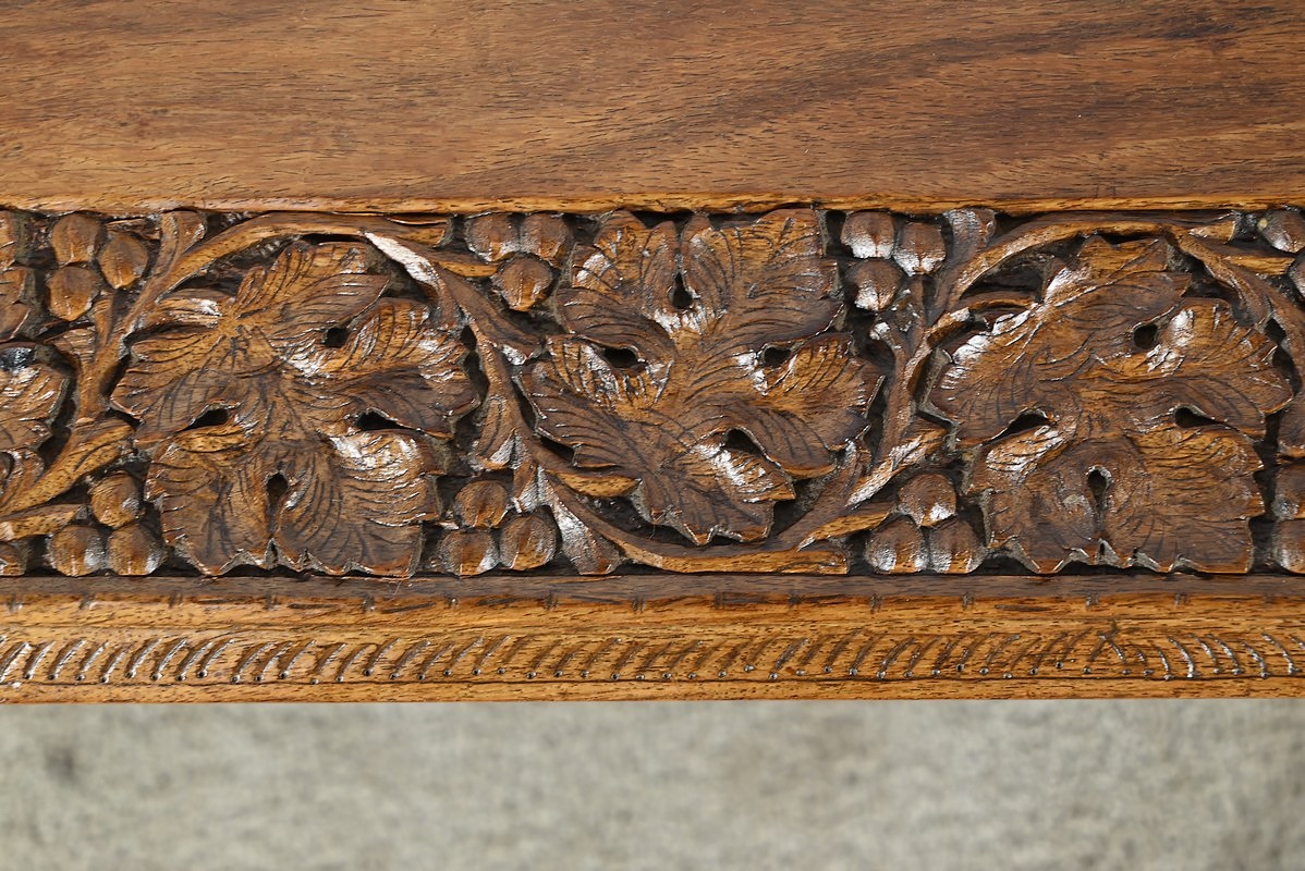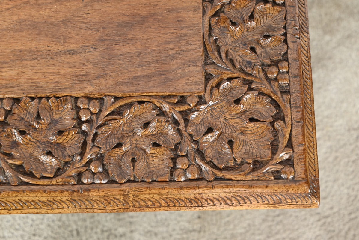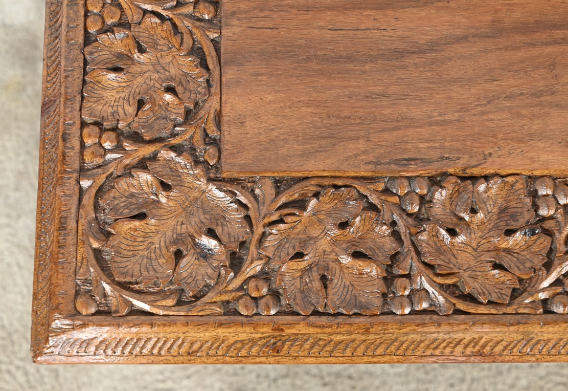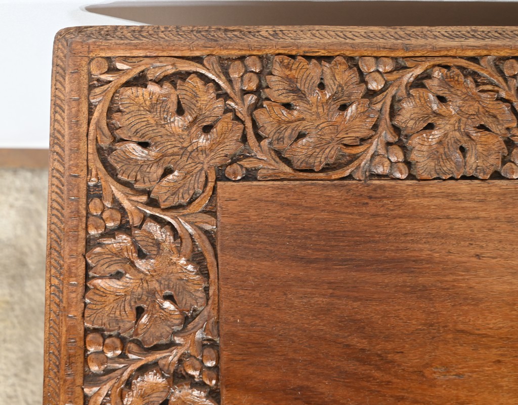 Cette table orientale en bois exotique présente un dessus amovible d’une seule planche, avec cadre généreusement sculpté, à motifs de feuilles de vigne entremêlées de rinceaux et de raisin.