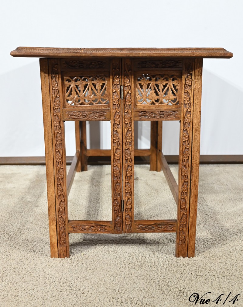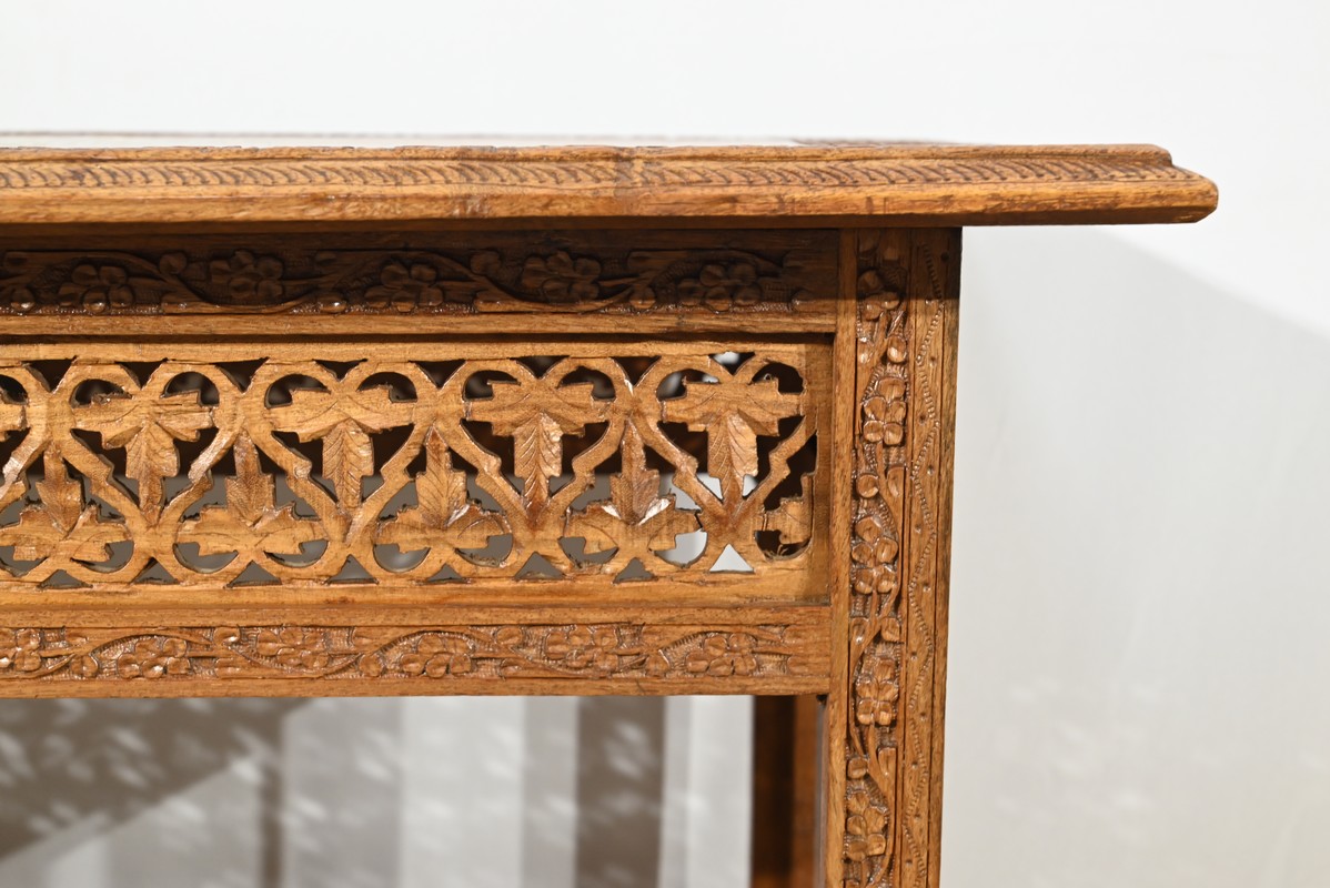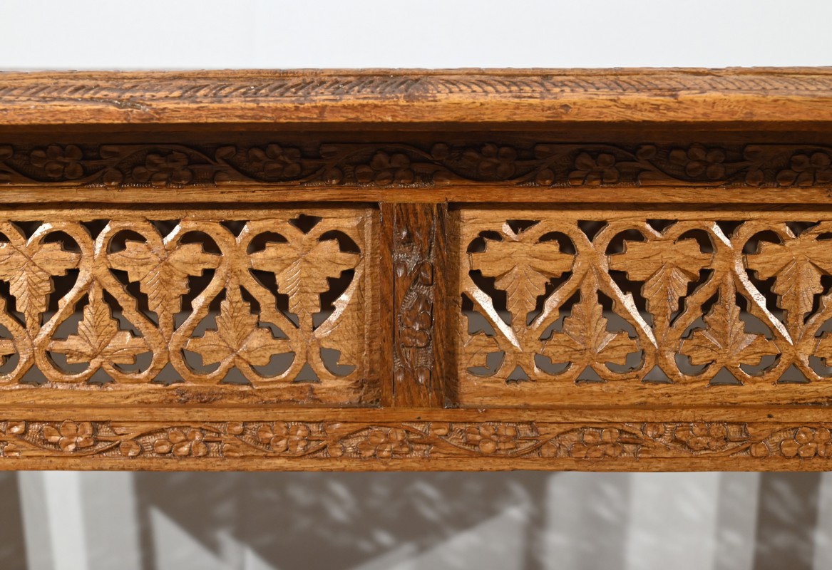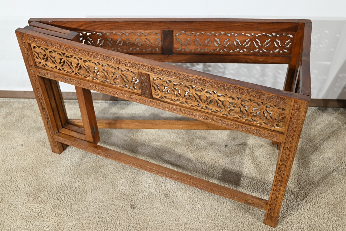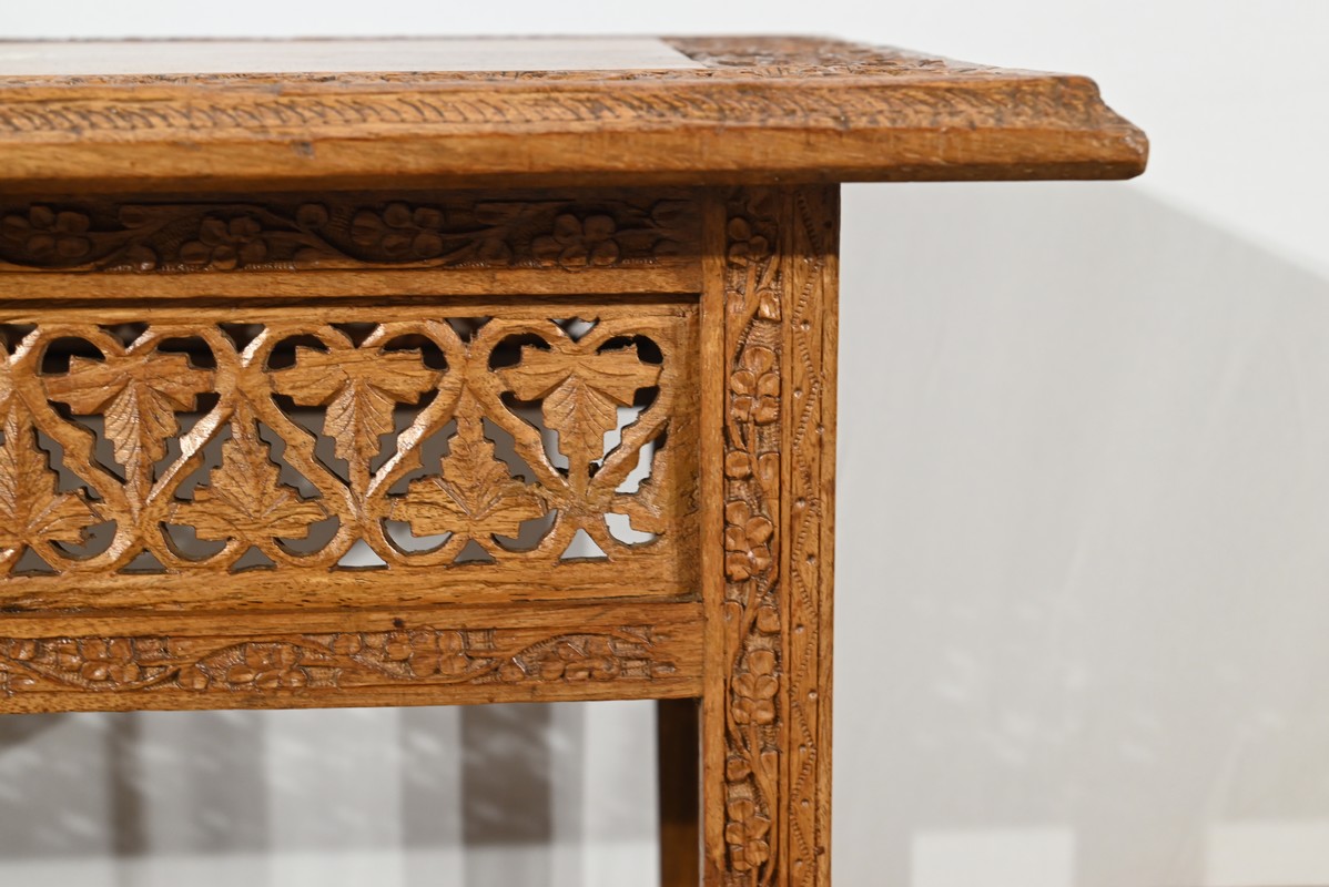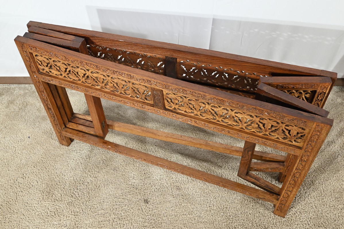 Cette table orientale en bois exotique présente un dessus amovible d’une seule planche, avec cadre généreusement sculpté, à motifs de feuilles de vigne entremêlées de rinceaux et de raisin.