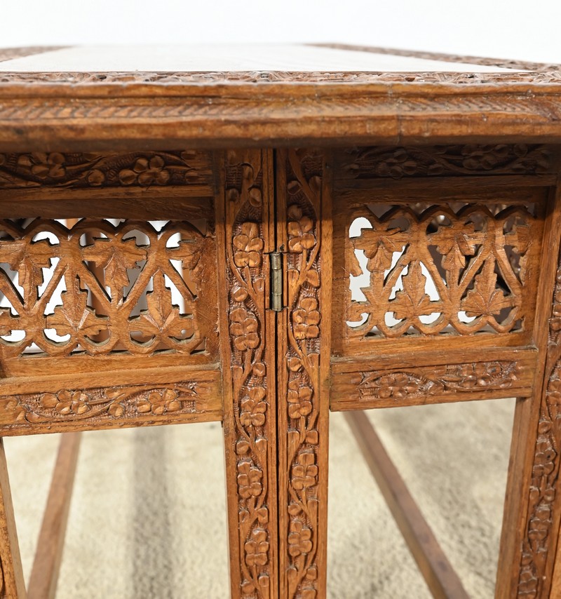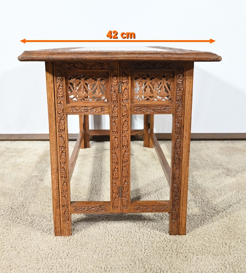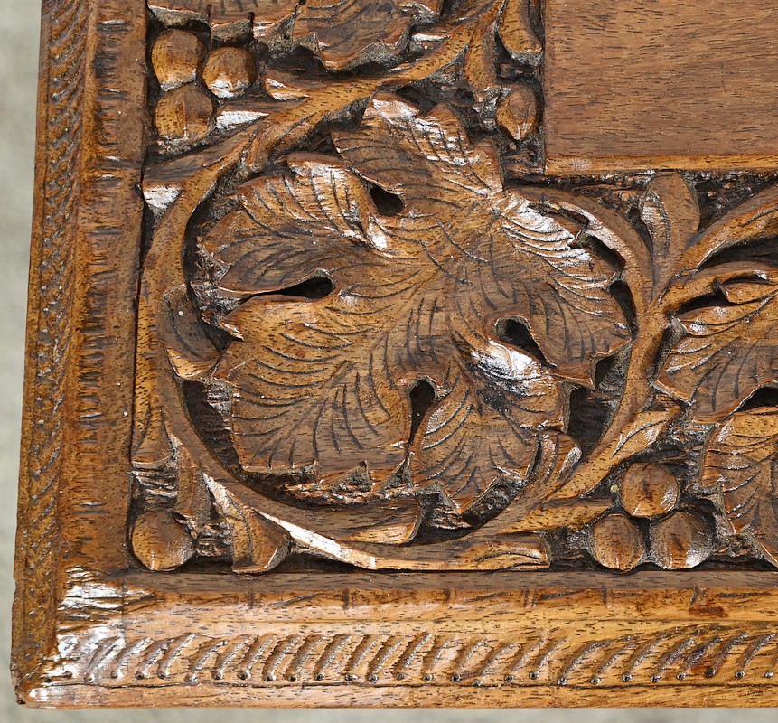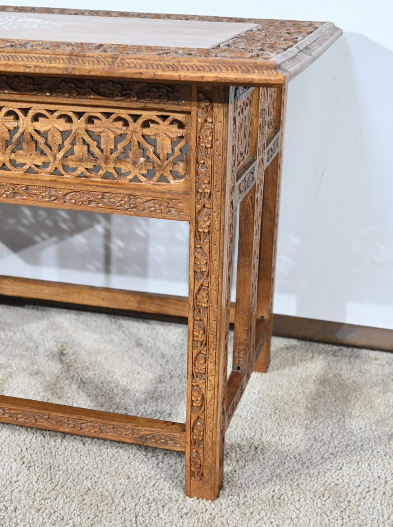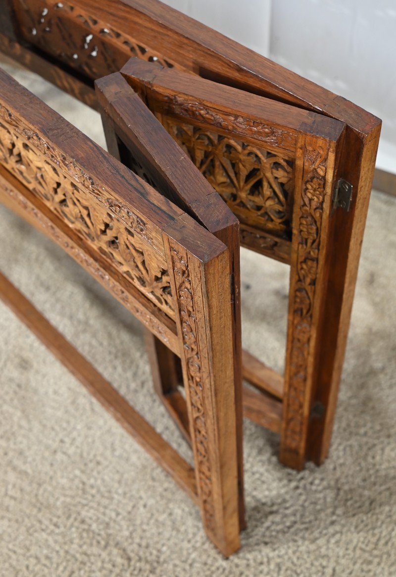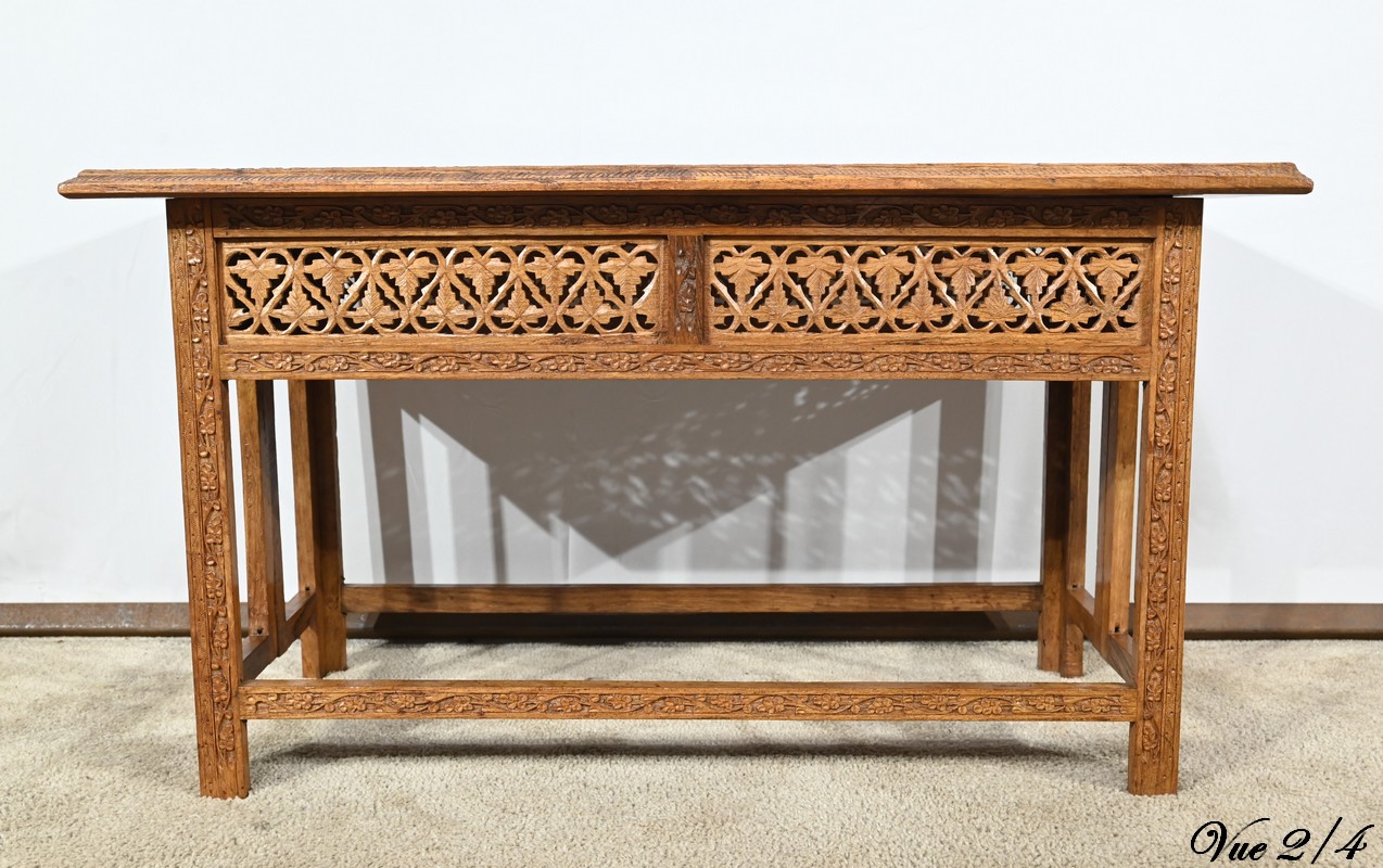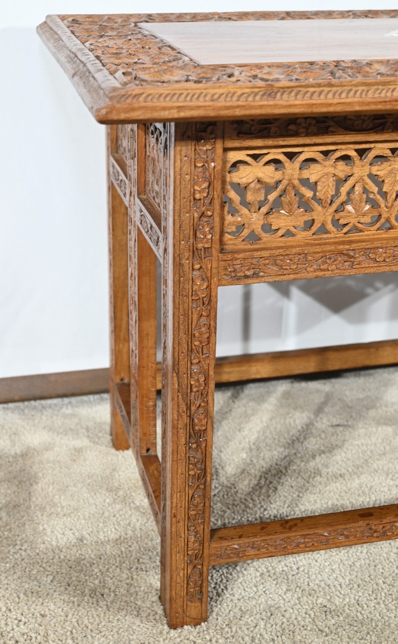 Cette table orientale en bois exotique présente un dessus amovible d’une seule planche, avec cadre généreusement sculpté, à motifs de feuilles de vigne entremêlées de rinceaux et de raisin.