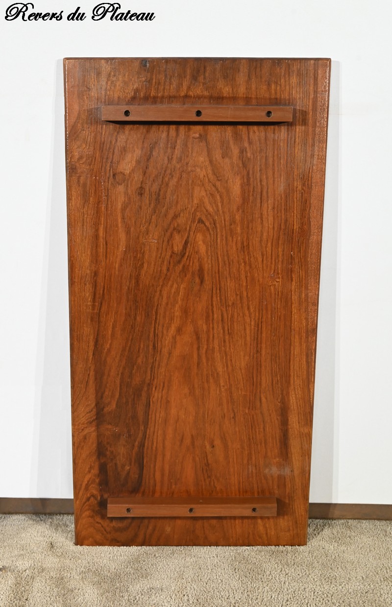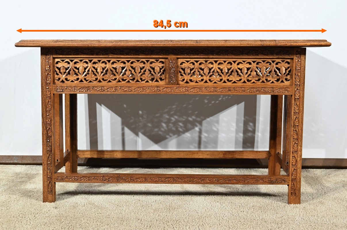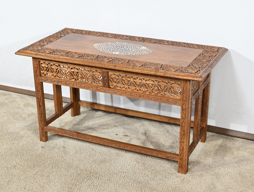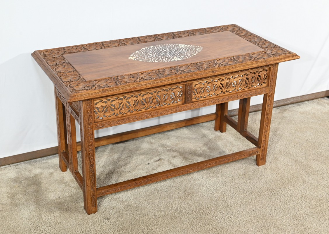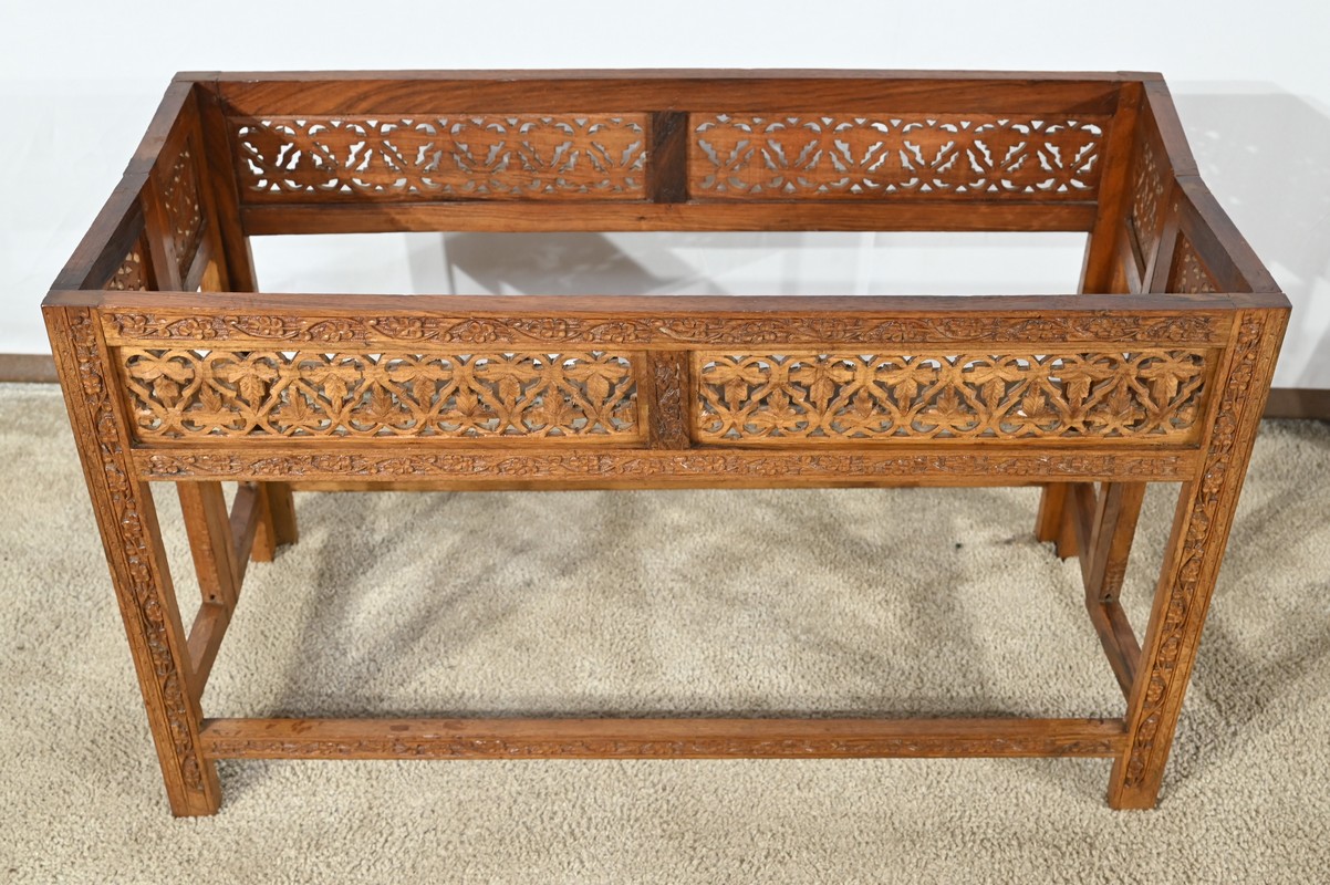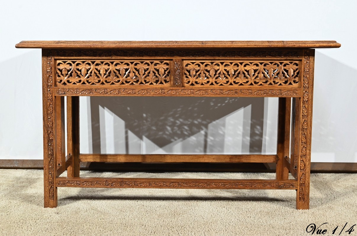 Cette table orientale en bois exotique présente un dessus amovible d’une seule planche, avec cadre généreusement sculpté, à motifs de feuilles de vigne entremêlées de rinceaux et de raisin.