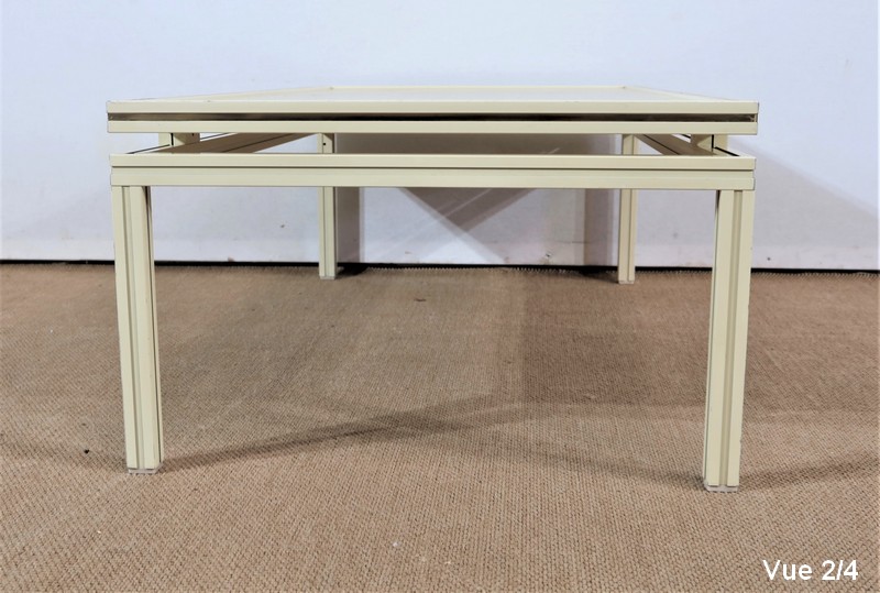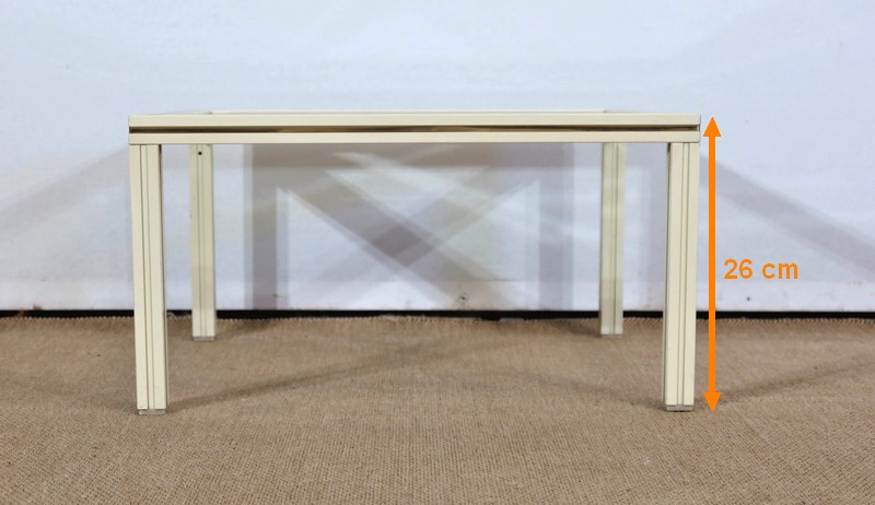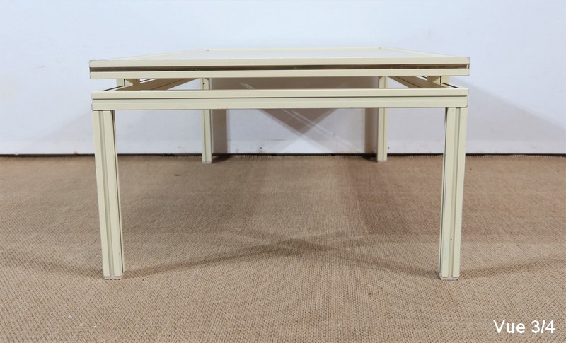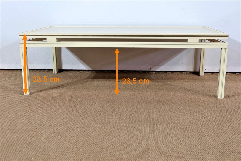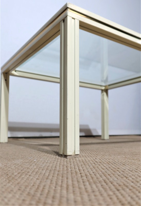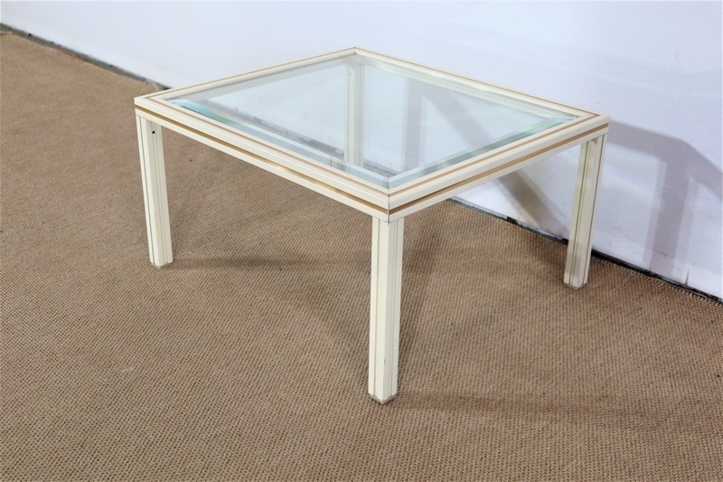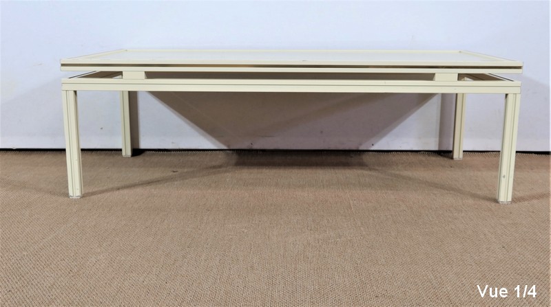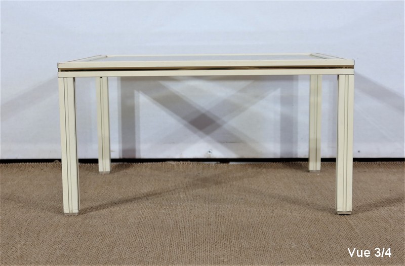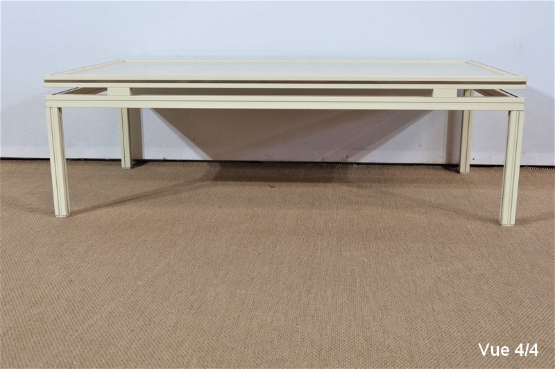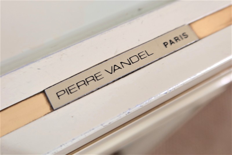 Les structures en métal laqué de couleur écru sont assemblées à coupe d’onglet et incrustées au centre et sur les flancs d’une bande laitonnée légèrement en retrait portant la signature « Pierre Vandel-Paris ». Le dessus de la table basses est protégé par une vitre composée de deux feuilles de verre réunies qui emprisonnent un revêtement en son centre. Cet élément prisonnier laisse apparaitre par transparence la teinte écrue du meuble.