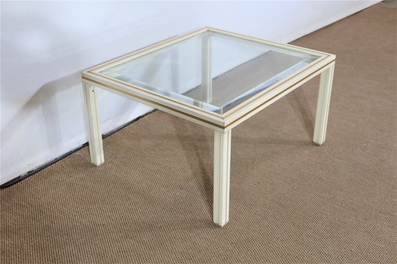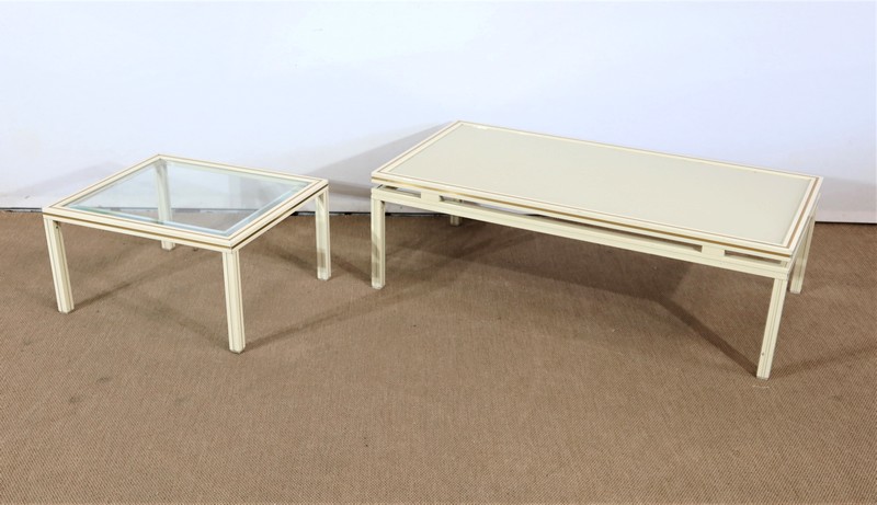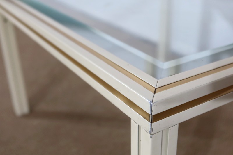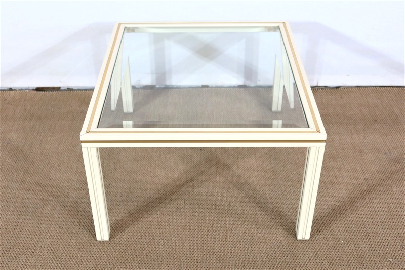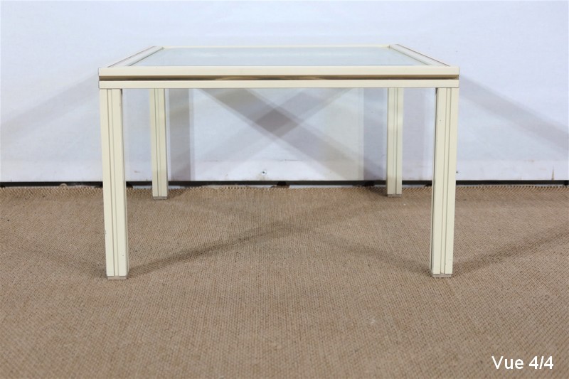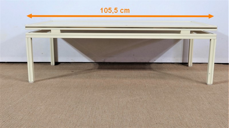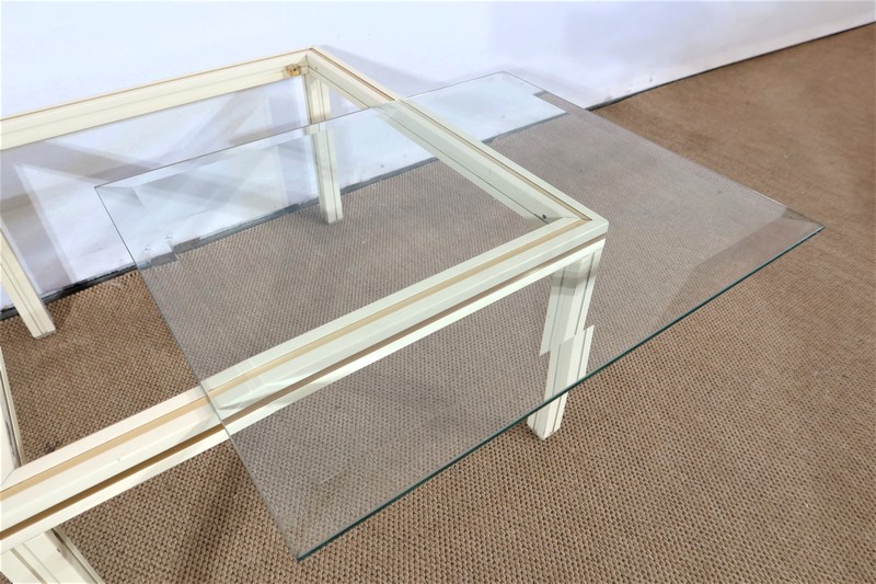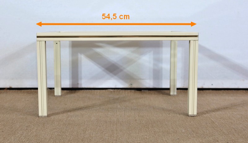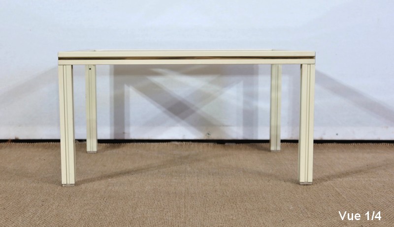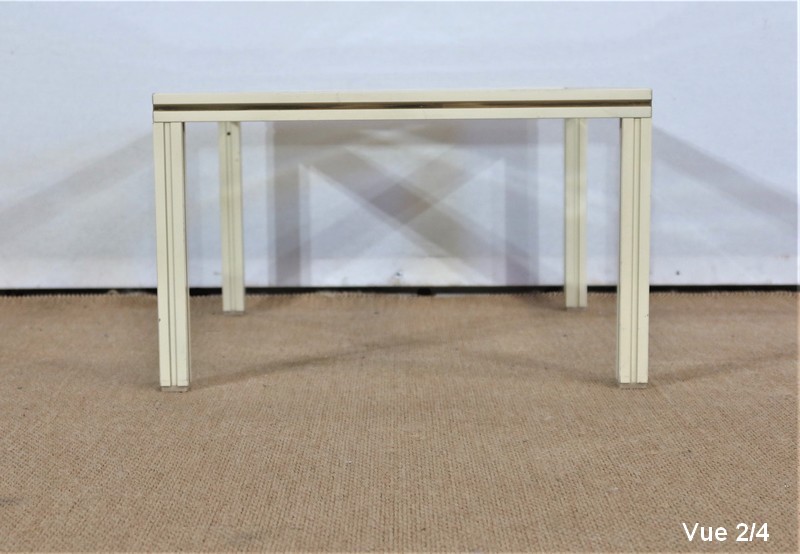 Les structures en métal laqué de couleur écru sont assemblées à coupe d’onglet et incrustées au centre et sur les flancs d’une bande laitonnée légèrement en retrait portant la signature « Pierre Vandel-Paris ». Le dessus de la table basses est protégé par une vitre composée de deux feuilles de verre réunies qui emprisonnent un revêtement en son centre. Cet élément prisonnier laisse apparaitre par transparence la teinte écrue du meuble.
