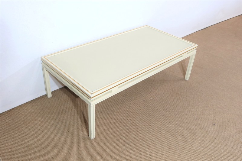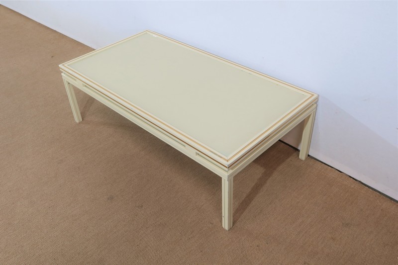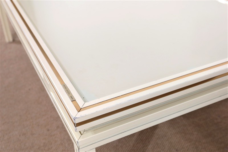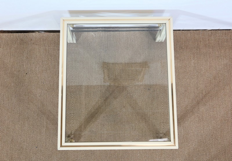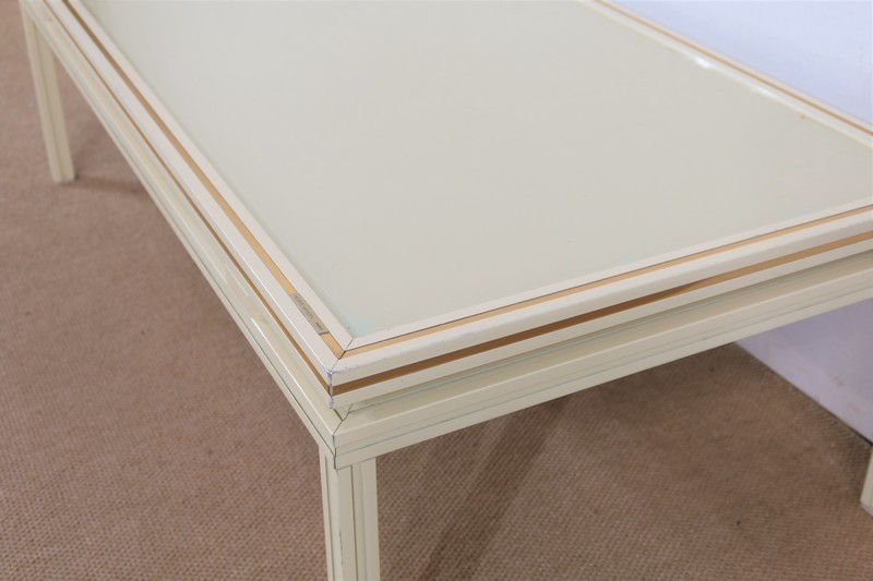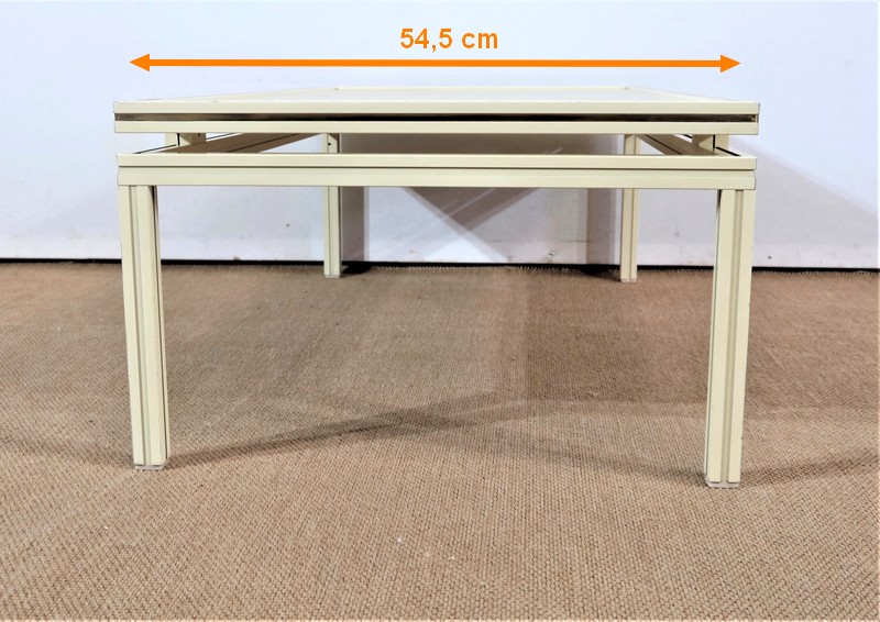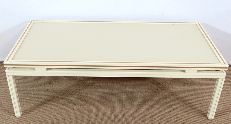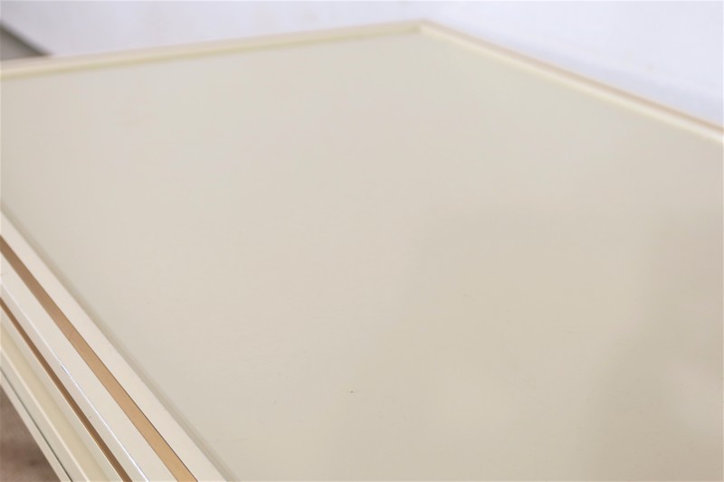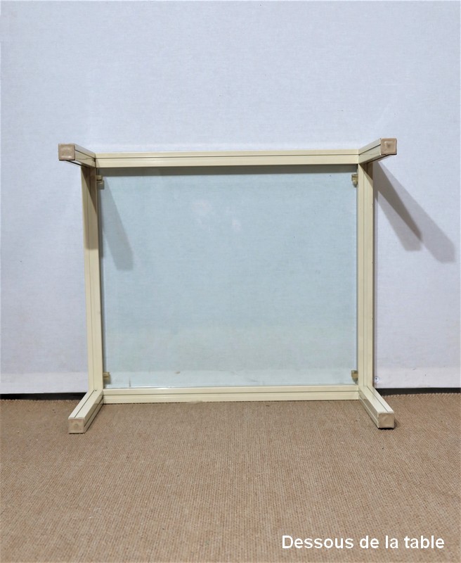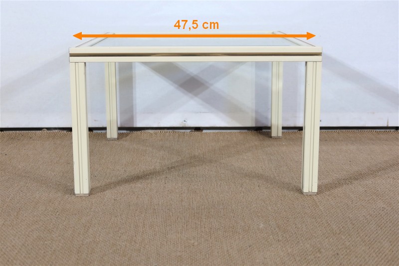 Les structures en métal laqué de couleur écru sont assemblées à coupe d’onglet et incrustées au centre et sur les flancs d’une bande laitonnée légèrement en retrait portant la signature « Pierre Vandel-Paris ». Le dessus de la table basses est protégé par une vitre composée de deux feuilles de verre réunies qui emprisonnent un revêtement en son centre. Cet élément prisonnier laisse apparaitre par transparence la teinte écrue du meuble.