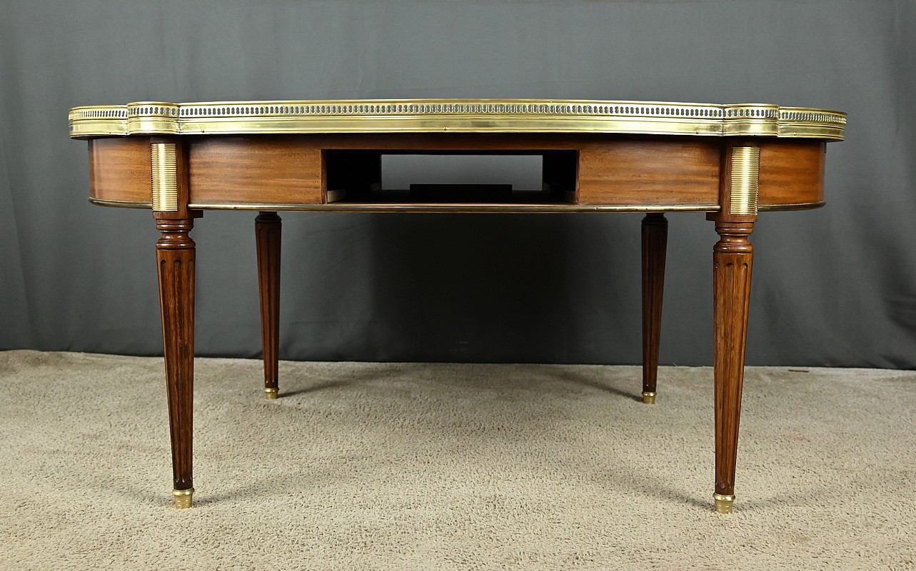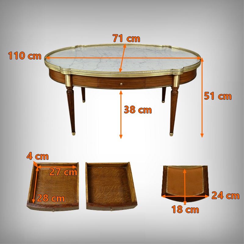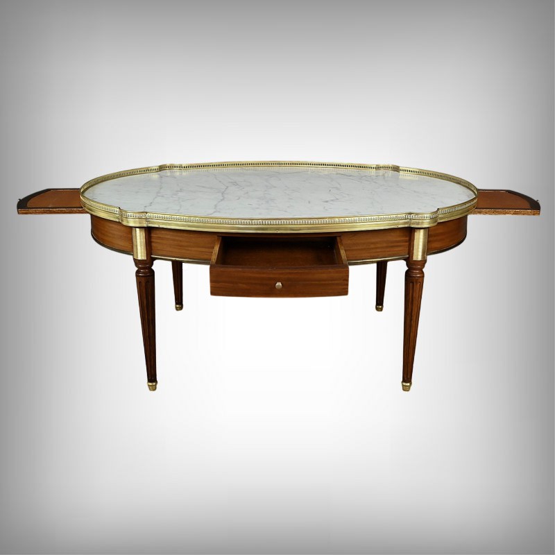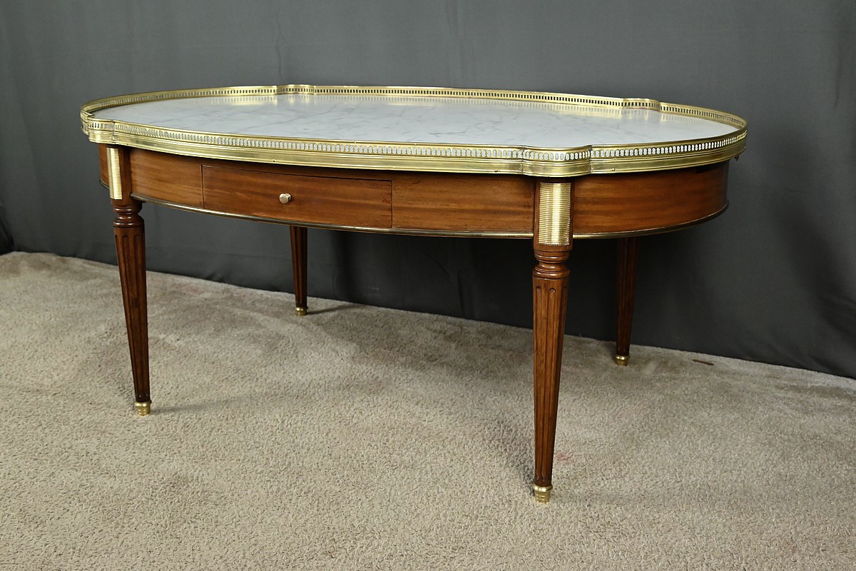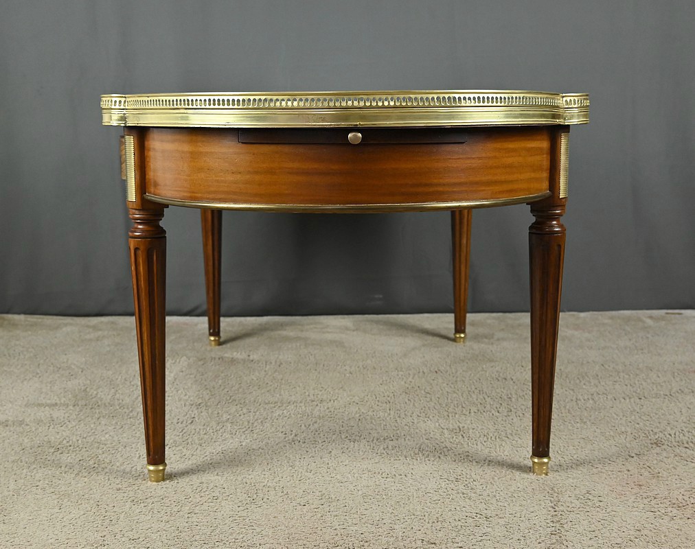 Charmante table basse de style Louis XVI datant du début du XXe siècle. Cette table de forme ovale bénéficie d’un placage d’acajou en ceinture. Elle ouvre par un tiroir central à l’avant et un autre à l’arrière. Elle est également munie de deux tirettes latérales, toutes dotées de boutons de tirage en laiton. Ces dernières sont garnies d’un cuir fauve souligné d’une vignette dorée.