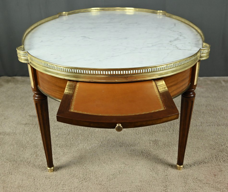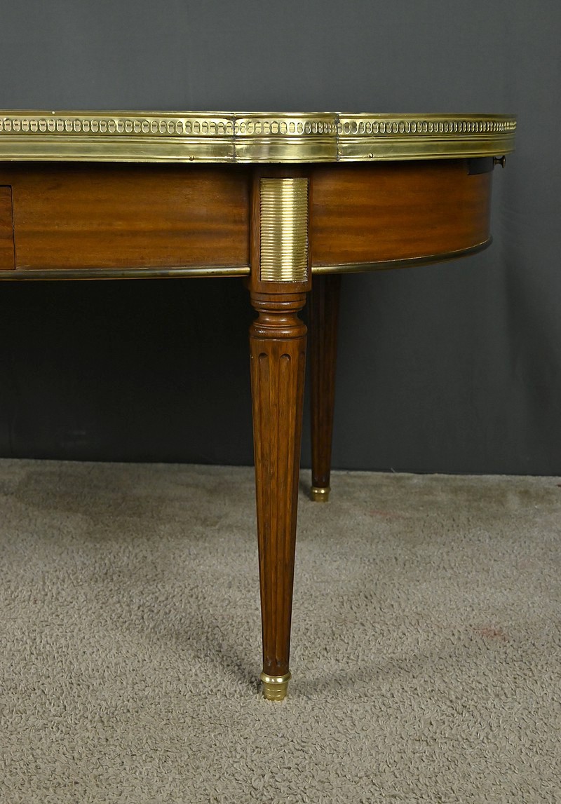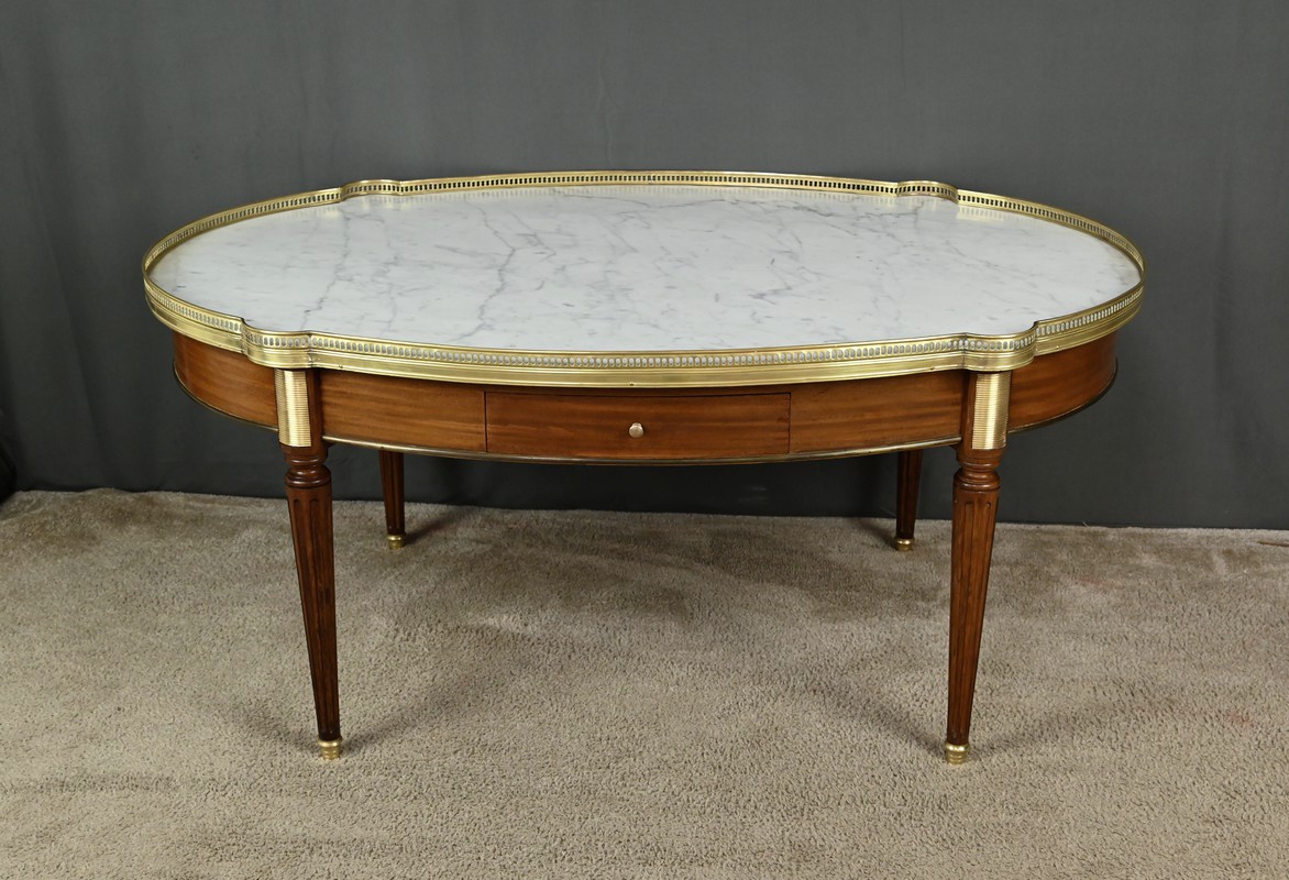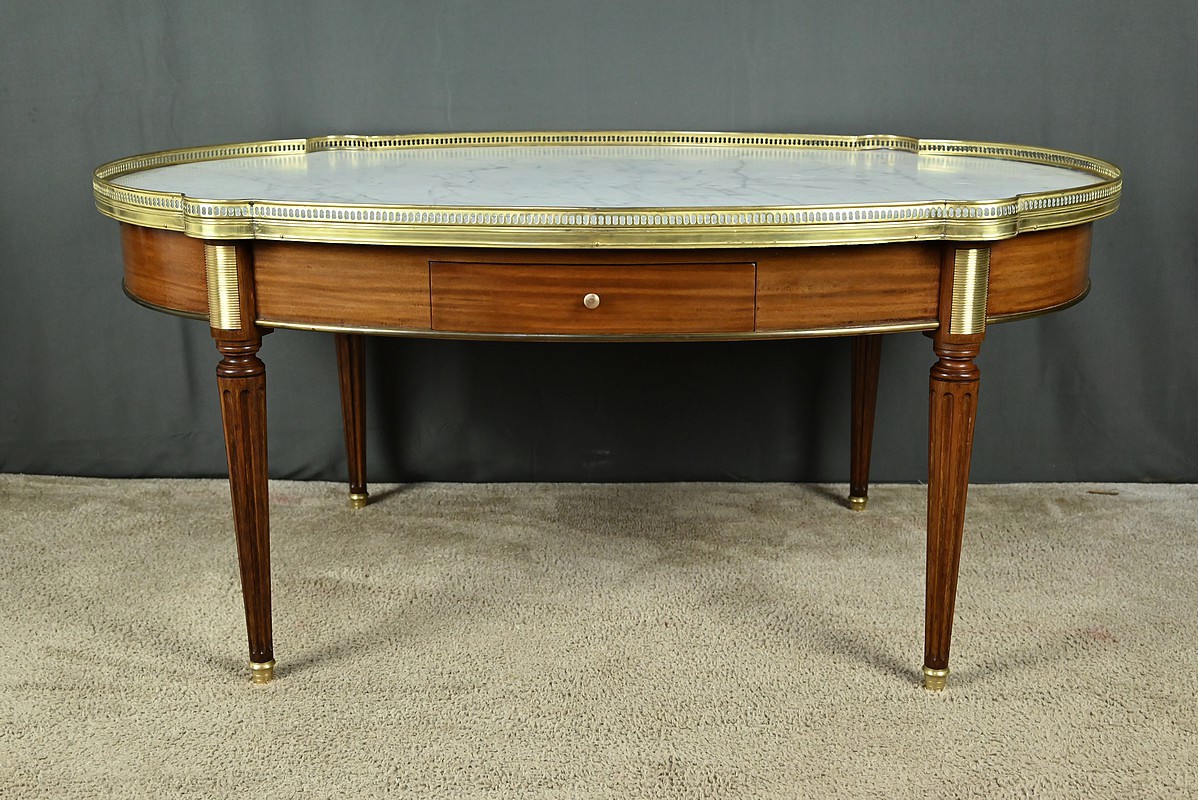 Charmante table basse de style Louis XVI datant du début du XXe siècle. Cette table de forme ovale bénéficie d’un placage d’acajou en ceinture. Elle ouvre par un tiroir central à l’avant et un autre à l’arrière. Elle est également munie de deux tirettes latérales, toutes dotées de boutons de tirage en laiton. Ces dernières sont garnies d’un cuir fauve souligné d’une vignette dorée.