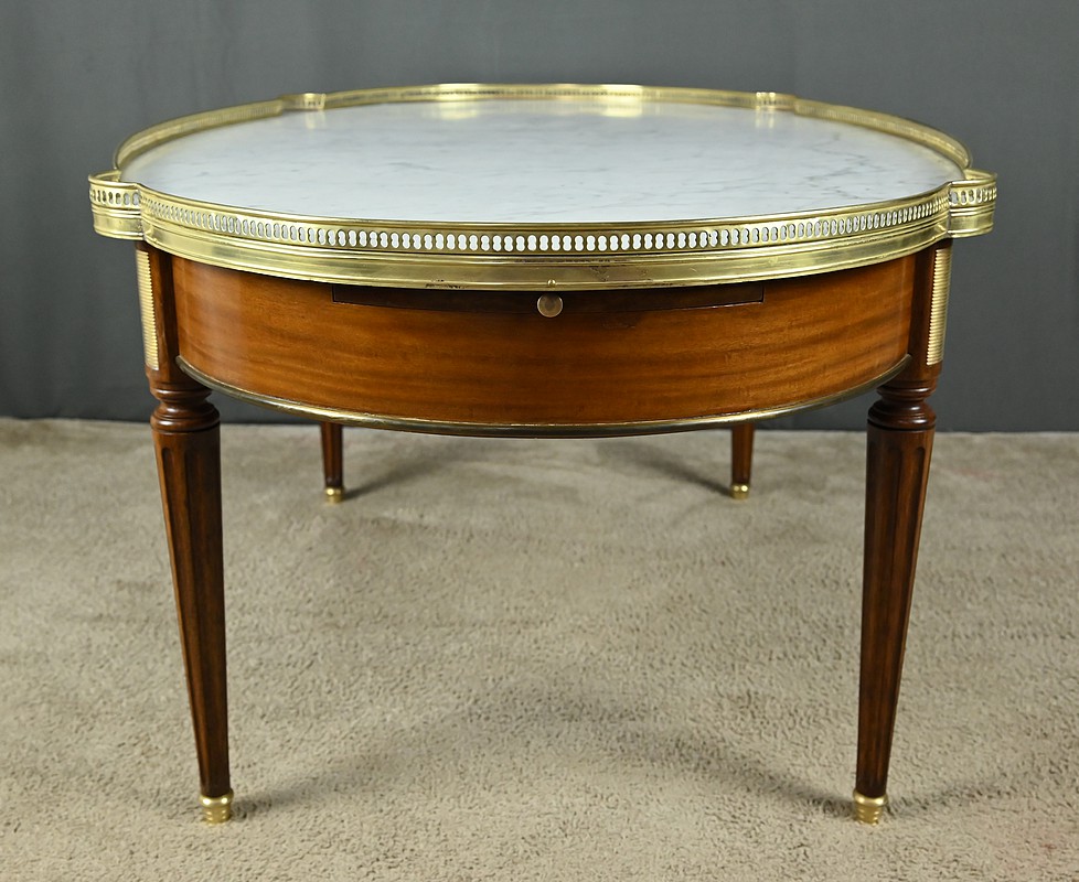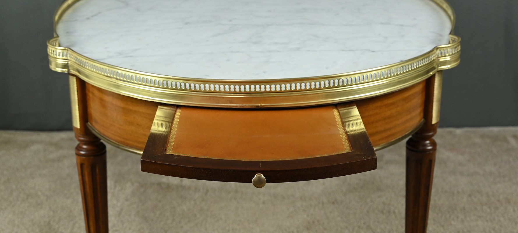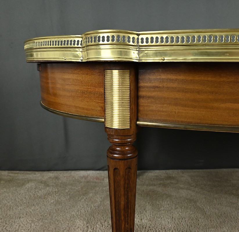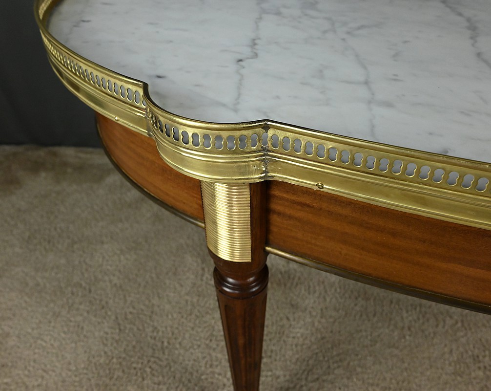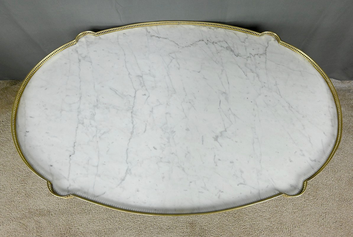 Le plateau à ressauts est en marbre blanc de Carrare légèrement veiné de gris. Il est ceint d’une élégante galerie ajourée en laiton doré.