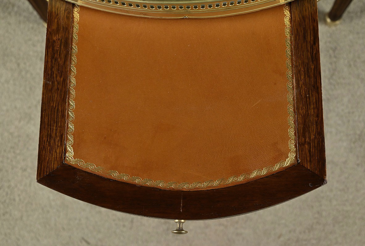 Le piètement se compose de quatre pieds fuselés et cannelés, ornés de plaques striées en laiton en partie supérieure et de sabots en partie basse.