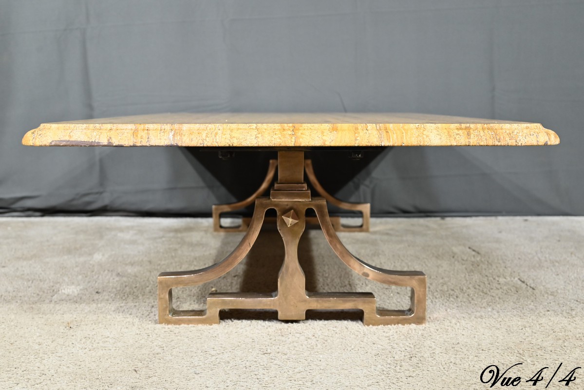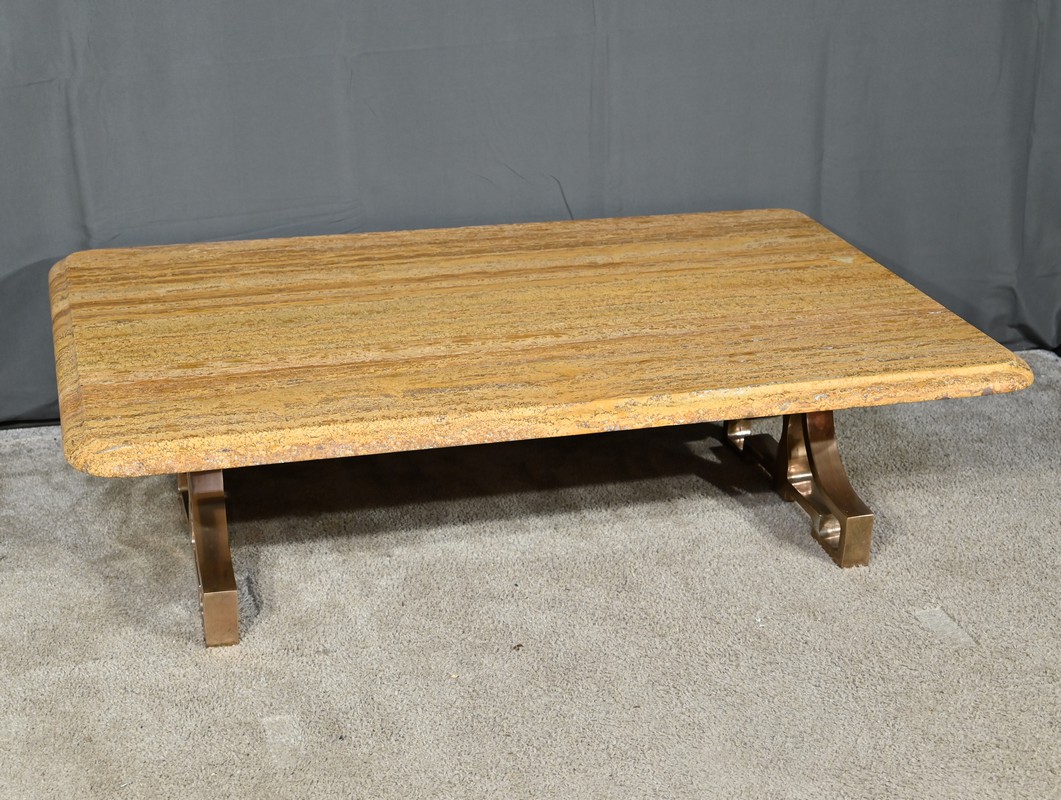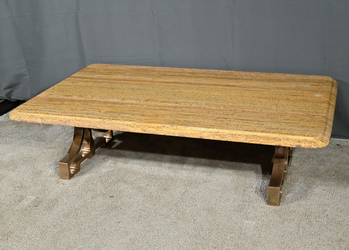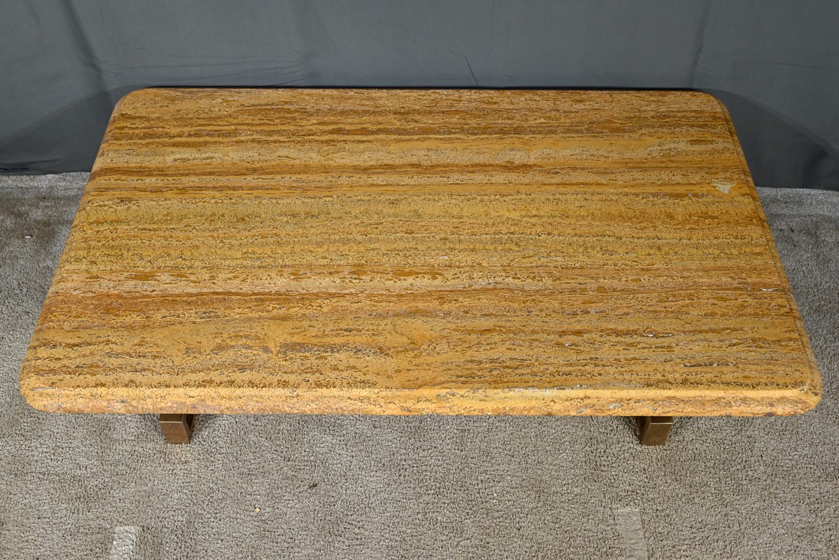 Cette table basse se compose d’un épais plateau de travertin jaune à bec de corbin.