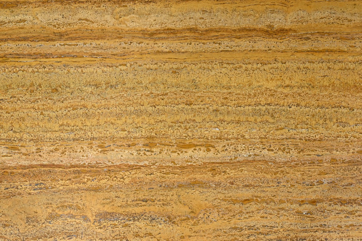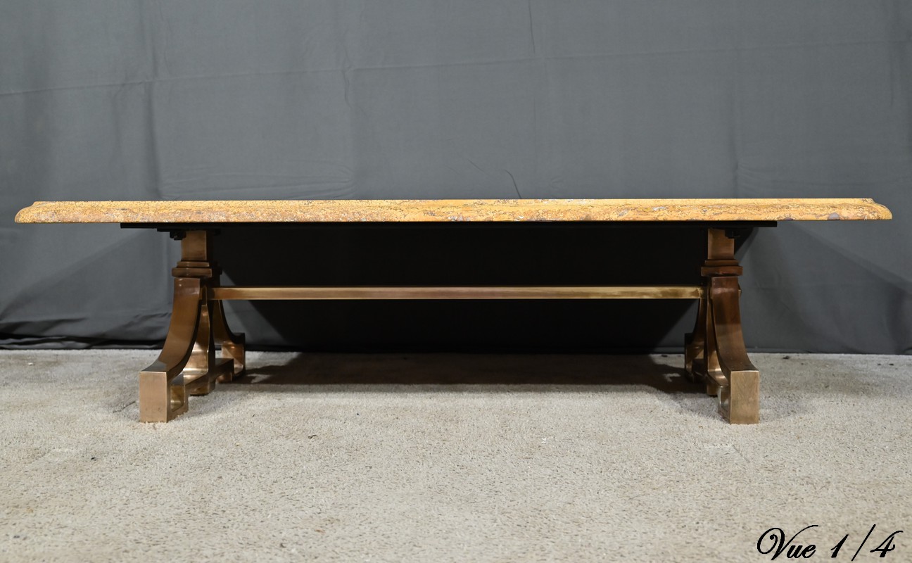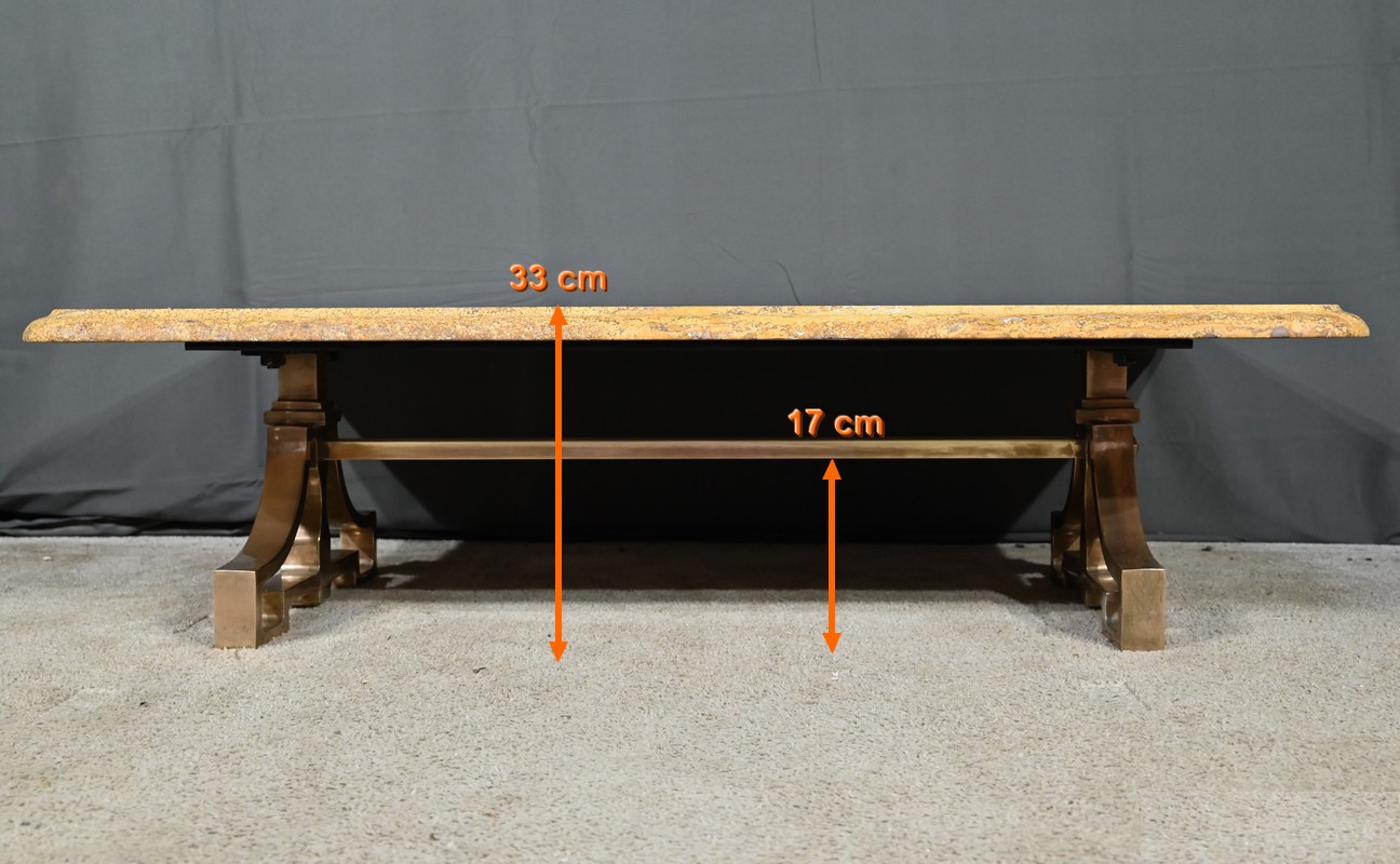 Cette table basse se compose d’un épais plateau de travertin jaune à bec de corbin.