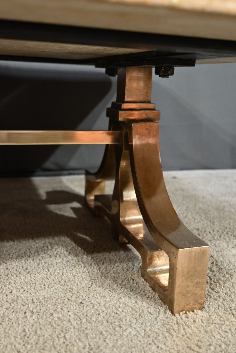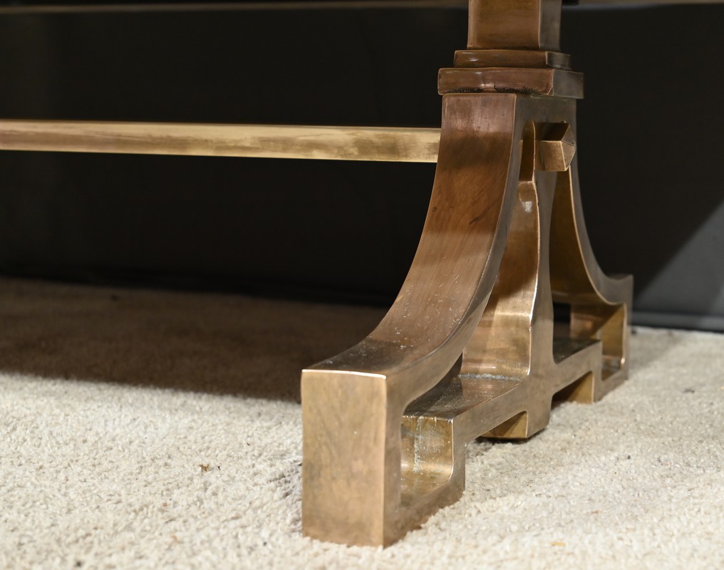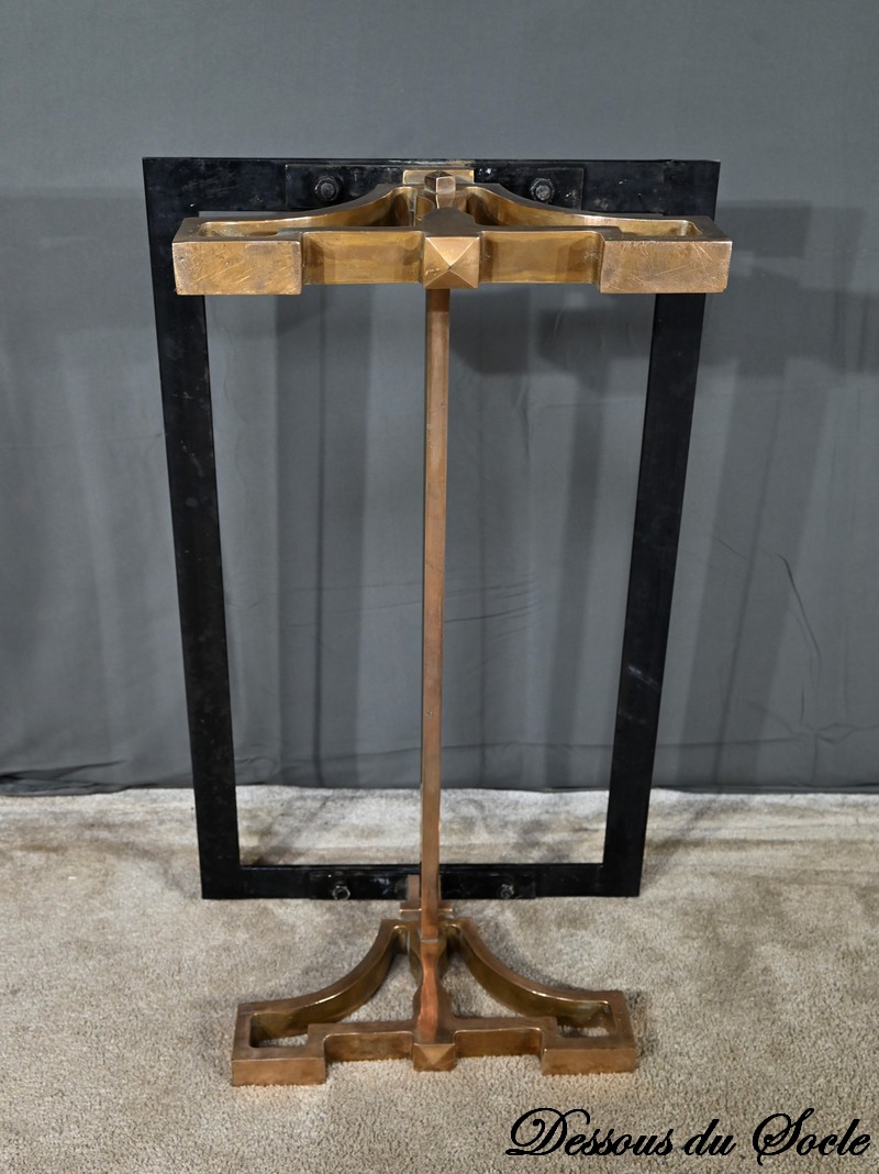 Celui-ci repose sur un cadre en fer forgé se profilant sur un piétement en laiton massif avec barre d’entretoise.