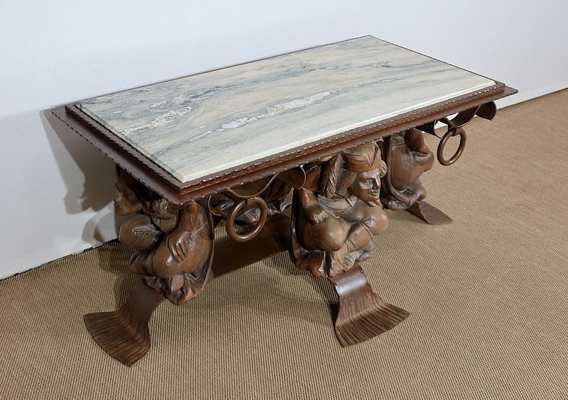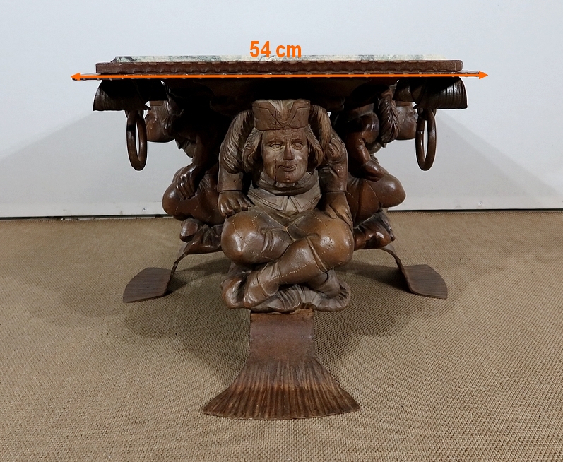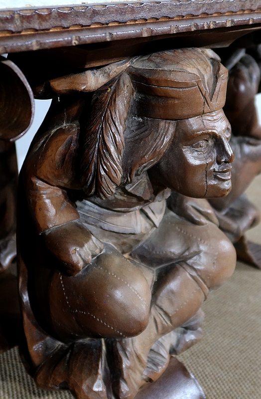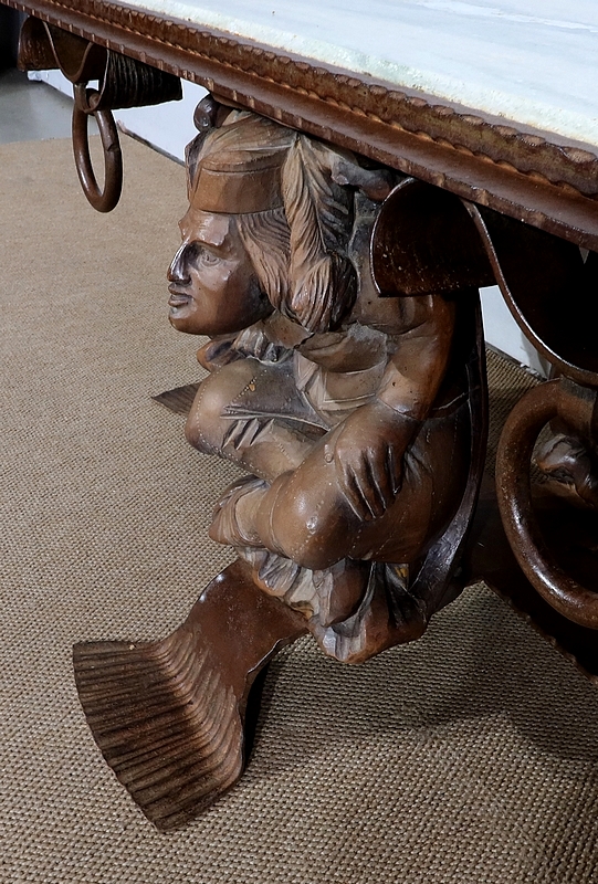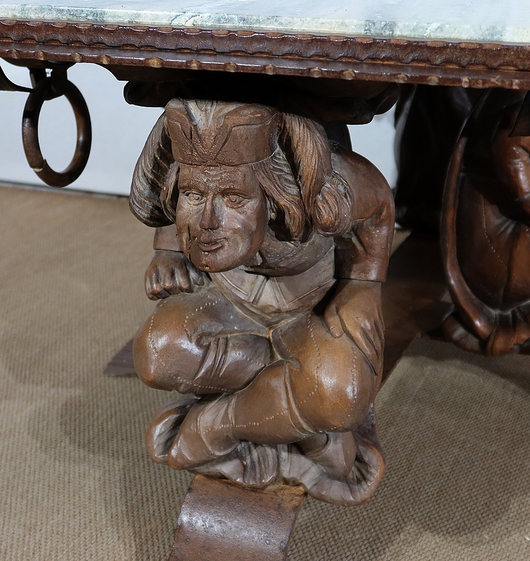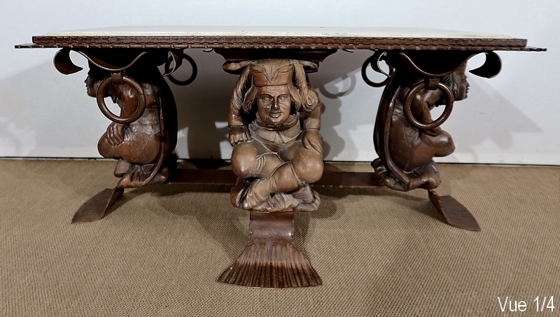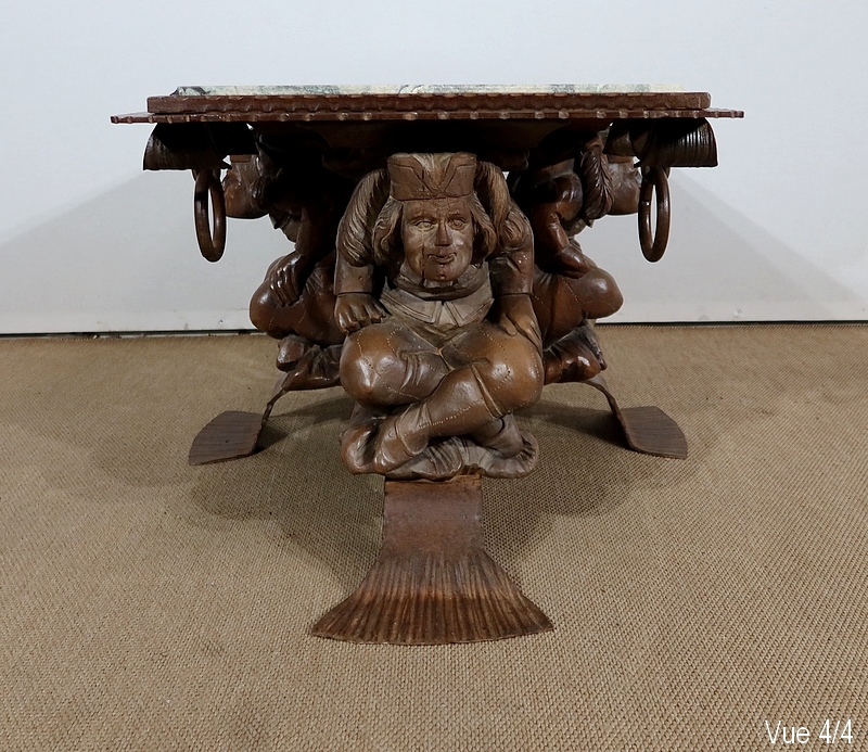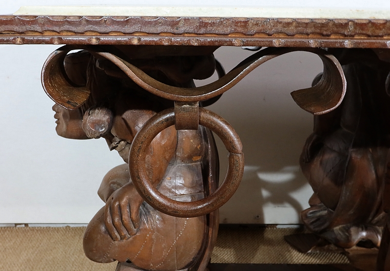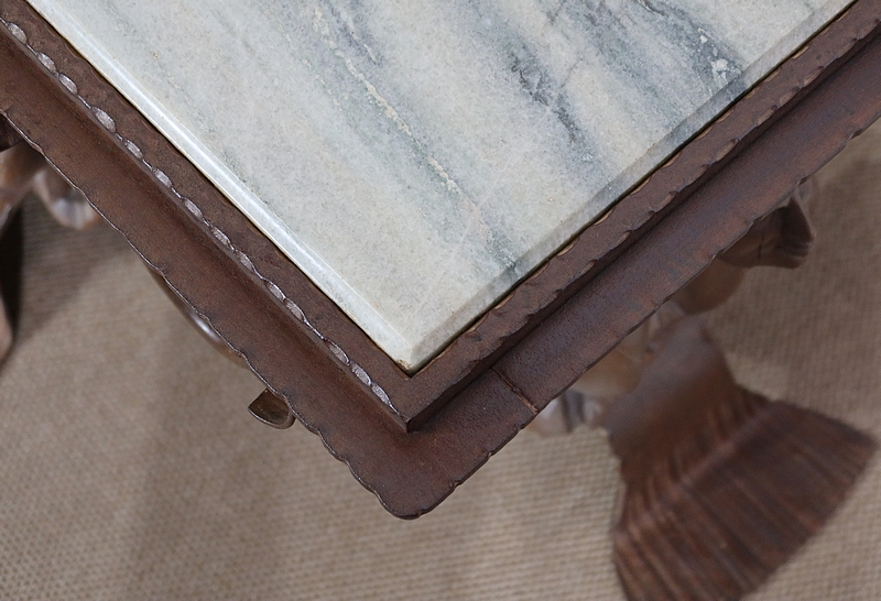 Chaque pied est décoré de grands personnages intrigants soutenant la table de leur dos. Souriants, ils se tiennent assis les jambes croisées et sont habillés d’un costume traditionnel. De chaque côté, nous retrouvons de larges volutes en fer accompagnées d’un anneau rond tombant.