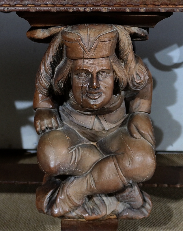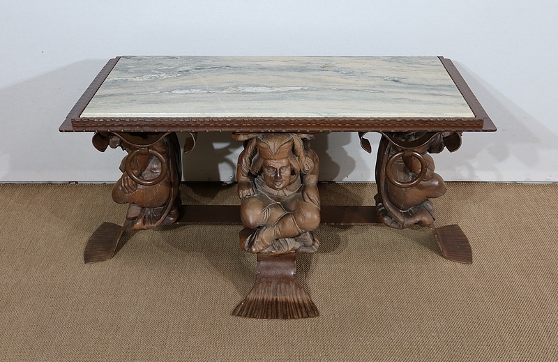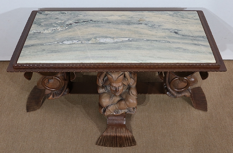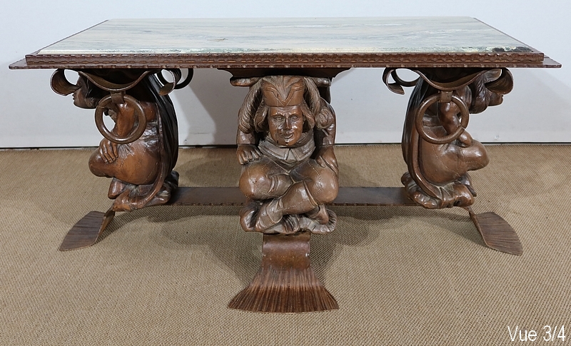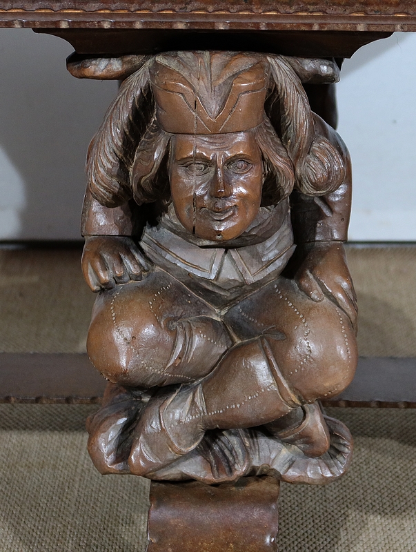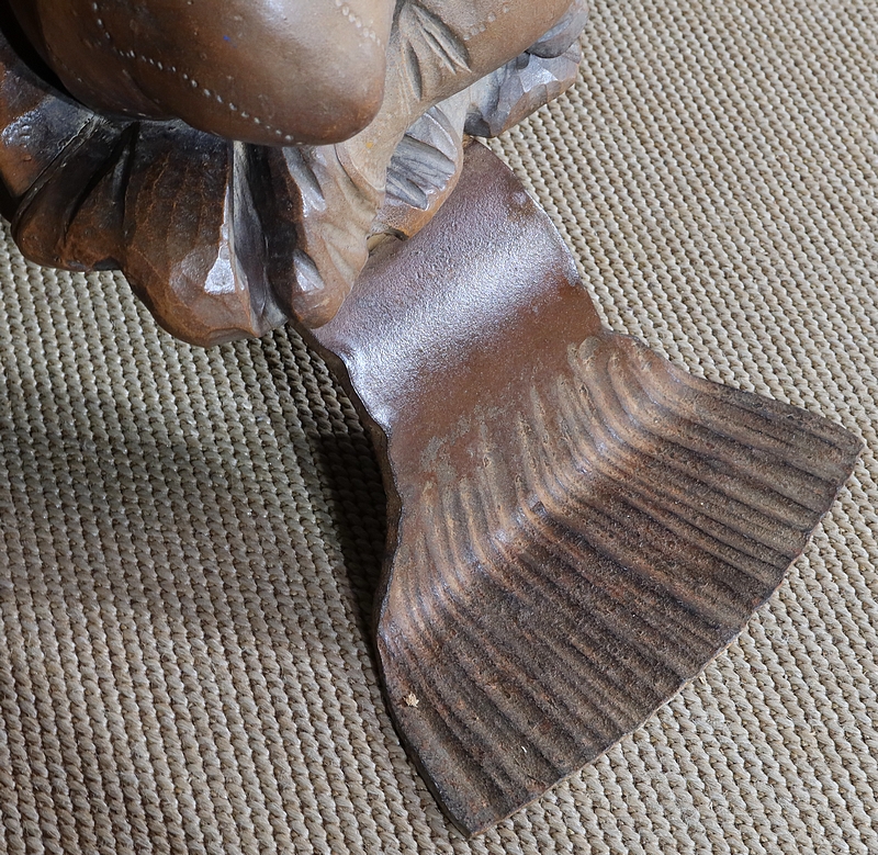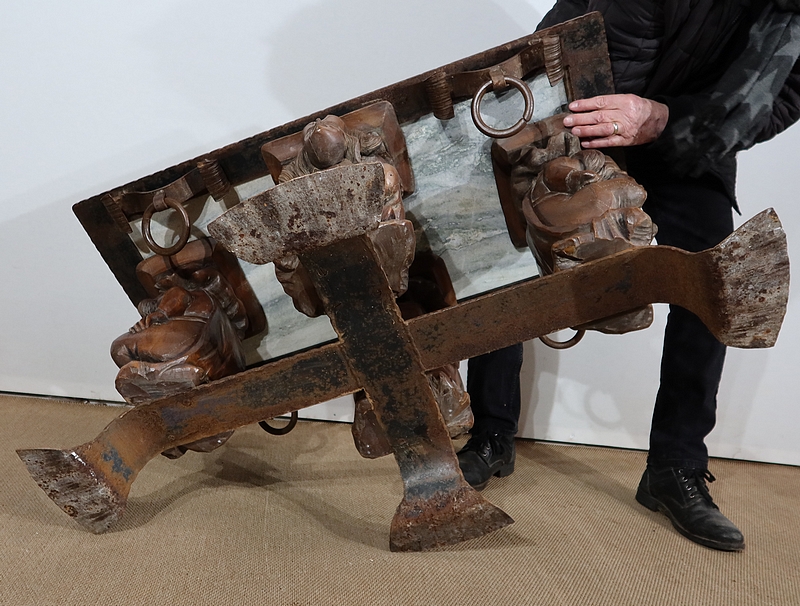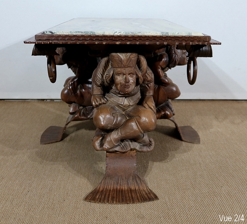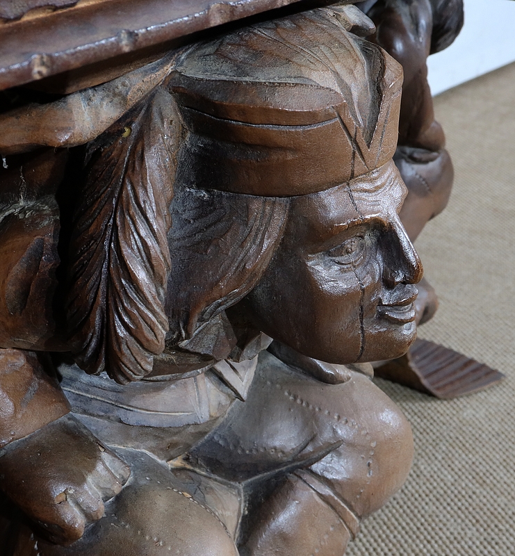 Chaque pied est décoré de grands personnages intrigants soutenant la table de leur dos. Souriants, ils se tiennent assis les jambes croisées et sont habillés d’un costume traditionnel. De chaque côté, nous retrouvons de larges volutes en fer accompagnées d’un anneau rond tombant.