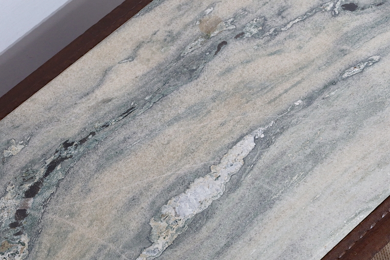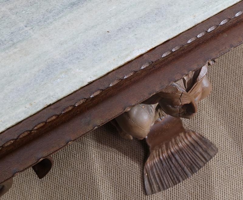 Cette table originale de forme rectangulaire est sommée d’un beau marbre vert clair formant écume de mer avec une gorge en son pourtour. Celui-ci est encastré dans un entourage en fer guilloché et à décrochement.