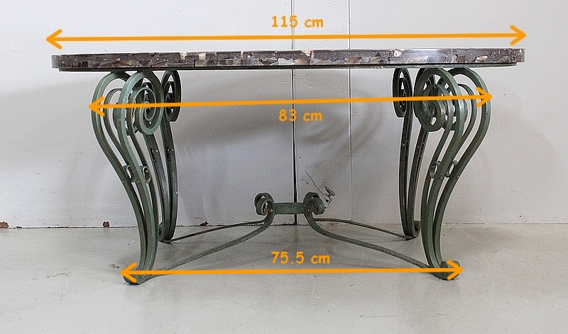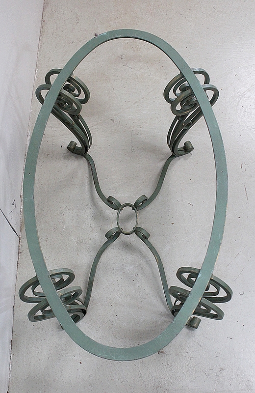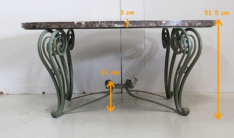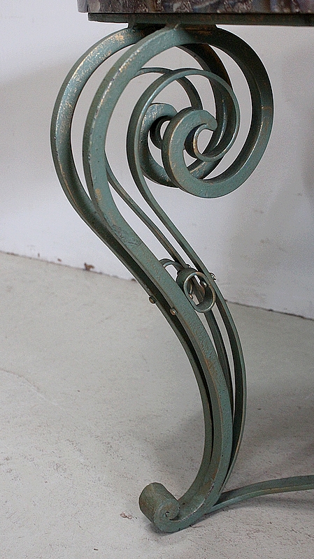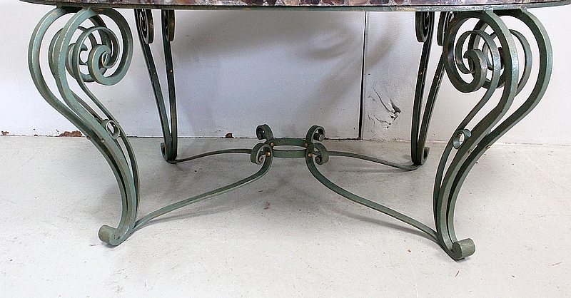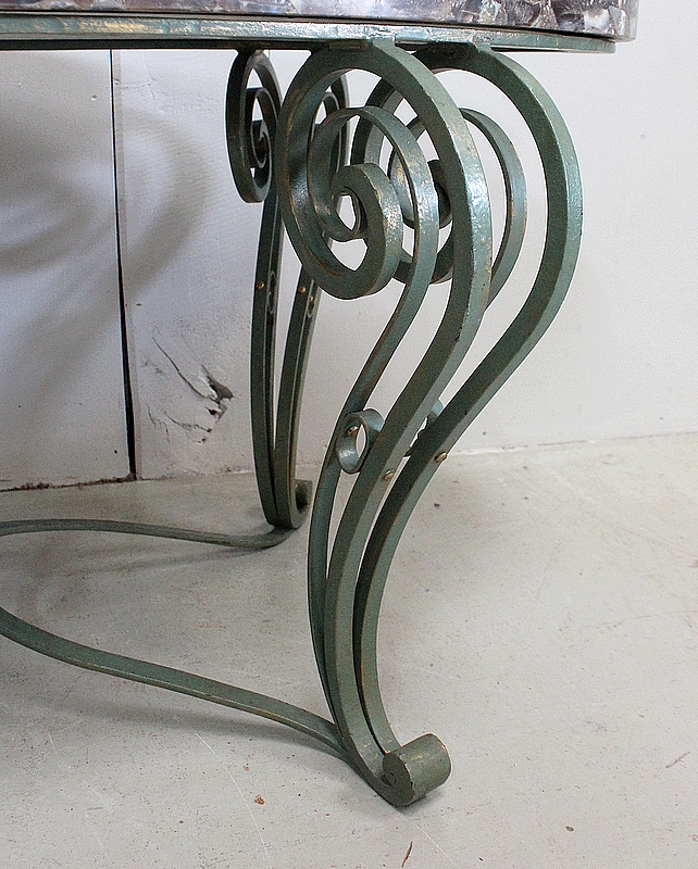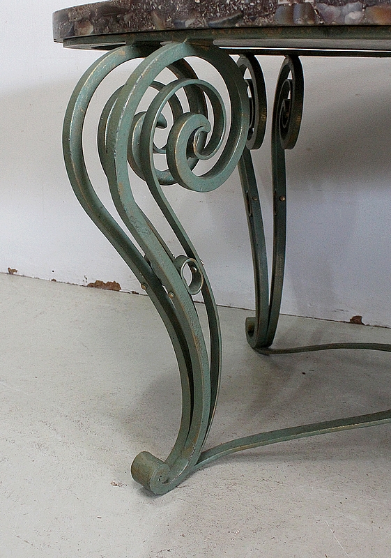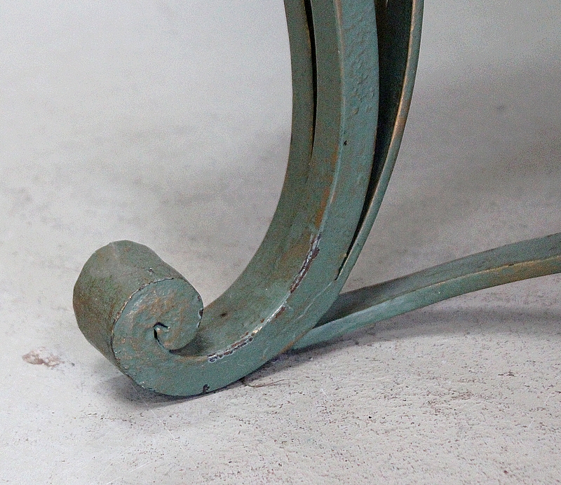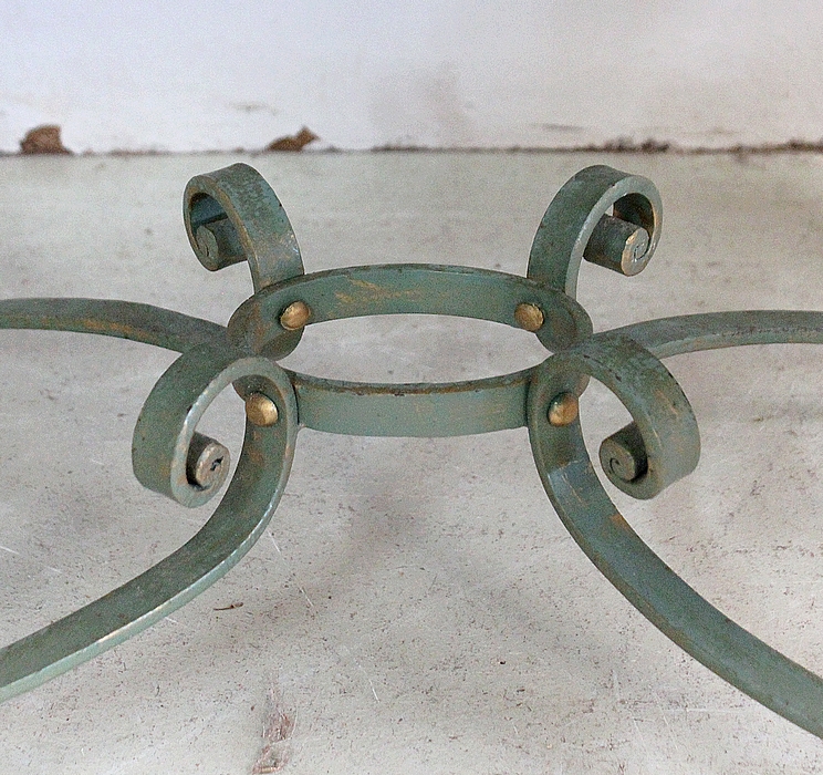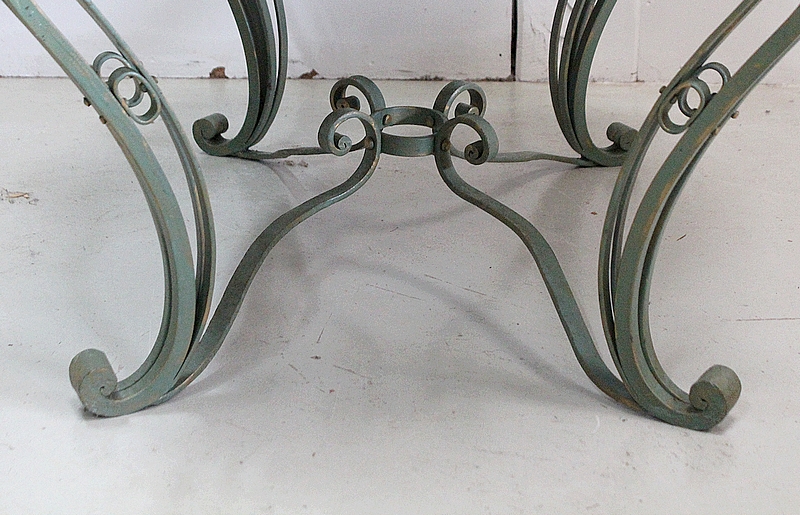 Le Piétement de ce Meuble, en Fer Forgé de couleur Vert Printemps et aux discrets Reflets Dorés, est constitué de quatre Pieds Doubles à Volutes. Ils sont rassemblés entre eux par quatre Éléments de Fer, terminés en Enroulements, et réunis au centre par un anneau Ovale.