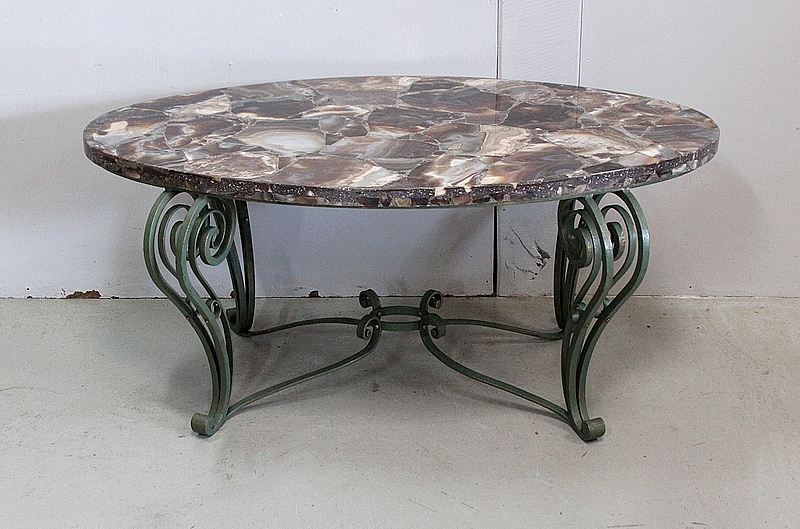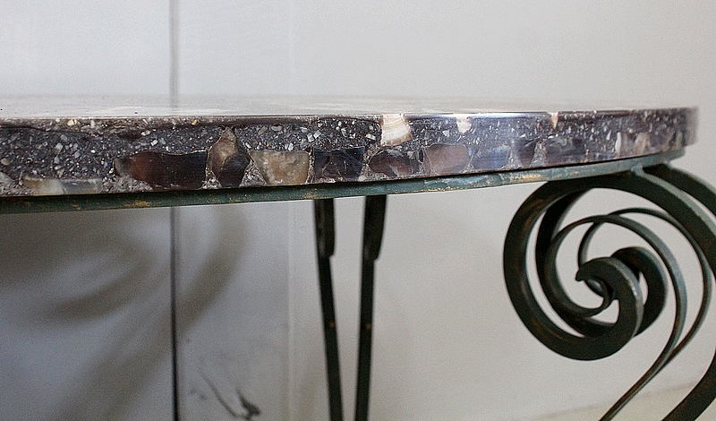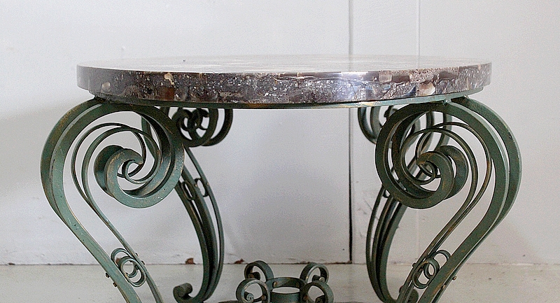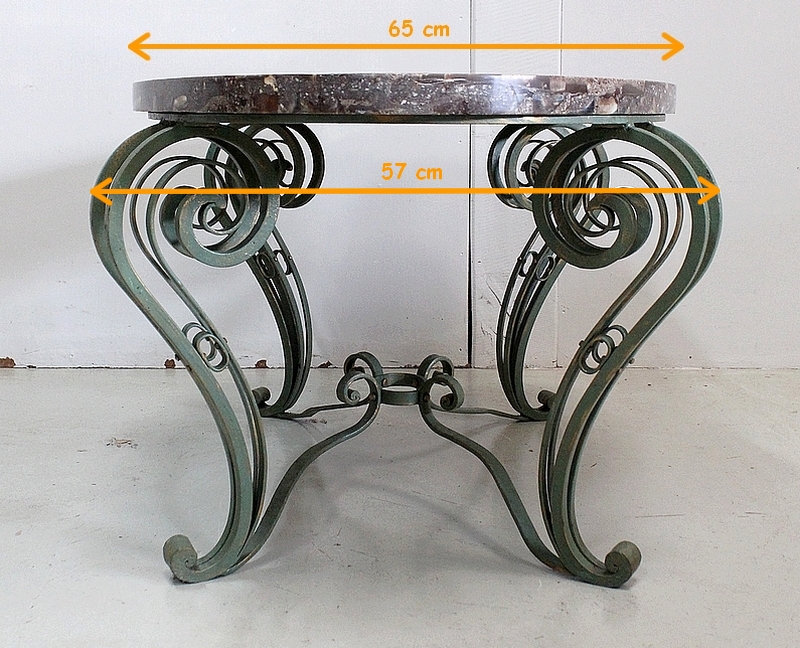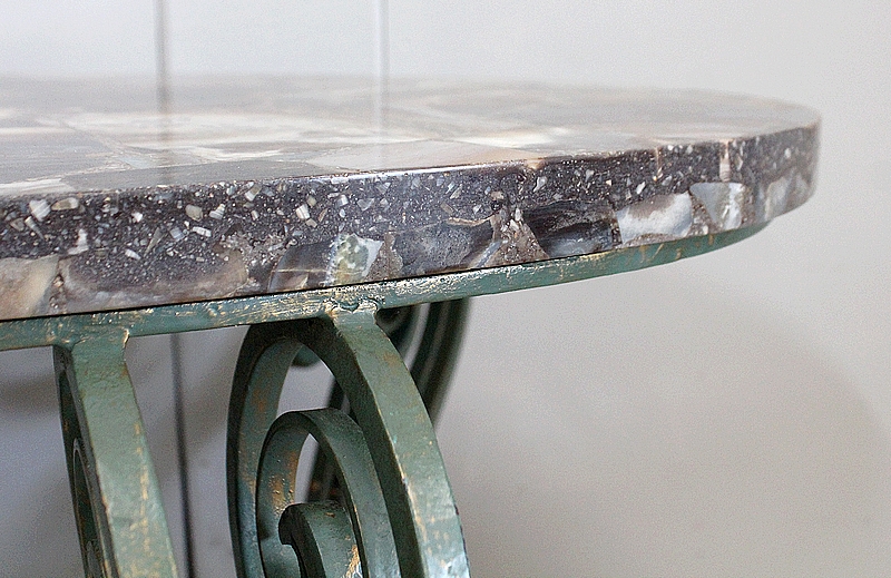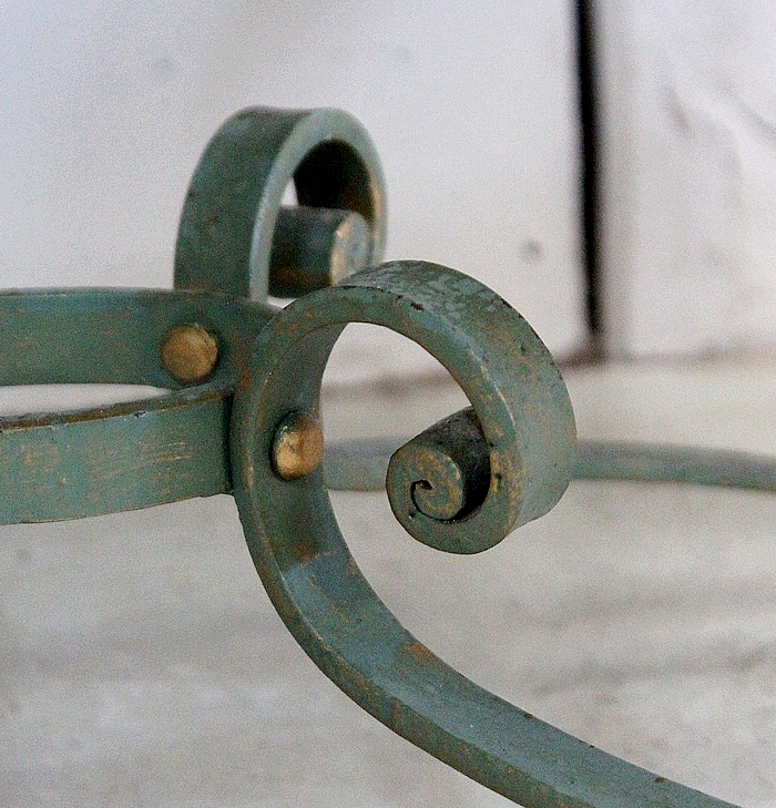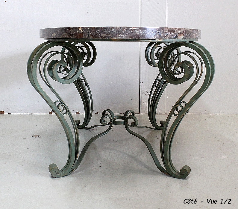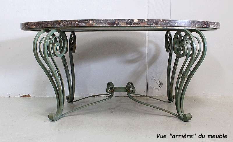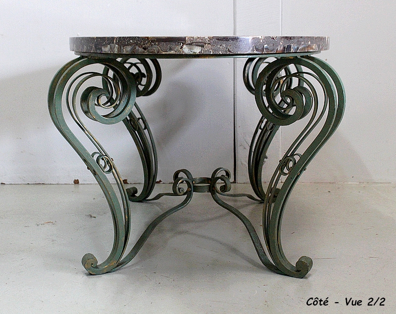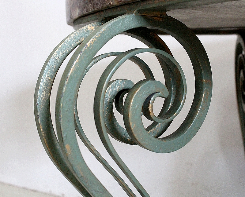 Le Piétement de ce Meuble, en Fer Forgé de couleur Vert Printemps et aux discrets Reflets Dorés, est constitué de quatre Pieds Doubles à Volutes. Ils sont rassemblés entre eux par quatre Éléments de Fer, terminés en Enroulements, et réunis au centre par un anneau Ovale.