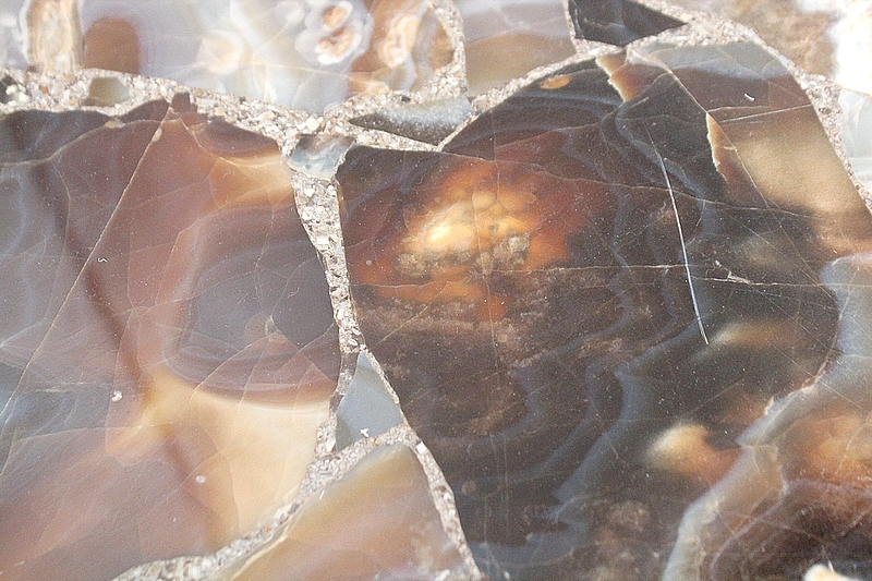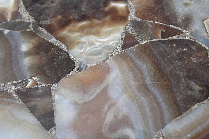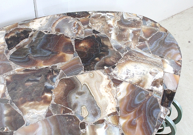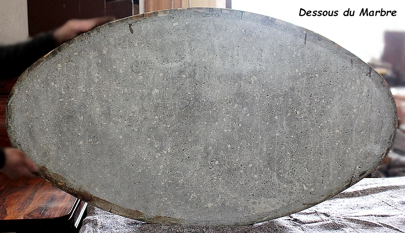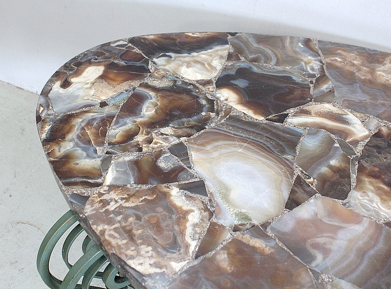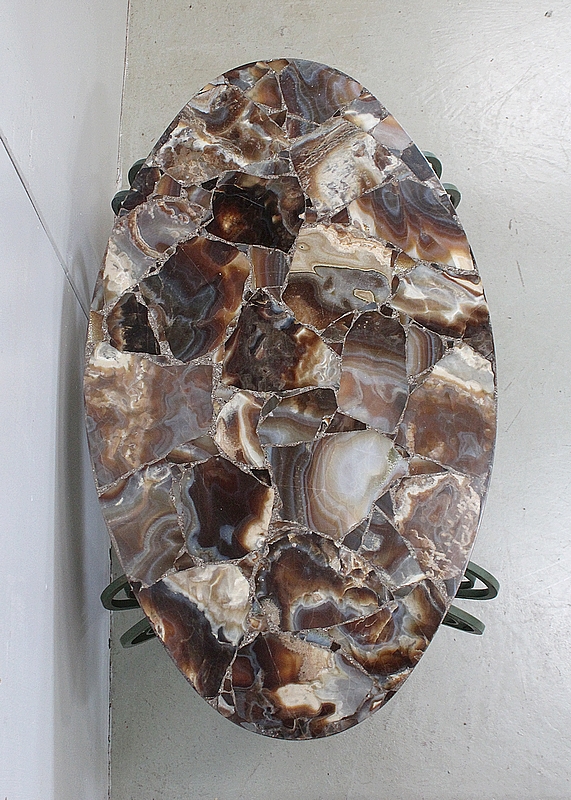 Son Plateau de forme Ovalisée se compose d’éléments de Marbre Onyx, juxtaposés à d’autres Marbres de Diverses Teintes Marrons et Caramels, clairsemés de Veinures Grises.