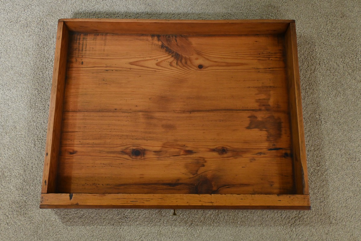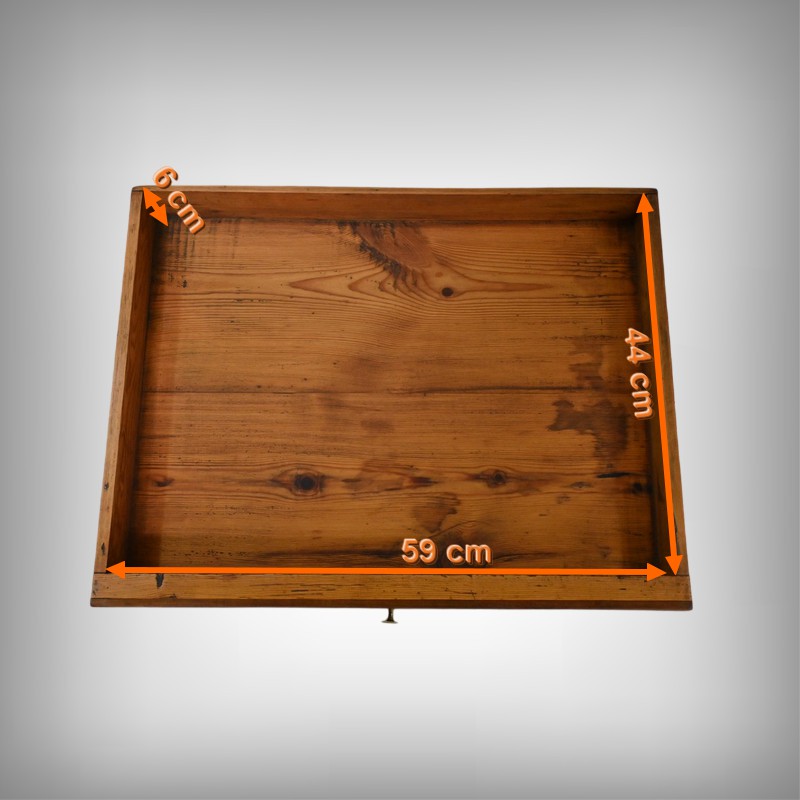 Son unique tiroir, subtilement intégré en façade, est orné de fines moulurations et ponctué d’un bouton en laiton, clin d’œil à l’orfèvrerie du mobilier d’époque.