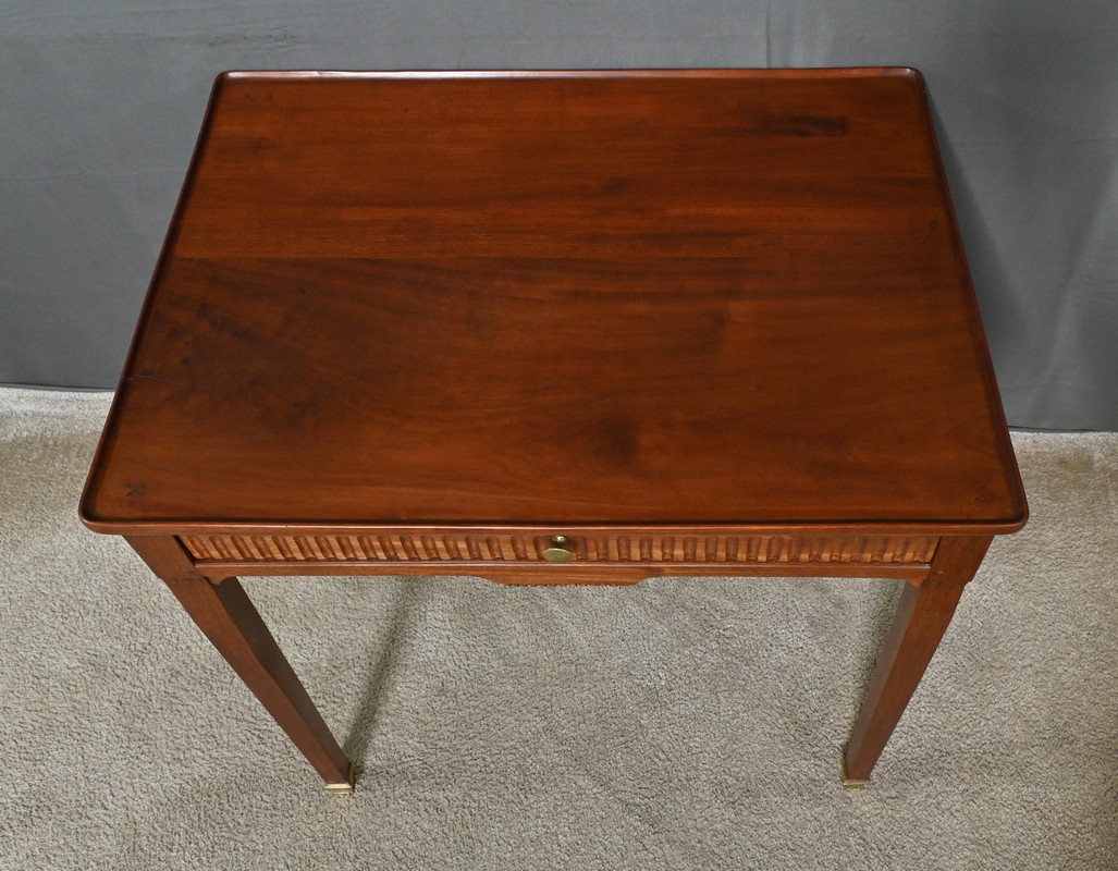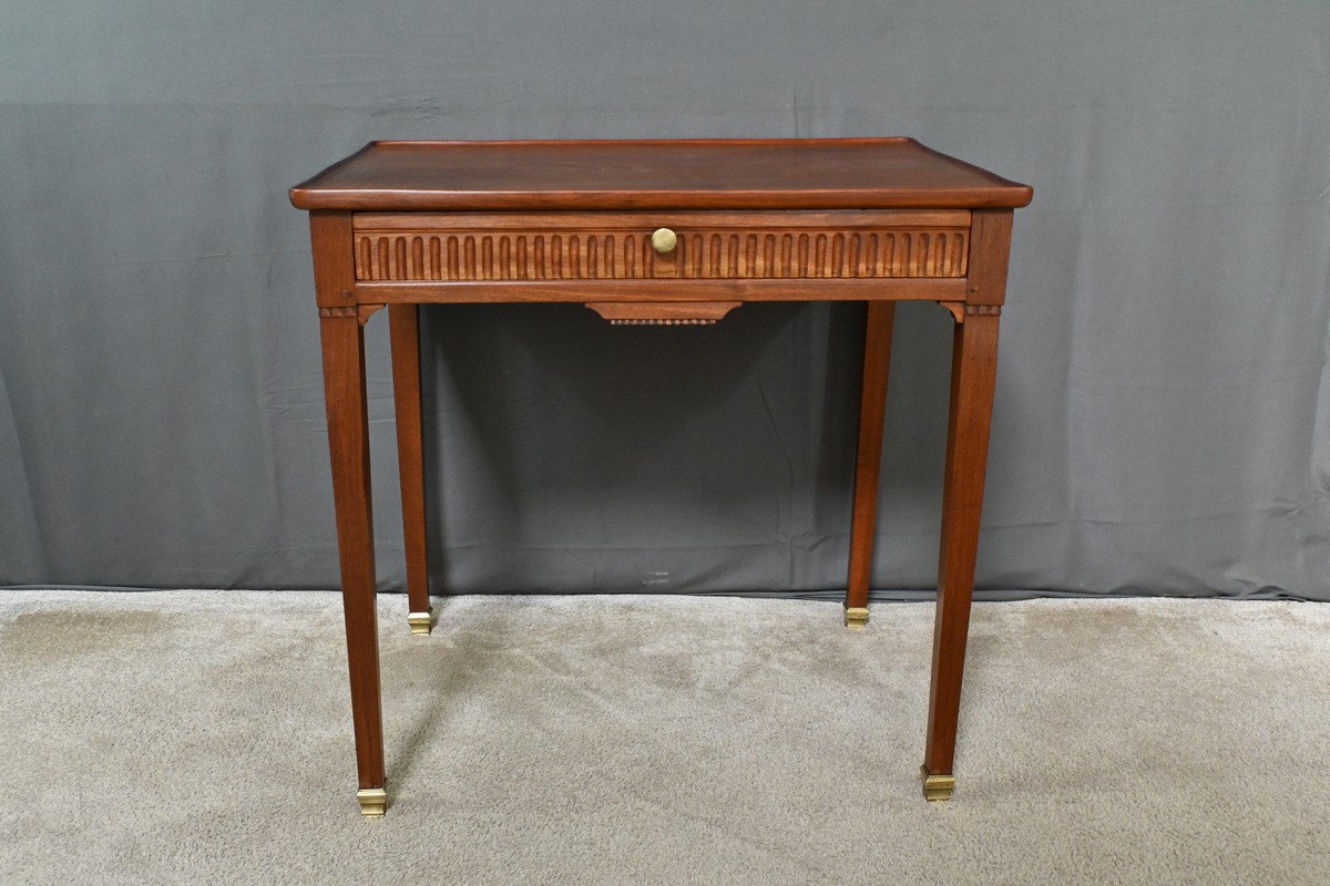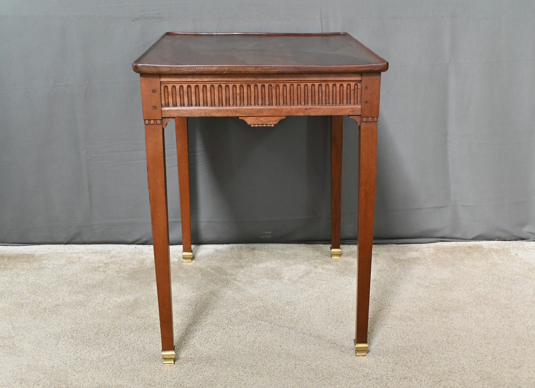 Cette table cabaret en acajou, datée du début du XIXᵉ siècle, s’inscrit dans la pure tradition du style Louis XVI, alliant rigueur des lignes et raffinement des détails.