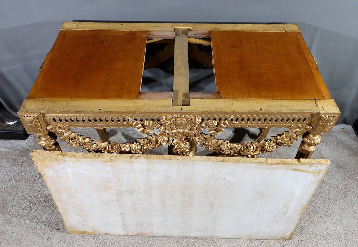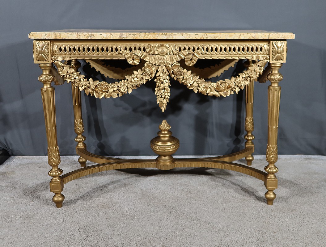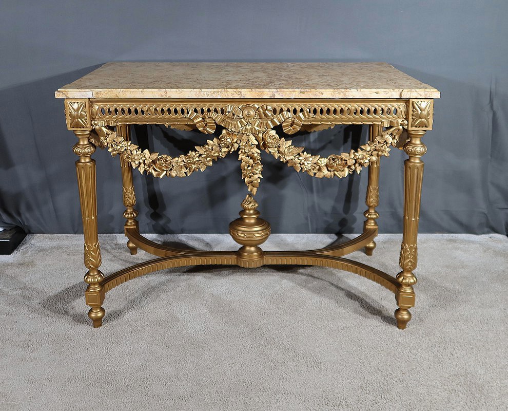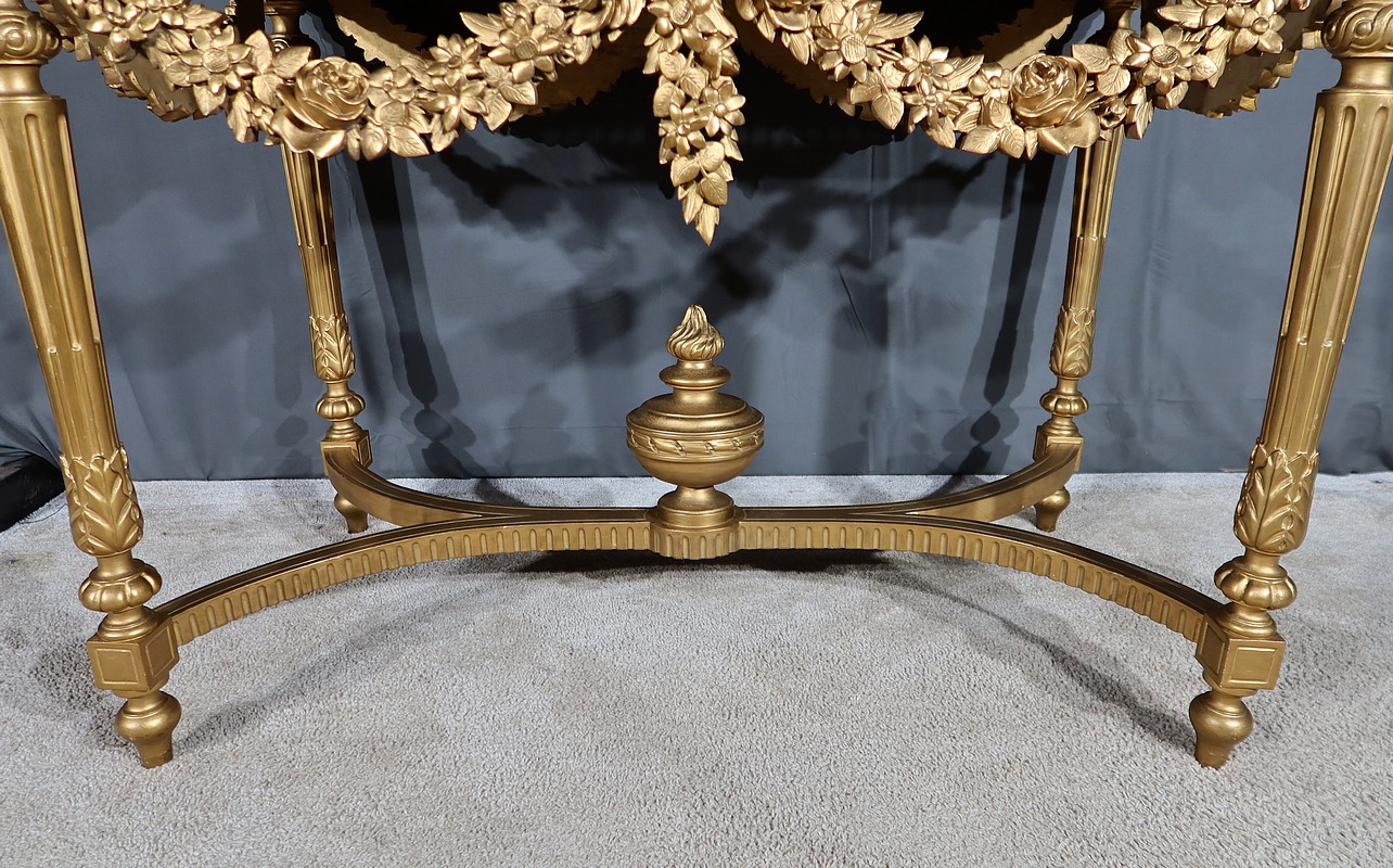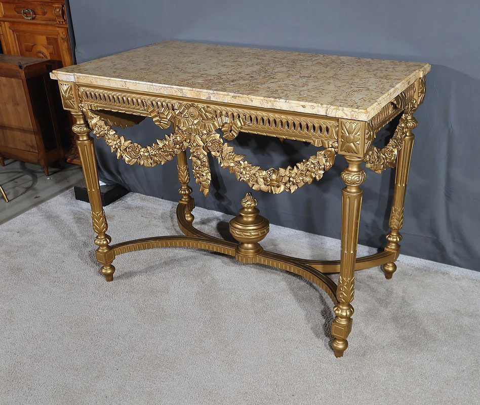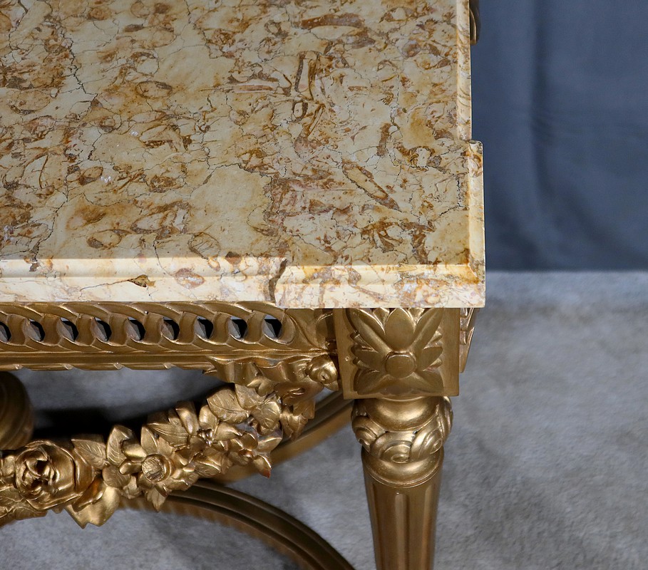 Belle console Louis XVI en bois doré, toutes faces, sommée d’un marbre Brocatelle Jaune du Jura. Ce dernier est entouré d’une gorge et doté d’angles en ressaut. Il repose sur une ceinture sculptée et ajourée, garnie en son centre d’un large nœud louis XVI qui semble retenir une importante guirlande de fleurs accompagnées de feuillage dense. Ce meuble possède la particularité d’être équipé de tirettes latérales agrandissant la surface de la console. Cette dernière repose sur des pieds sculptés de cannelures et de motifs en saillie. En partie haute, des rosaces dans des cartouches ornent chaque angle de la console. En partie basse, une entretoise sculptée formant un X est accompagnée d’une grande urne sommée d’une flamme.