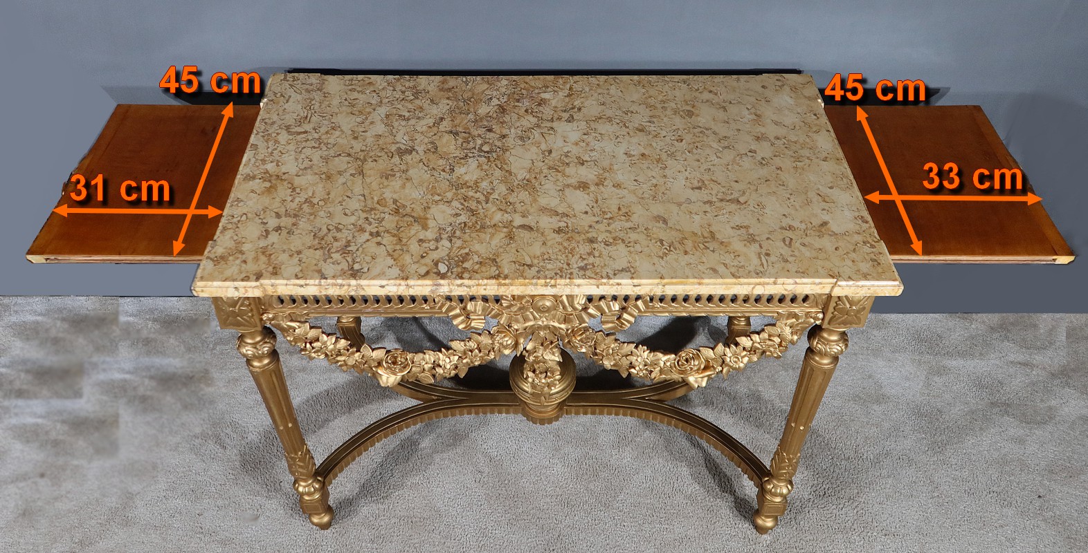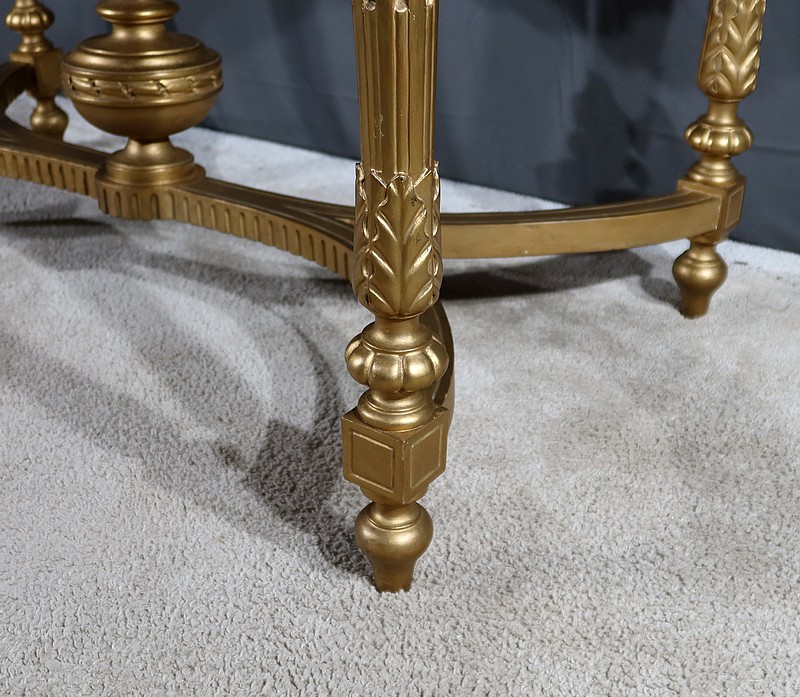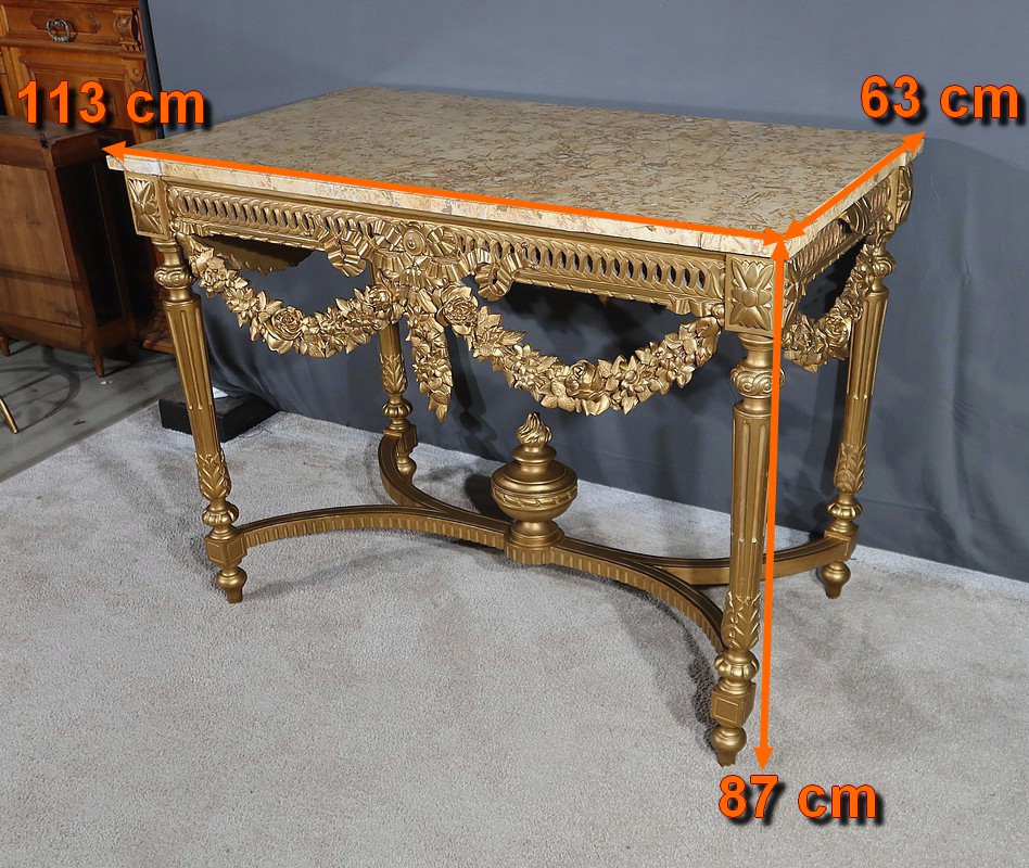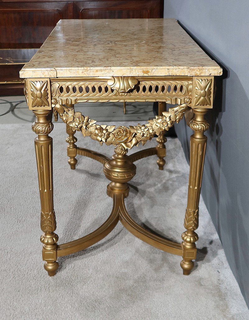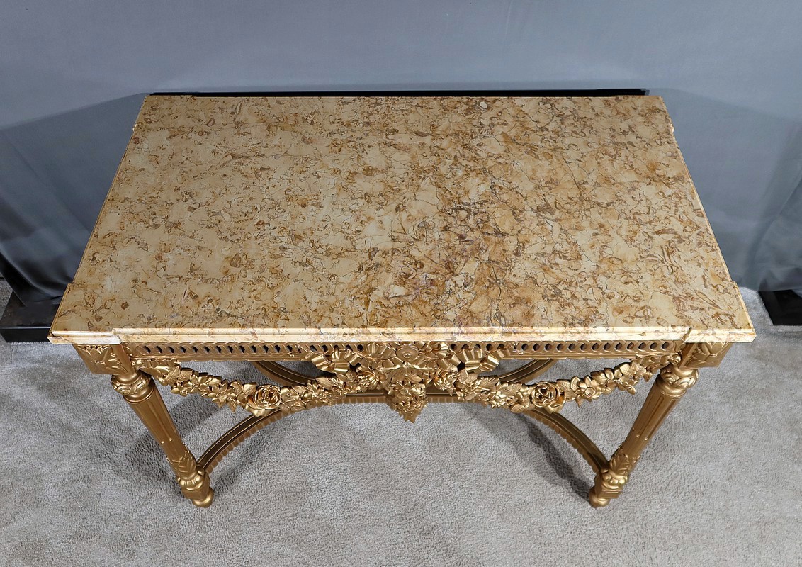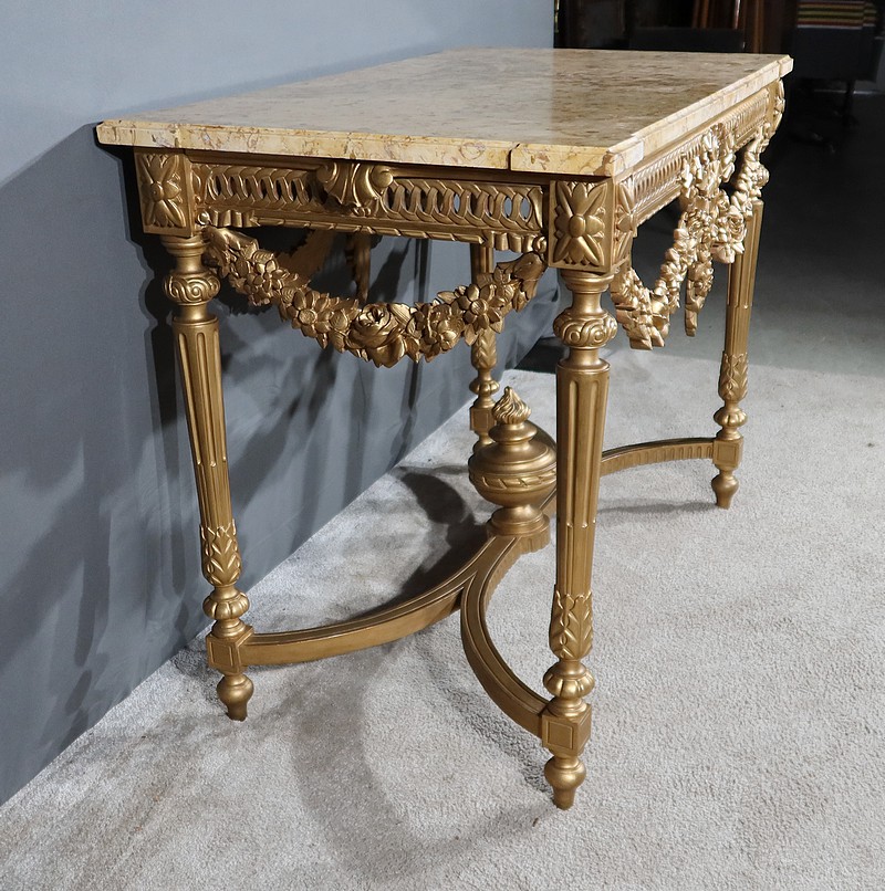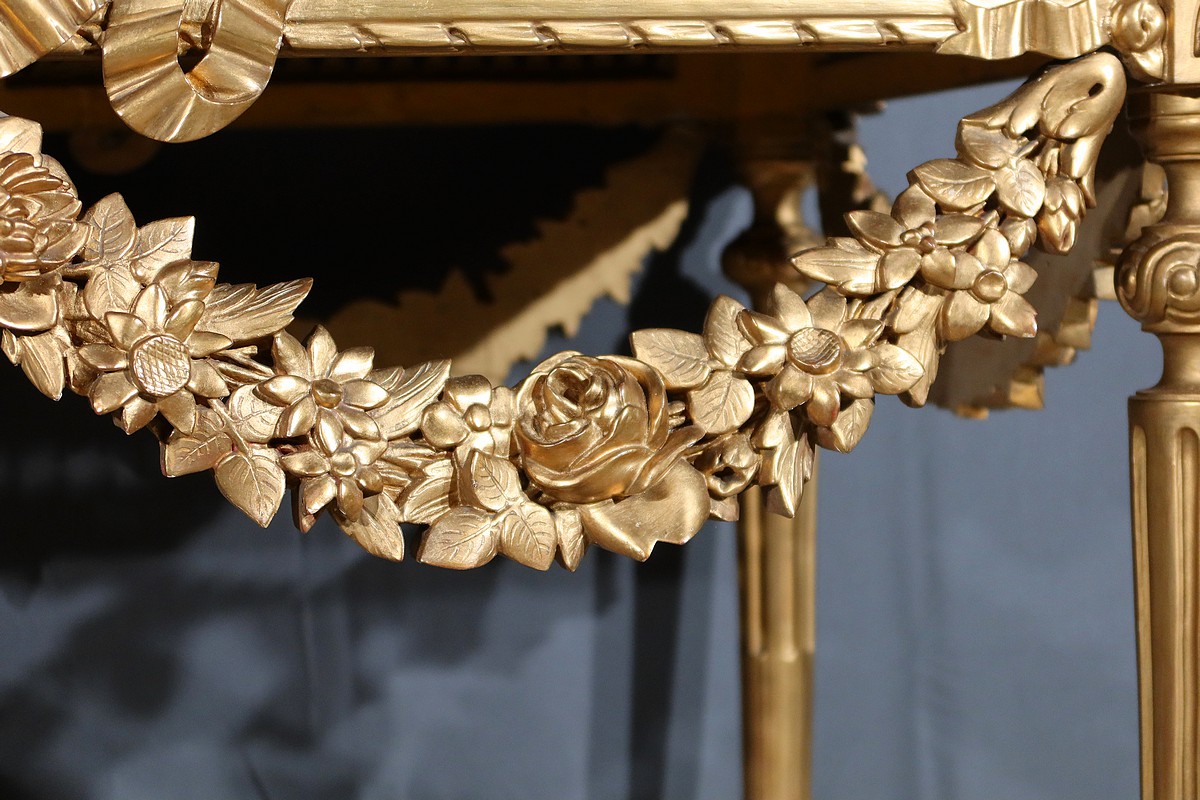 Belle console Louis XVI en bois doré, toutes faces, sommée d’un marbre Brocatelle Jaune du Jura. Ce dernier est entouré d’une gorge et doté d’angles en ressaut. Il repose sur une ceinture sculptée et ajourée, garnie en son centre d’un large nœud louis XVI qui semble retenir une importante guirlande de fleurs accompagnées de feuillage dense. Ce meuble possède la particularité d’être équipé de tirettes latérales agrandissant la surface de la console. Cette dernière repose sur des pieds sculptés de cannelures et de motifs en saillie. En partie haute, des rosaces dans des cartouches ornent chaque angle de la console. En partie basse, une entretoise sculptée formant un X est accompagnée d’une grande urne sommée d’une flamme.