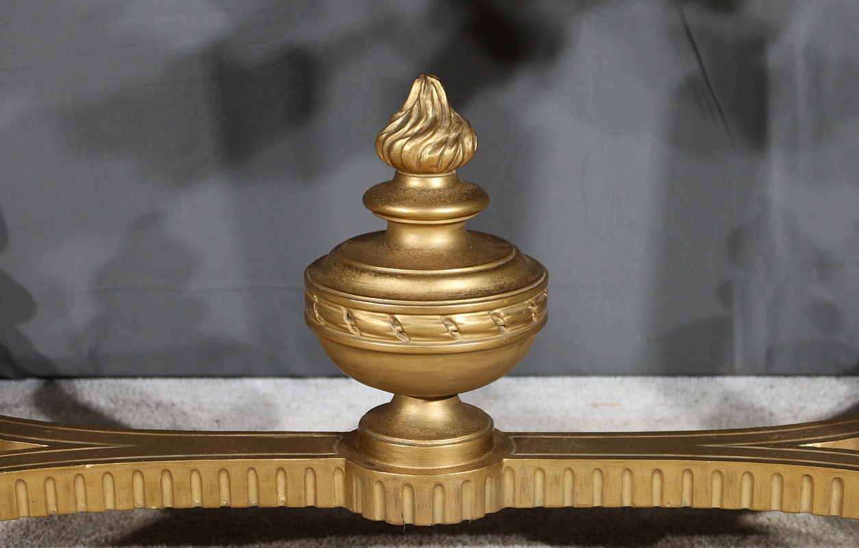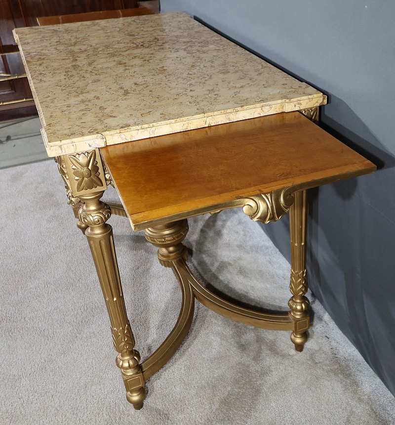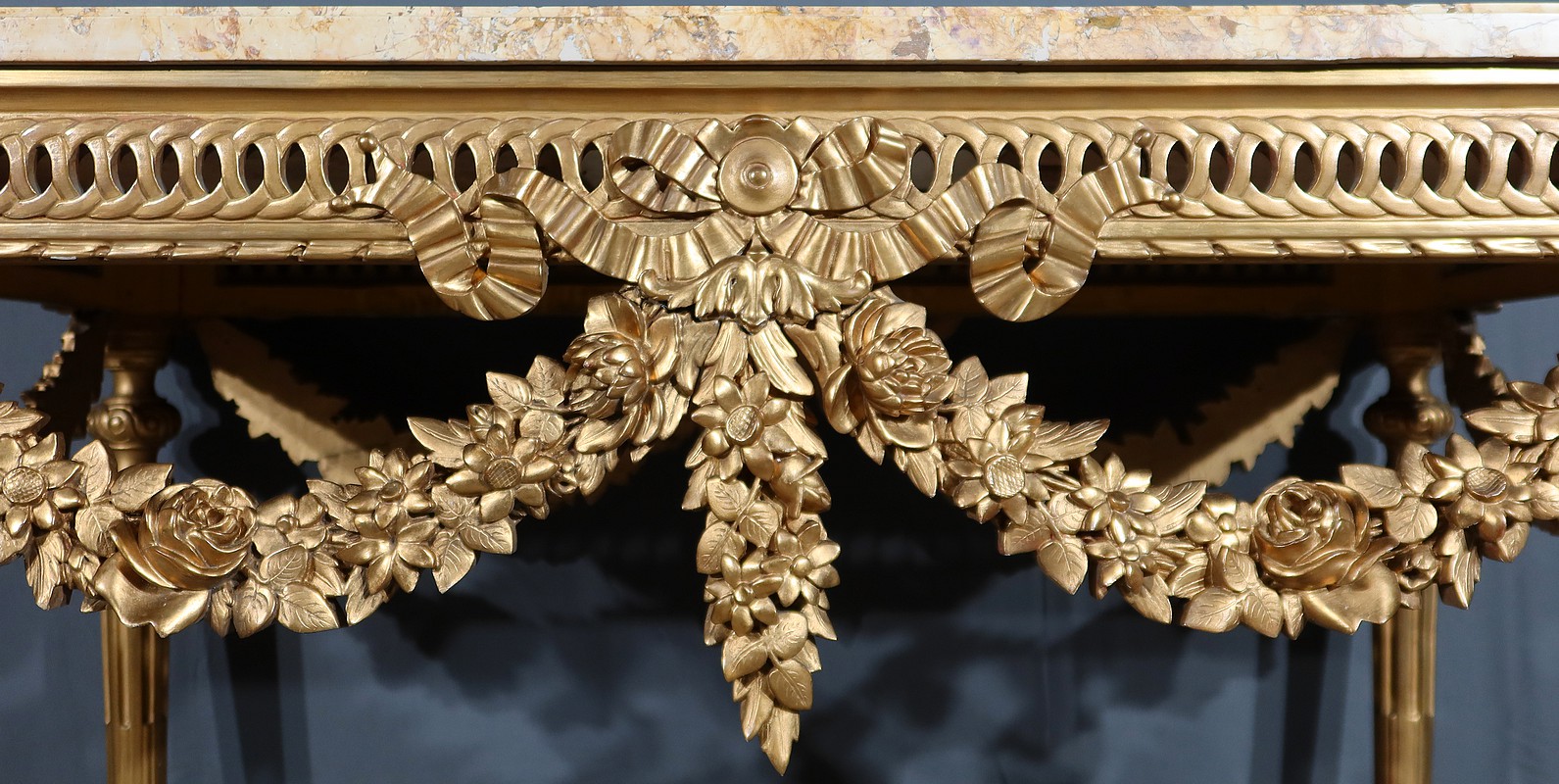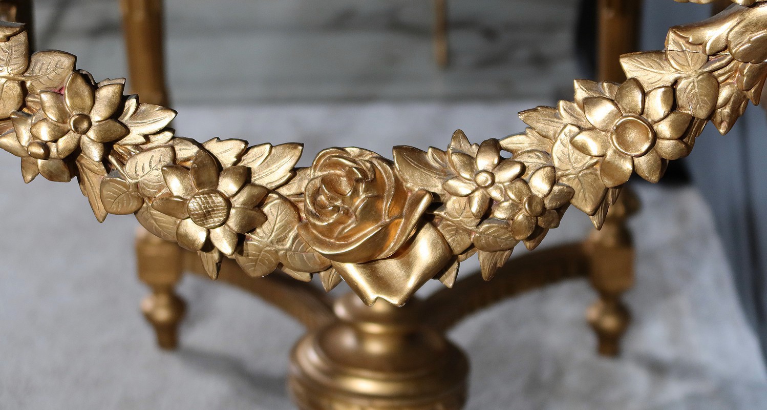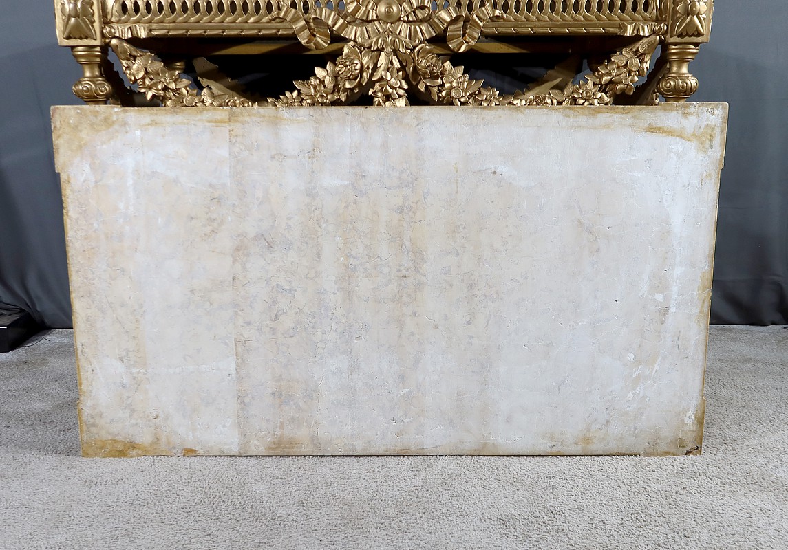 Belle console Louis XVI en bois doré, toutes faces, sommée d’un marbre Brocatelle Jaune du Jura. Ce dernier est entouré d’une gorge et doté d’angles en ressaut. Il repose sur une ceinture sculptée et ajourée, garnie en son centre d’un large nœud louis XVI qui semble retenir une importante guirlande de fleurs accompagnées de feuillage dense. Ce meuble possède la particularité d’être équipé de tirettes latérales agrandissant la surface de la console. Cette dernière repose sur des pieds sculptés de cannelures et de motifs en saillie. En partie haute, des rosaces dans des cartouches ornent chaque angle de la console. En partie basse, une entretoise sculptée formant un X est accompagnée d’une grande urne sommée d’une flamme.