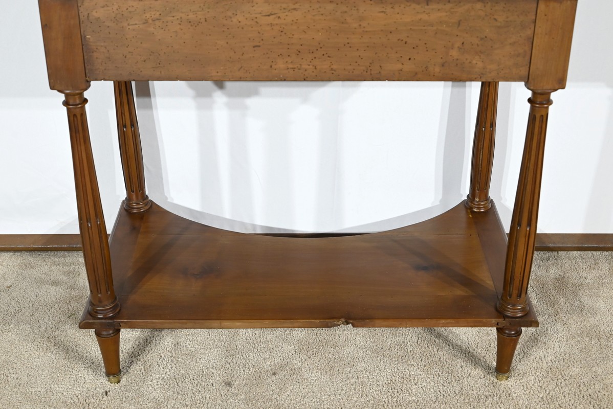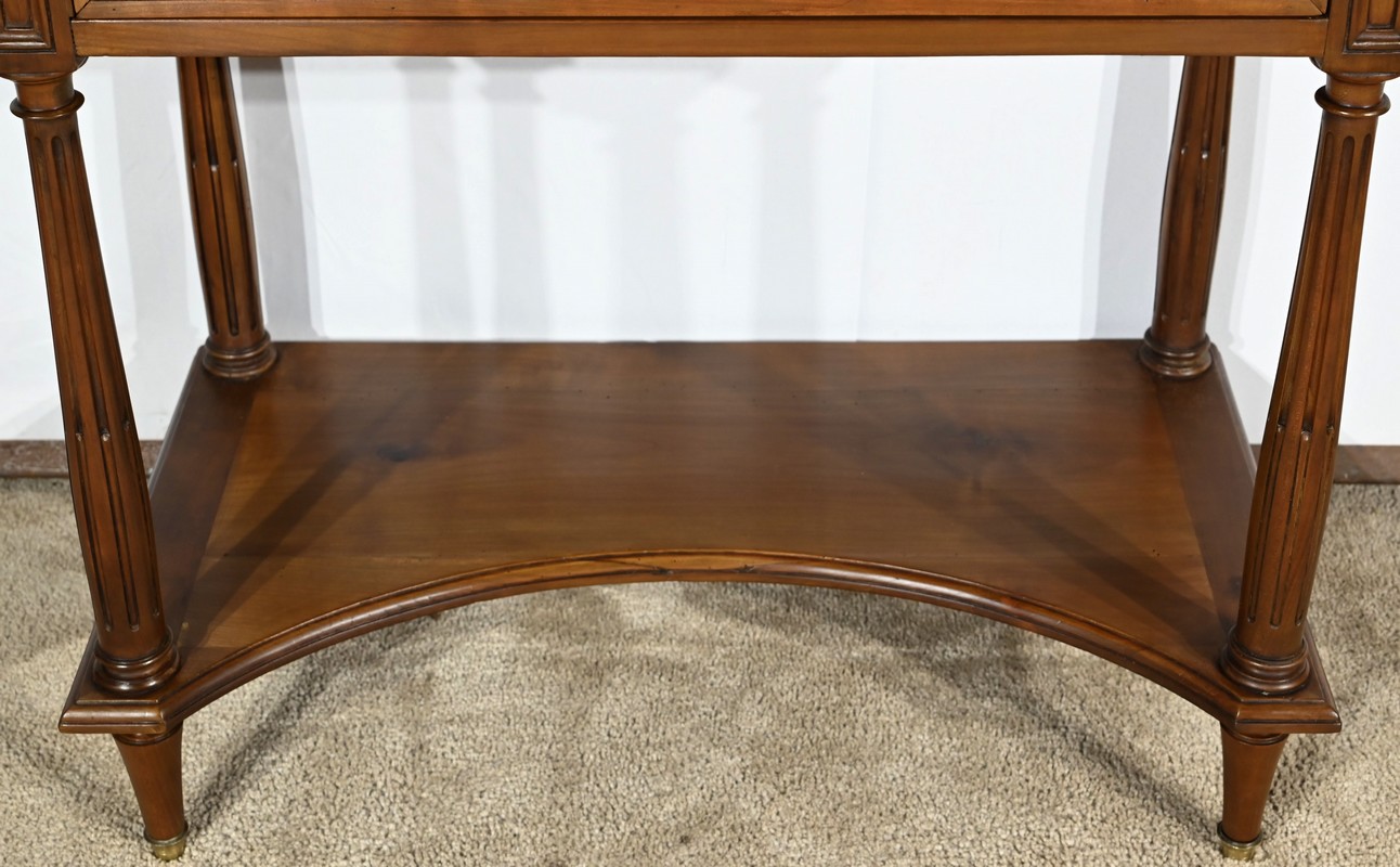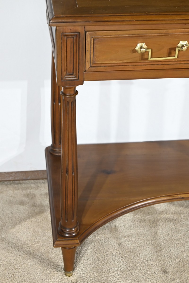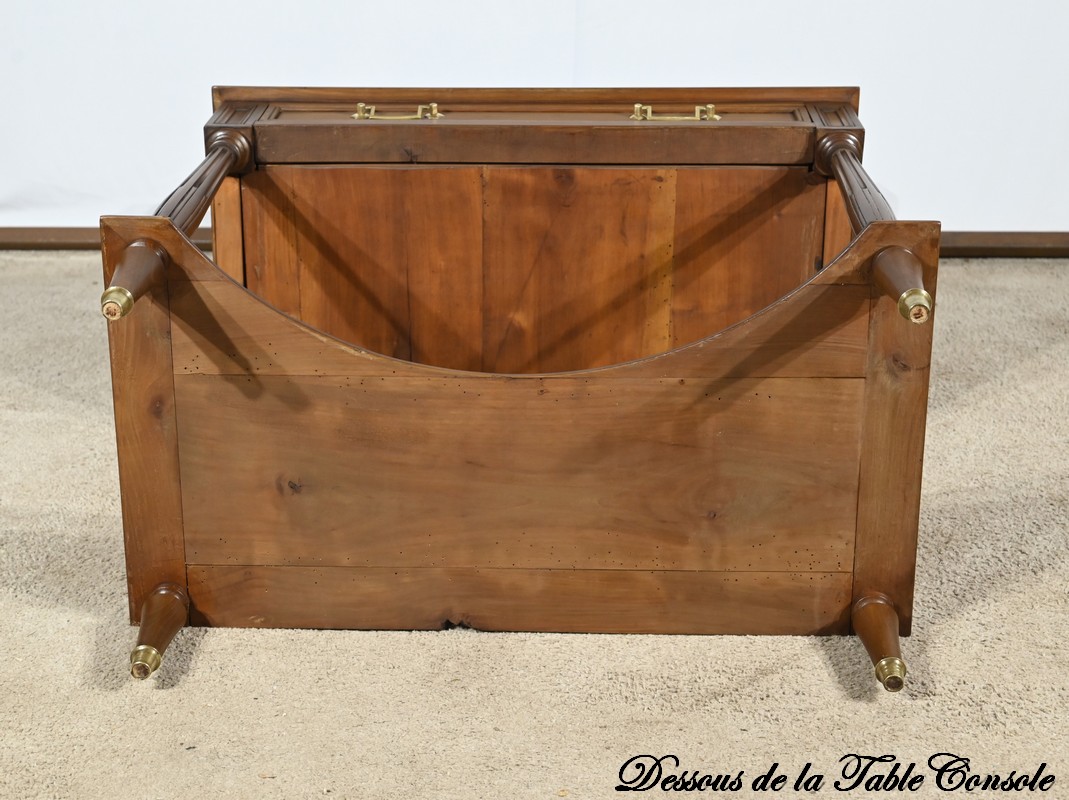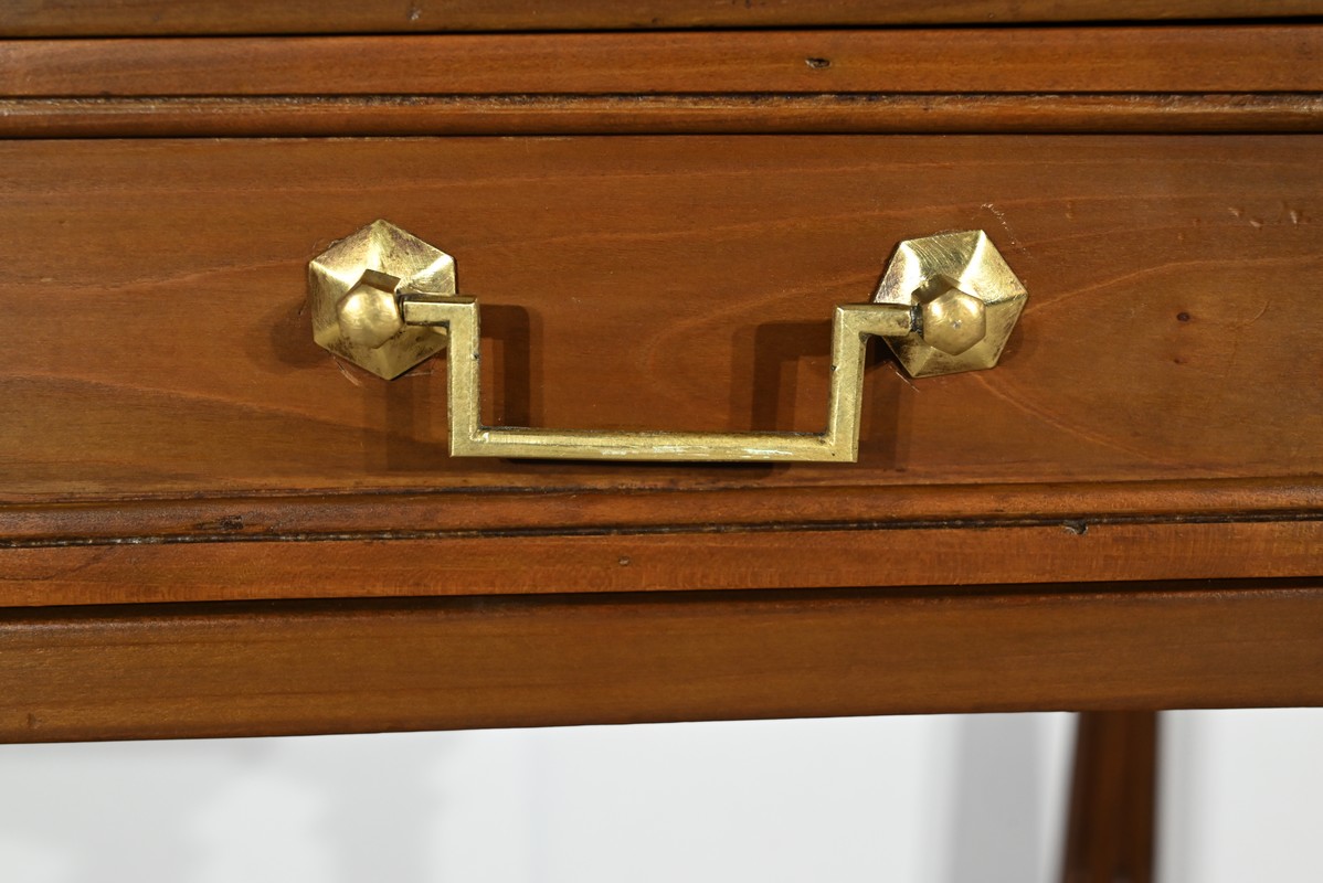 Cette table console en merisier ouvre en ceinture par un tiroir à façade à défoncement avec baguette moulurée et poignées attache tombantes.
