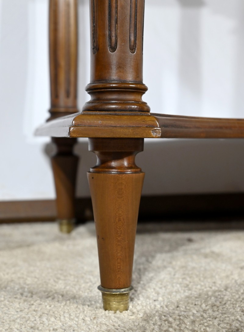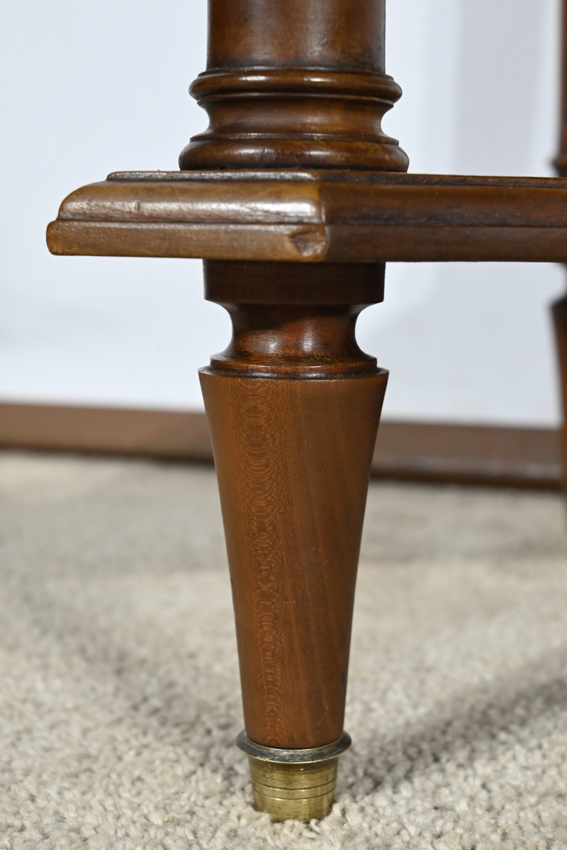 Les pieds en fuseau à cannelures arrêtées et asperges en bois sont réunis par une tablette d’entretoise concave moulurée en carré et bec de corbin dans son pourtour.