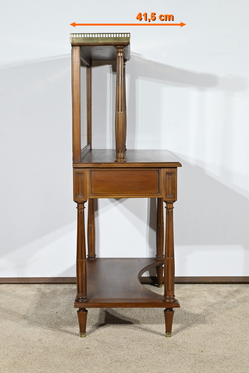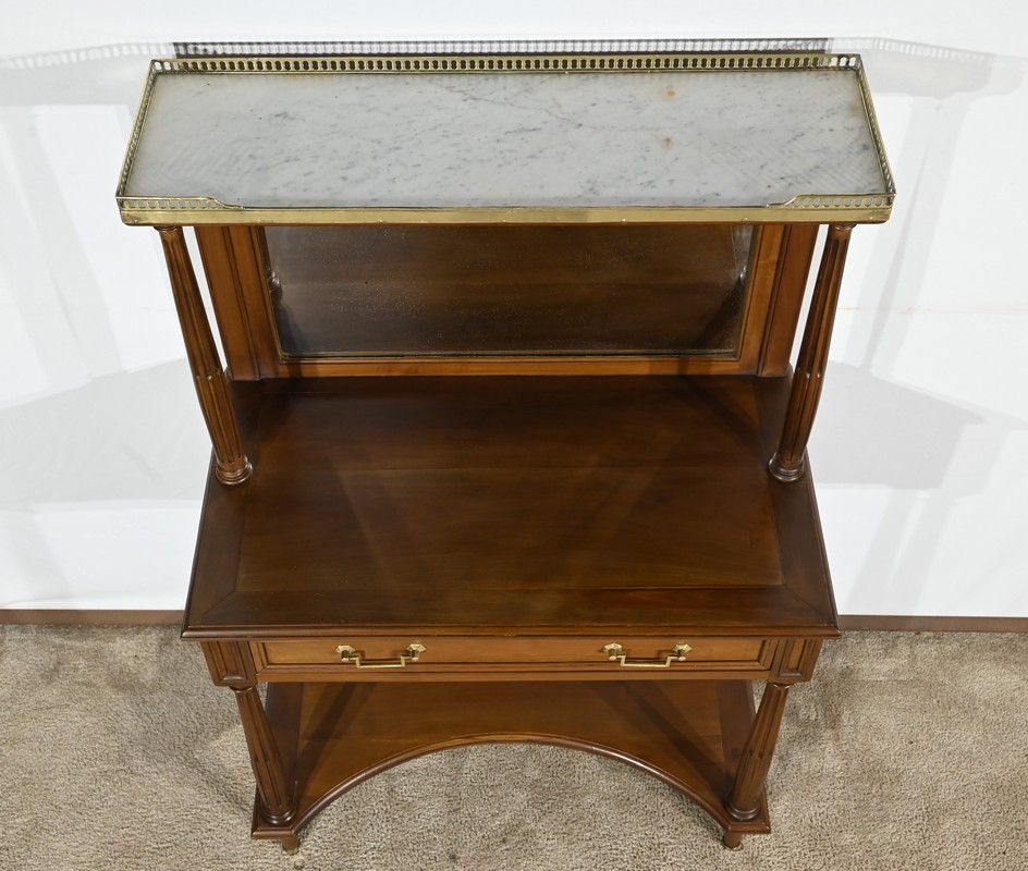 Monté sur deux colonnes en fuseau, par ailleurs identique au piétement, se trouve un dessus en marbre de carrare souligné par une galerie ajourée en laiton.