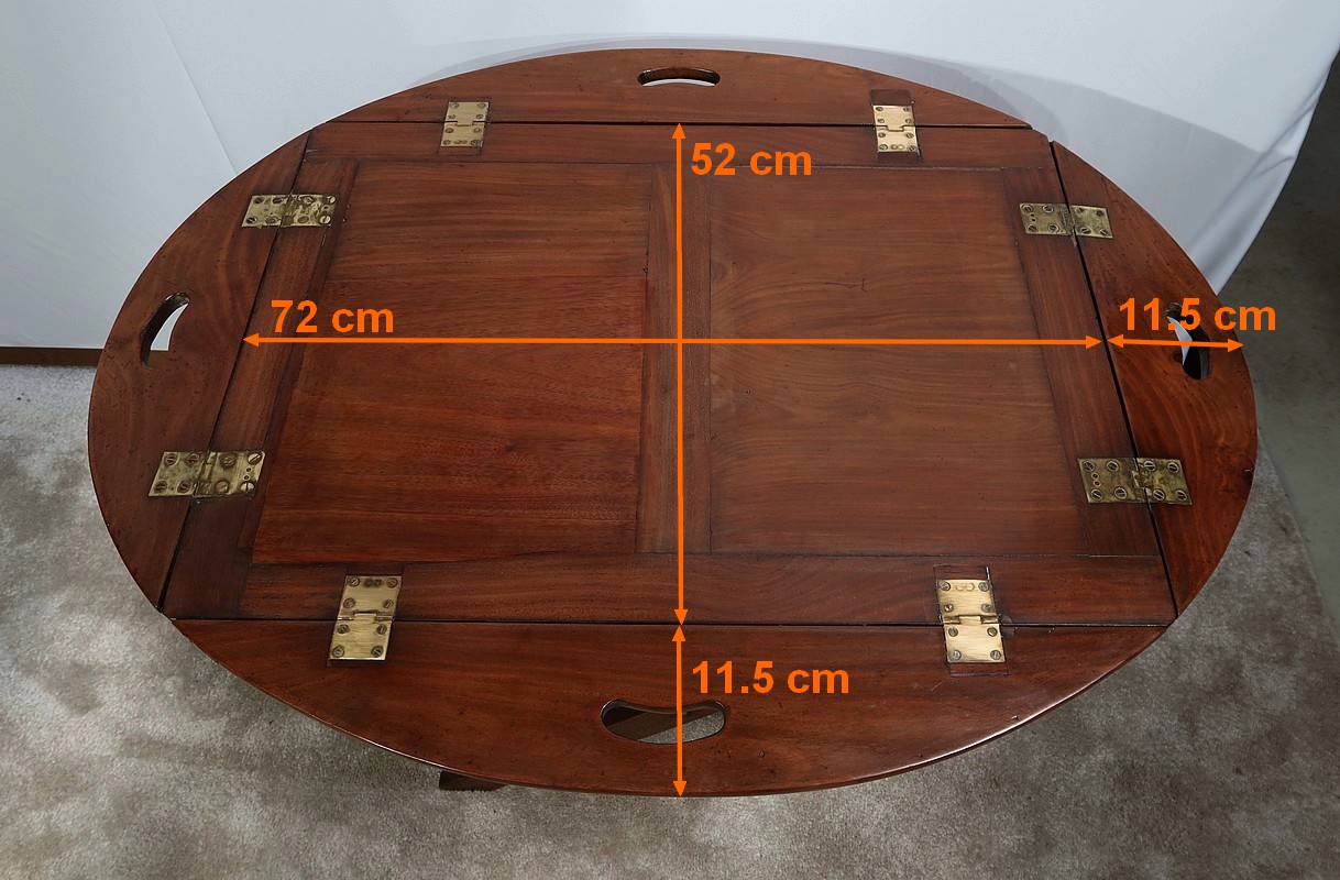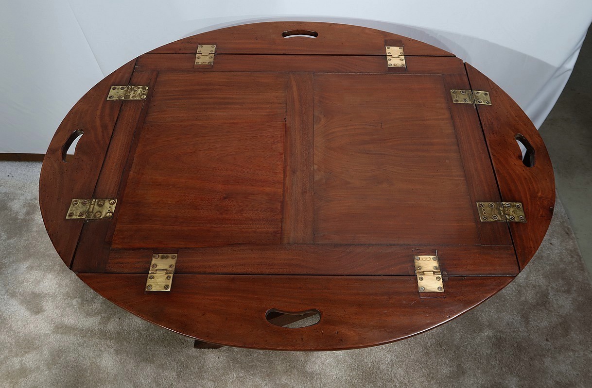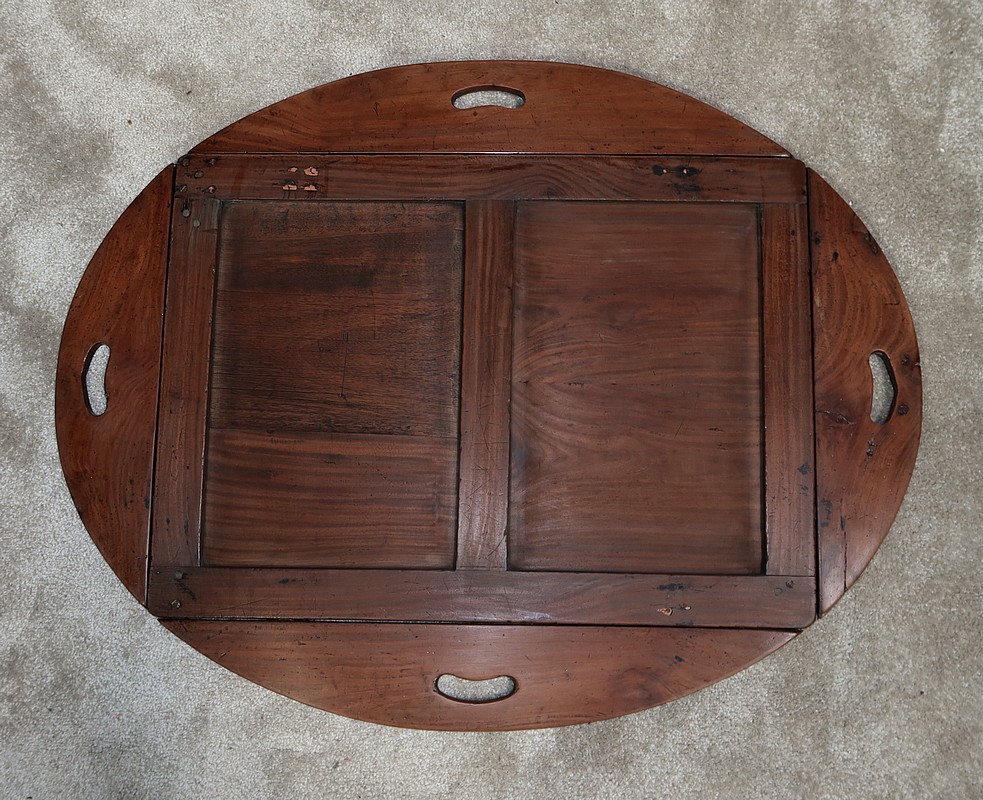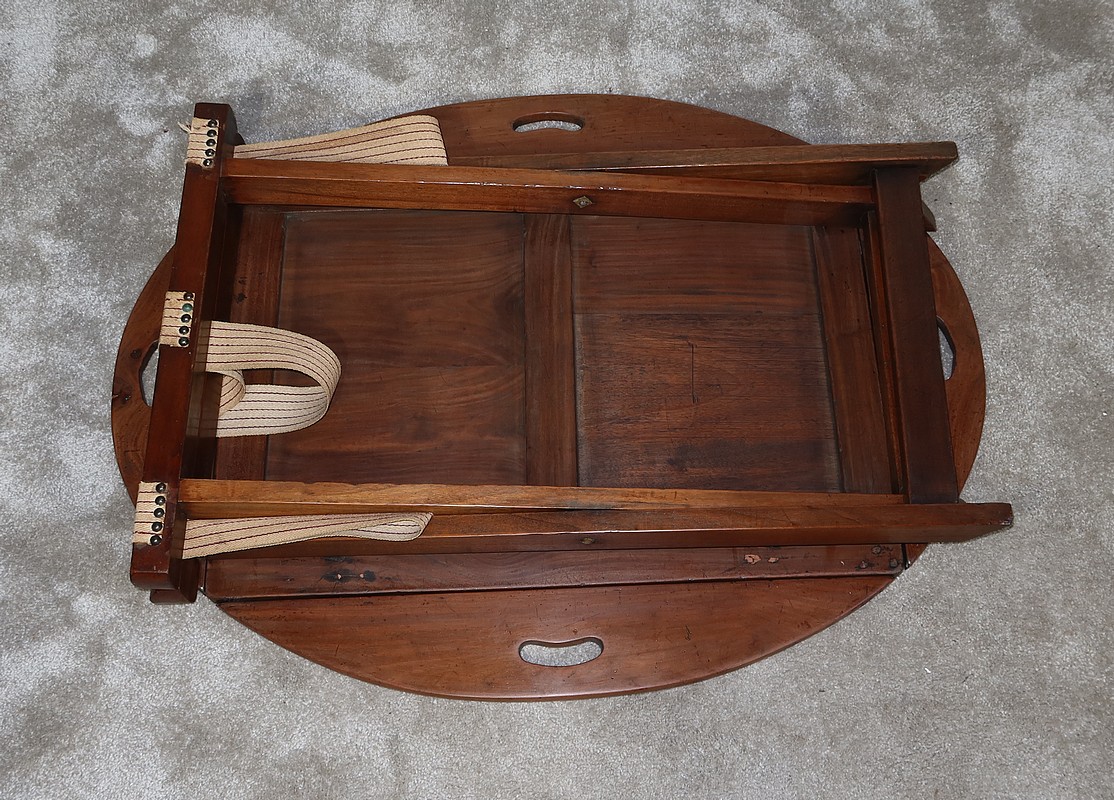 Table Butler en acajou massif avec un dessus ovale composé d’un plateau rectangulaire et de rebords légèrement arrondis, se repliant sur des charnières laiton encastrées d’origine. Ces rebords sont creusés de poignées à main.