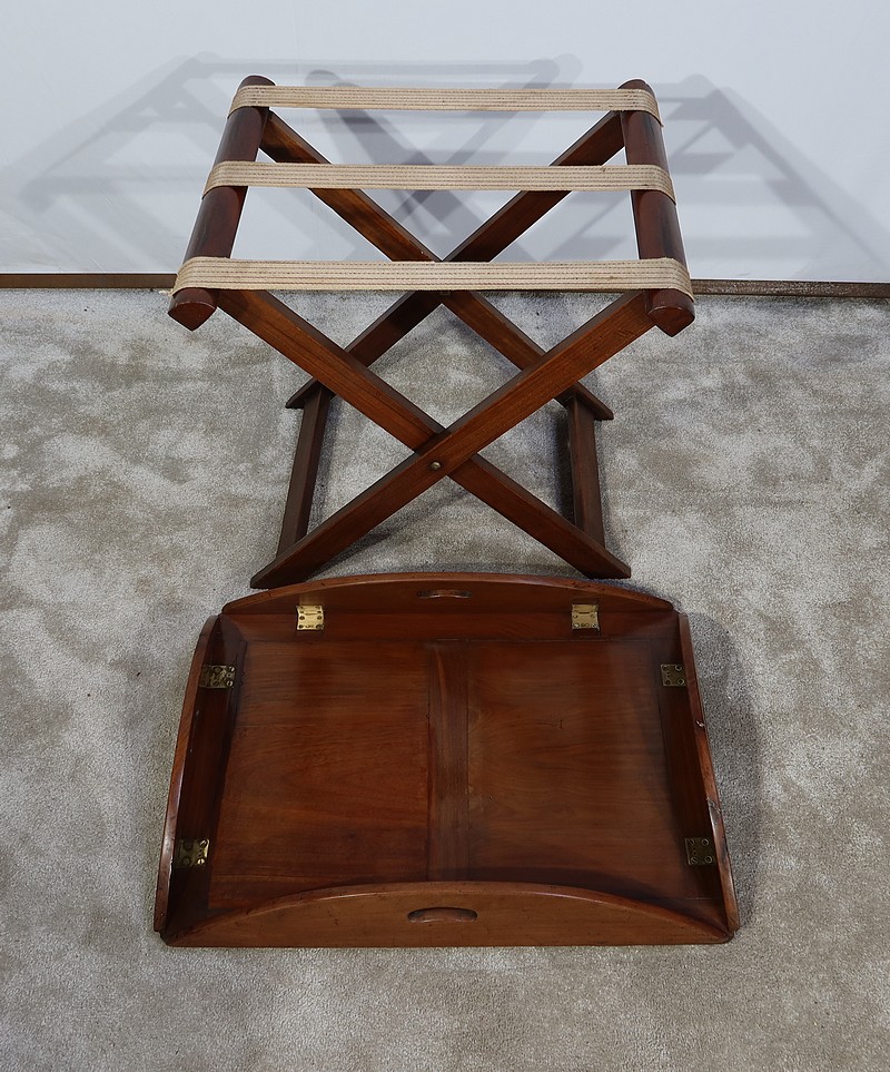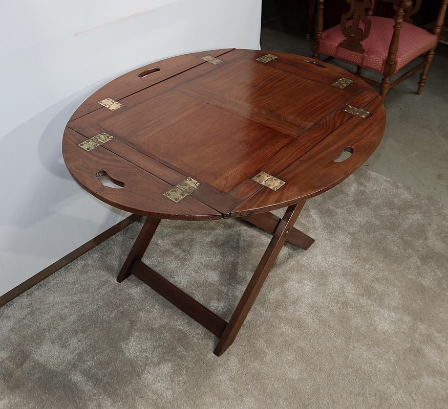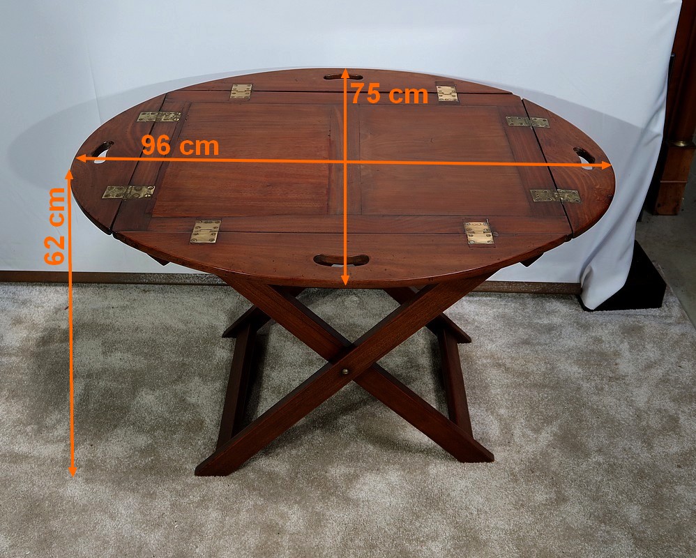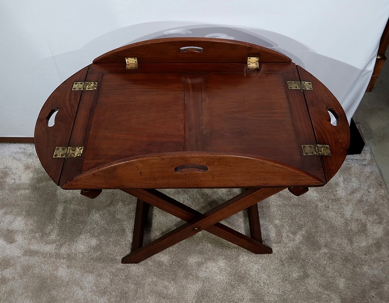 Table Butler en acajou massif avec un dessus ovale composé d’un plateau rectangulaire et de rebords légèrement arrondis, se repliant sur des charnières laiton encastrées d’origine. Ces rebords sont creusés de poignées à main.