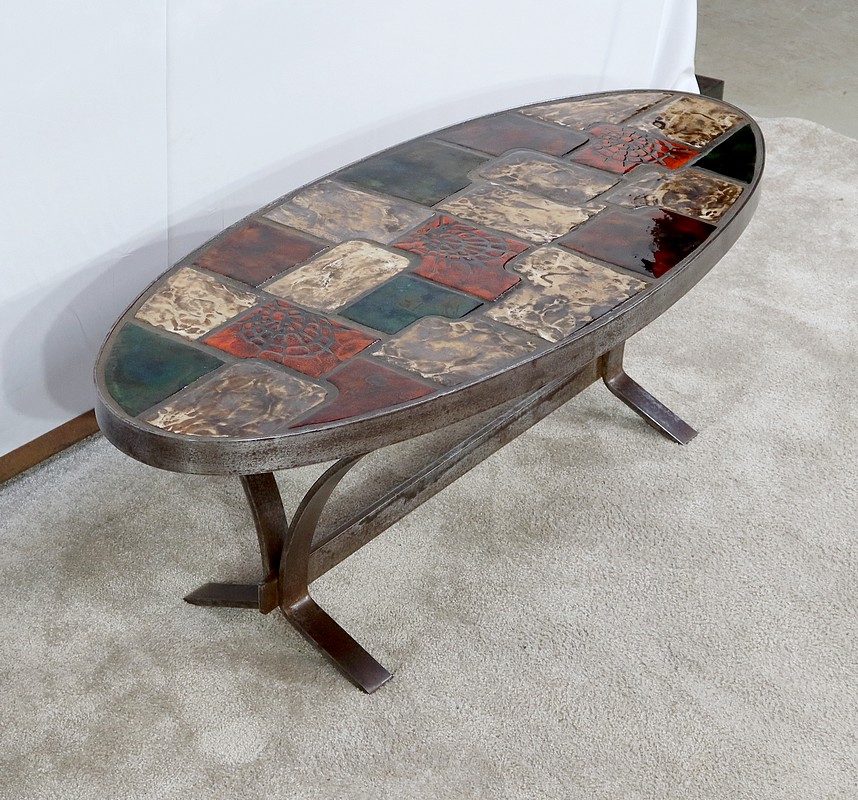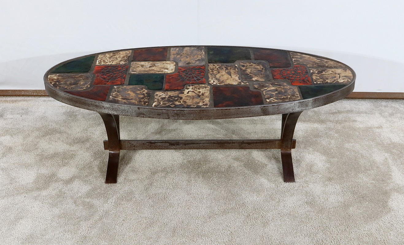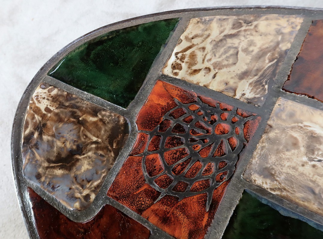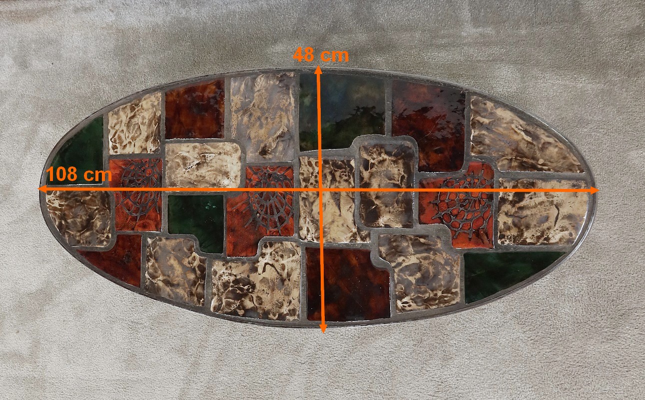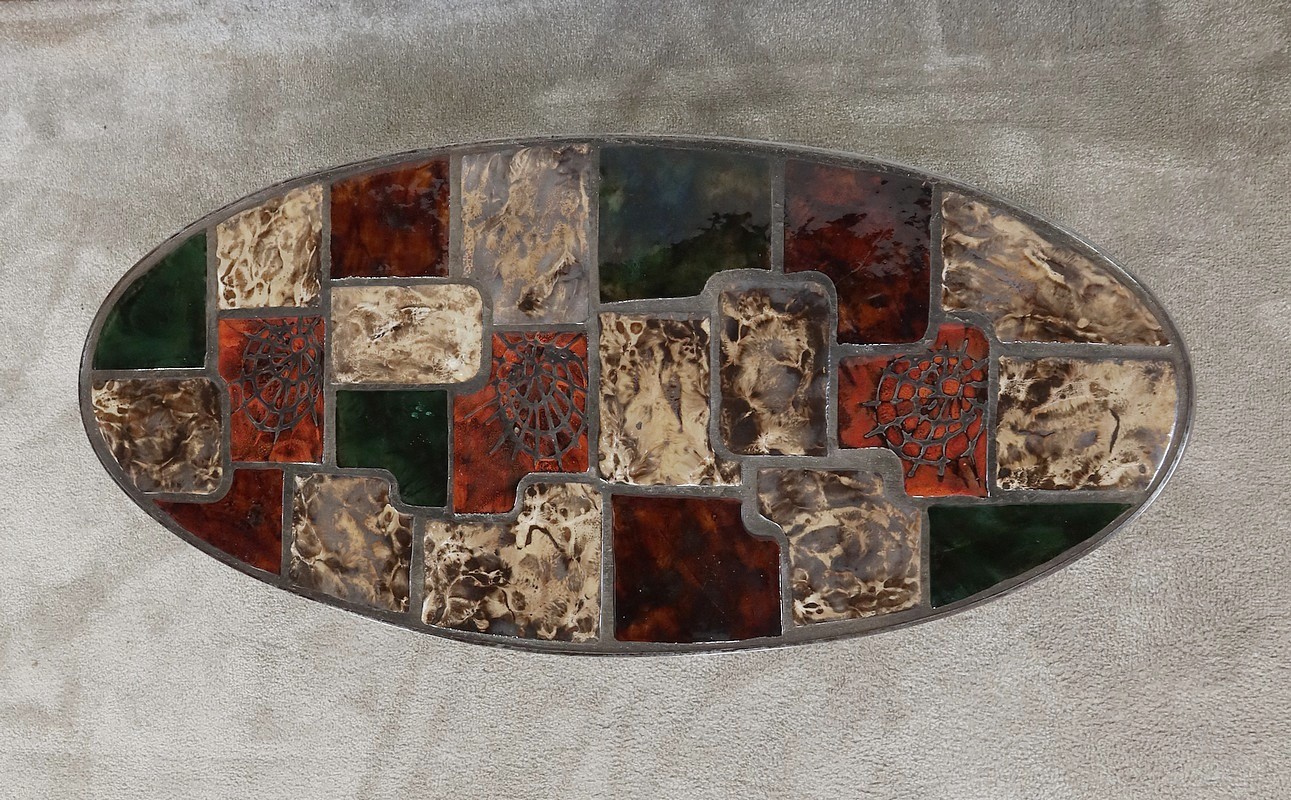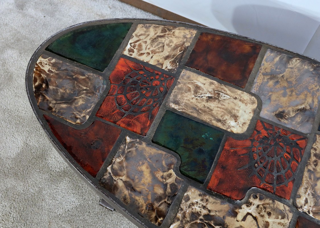 Table basse de forme oblongue habillée de carreaux de céramique émaillée aux couleurs automnales. Chaque carreau est unique par sa forme et travaillé en relief, formant un décor abstrait atypique. Ce dessus est entouré d’une ceinture en métal et repose sur un piétement du même matériau. Cette structure de section rectangulaire forme des pieds évasés en partie haute qui s’élargissent vers le bas. Ceux-ci sont réunit par une solide entretoise.
