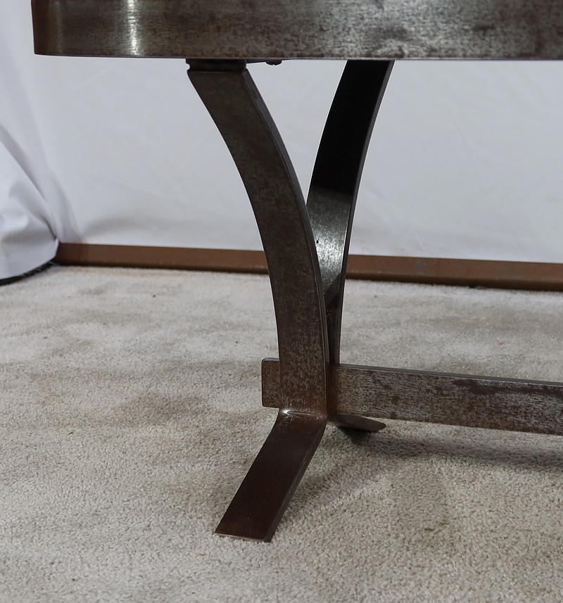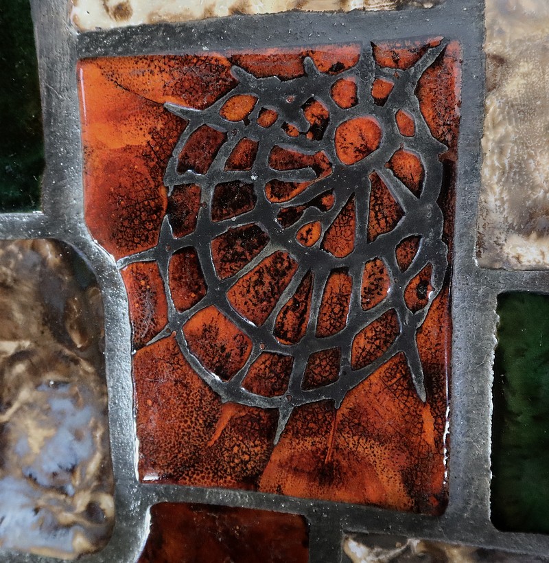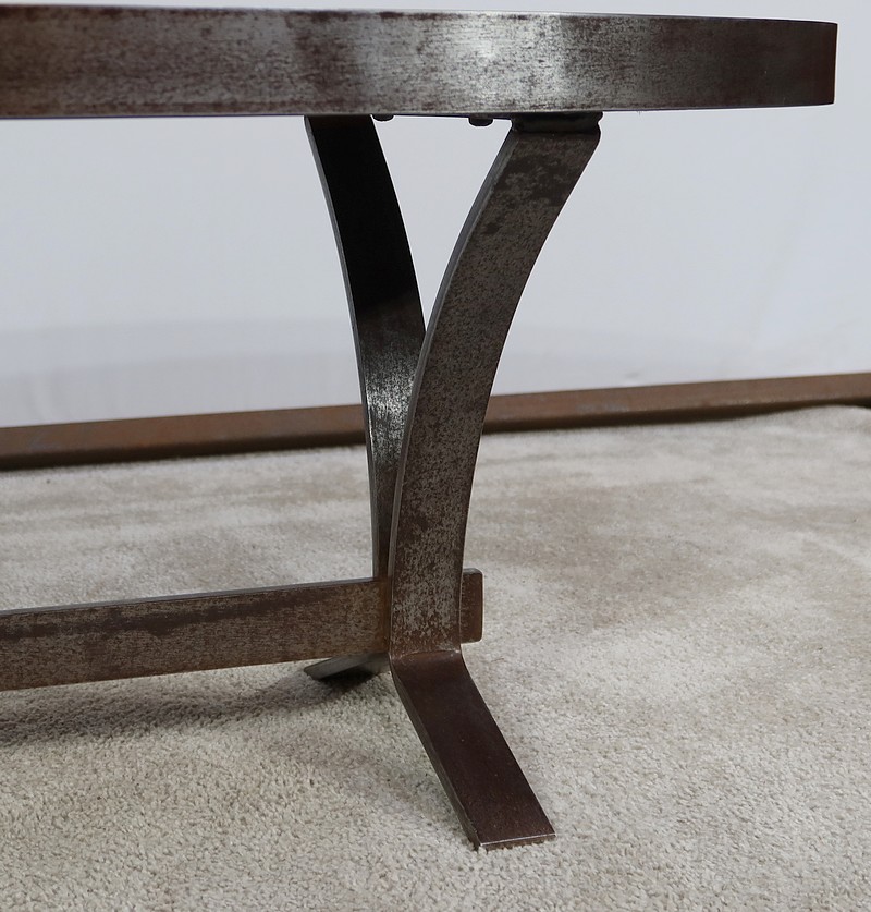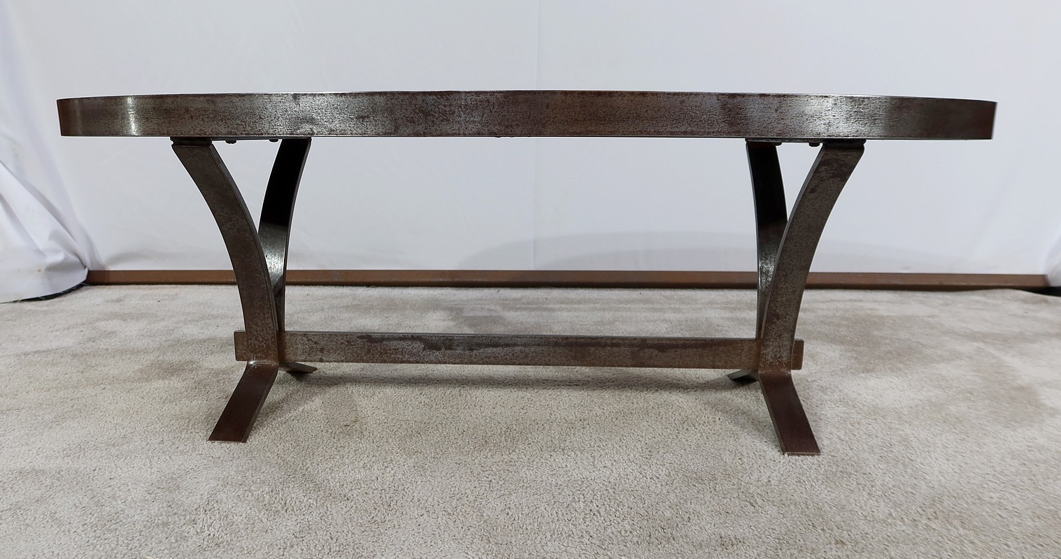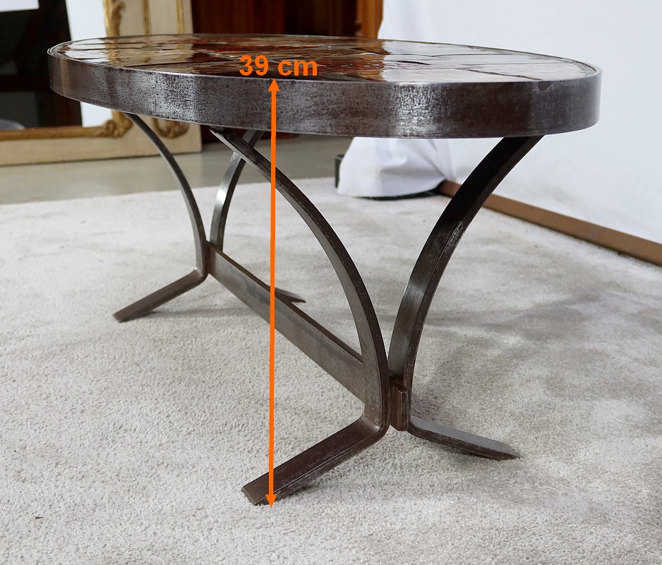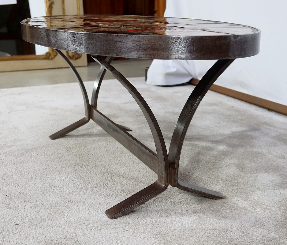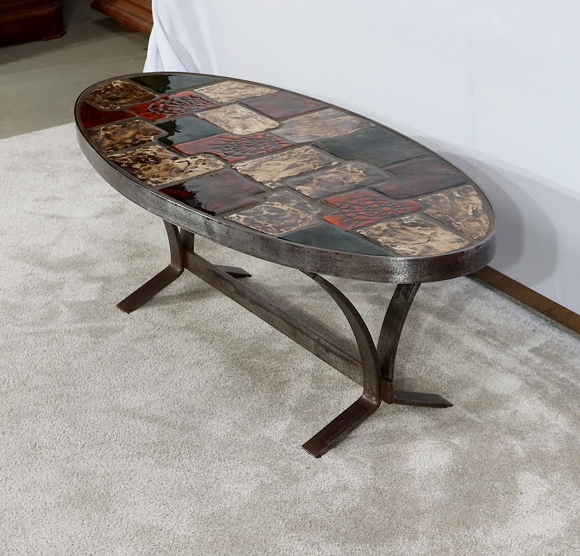 Table basse de forme oblongue habillée de carreaux de céramique émaillée aux couleurs automnales. Chaque carreau est unique par sa forme et travaillé en relief, formant un décor abstrait atypique. Ce dessus est entouré d’une ceinture en métal et repose sur un piétement du même matériau. Cette structure de section rectangulaire forme des pieds évasés en partie haute qui s’élargissent vers le bas. Ceux-ci sont réunit par une solide entretoise.