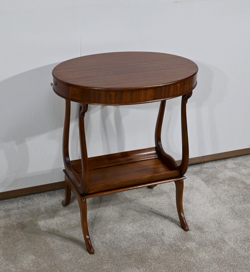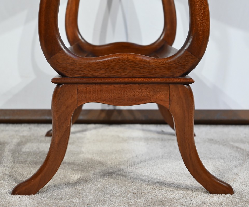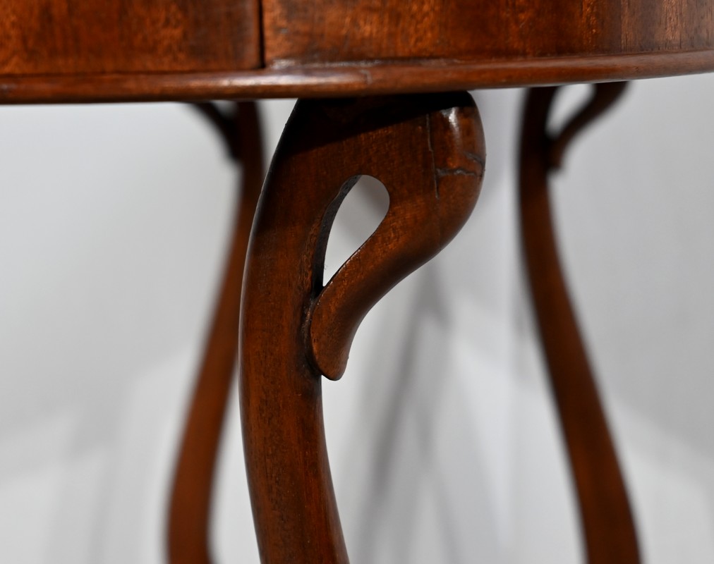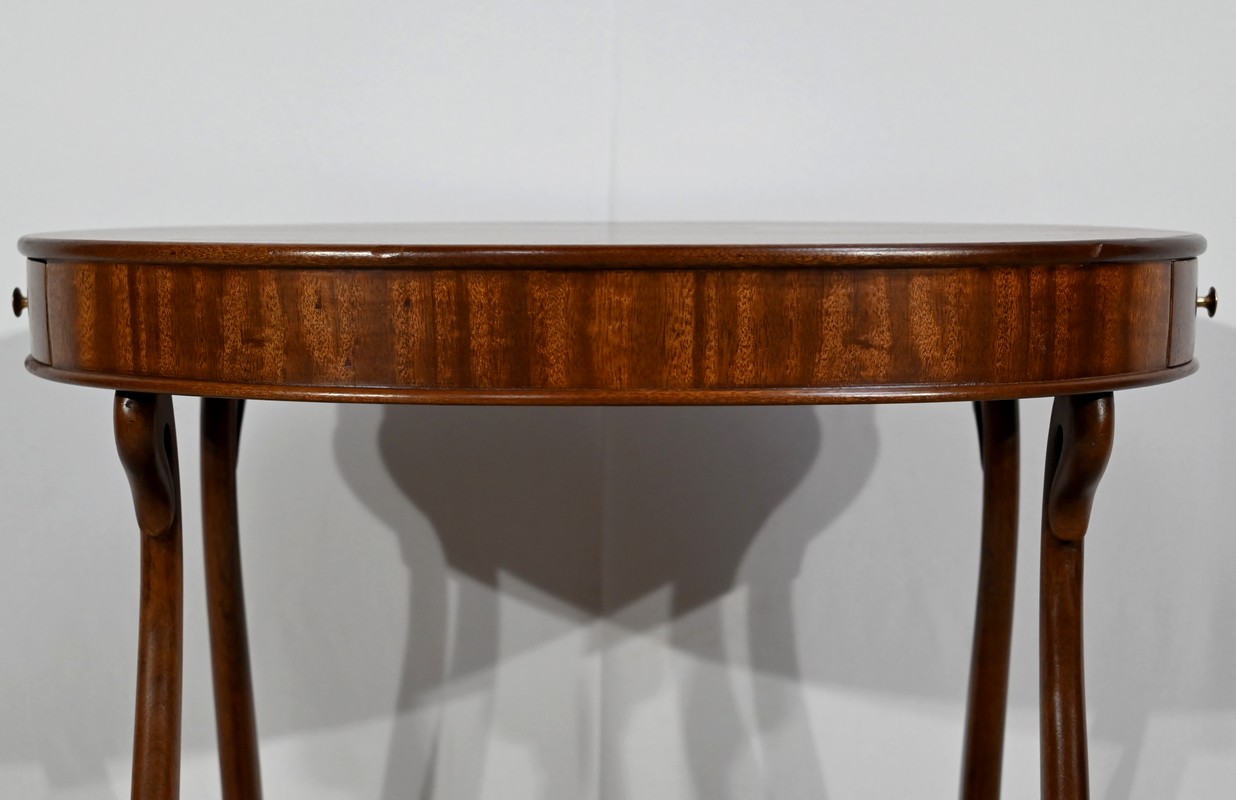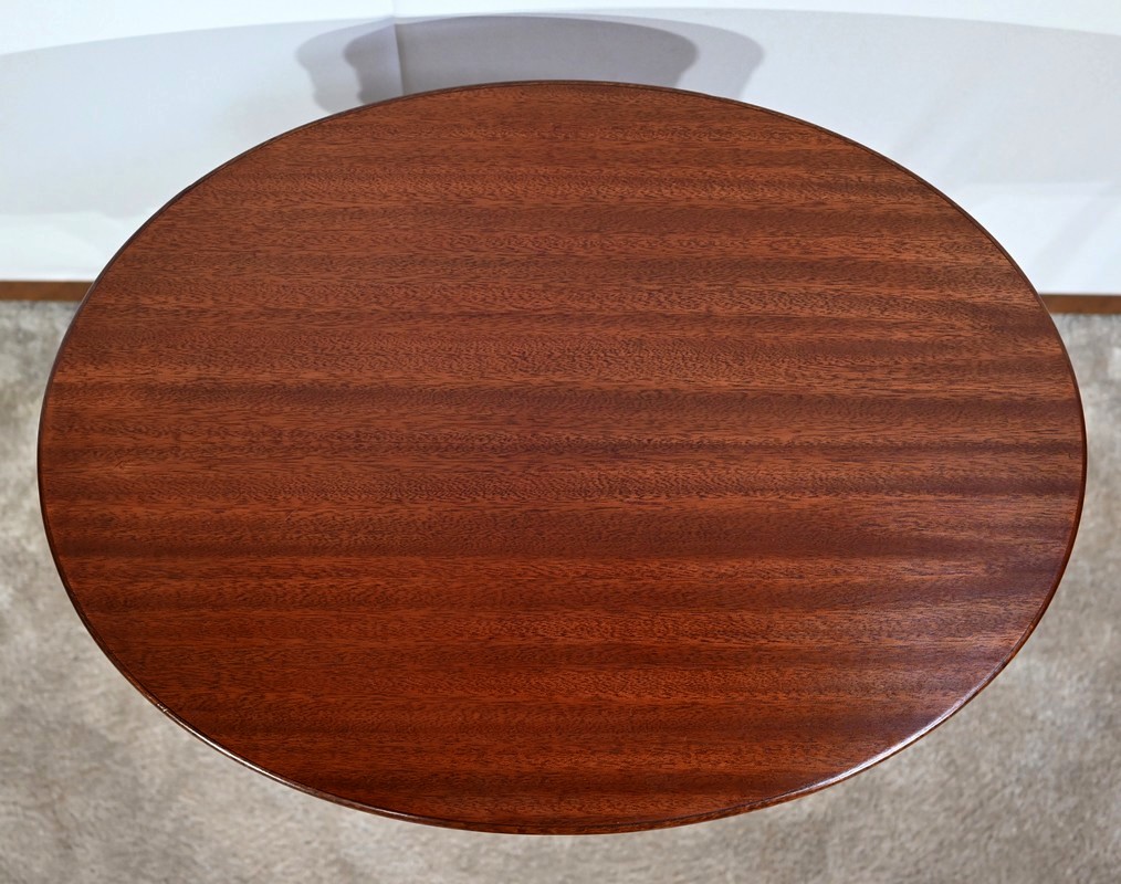 Cette table de salon en acajou massif présente un dessus ovale composé d’une planche.