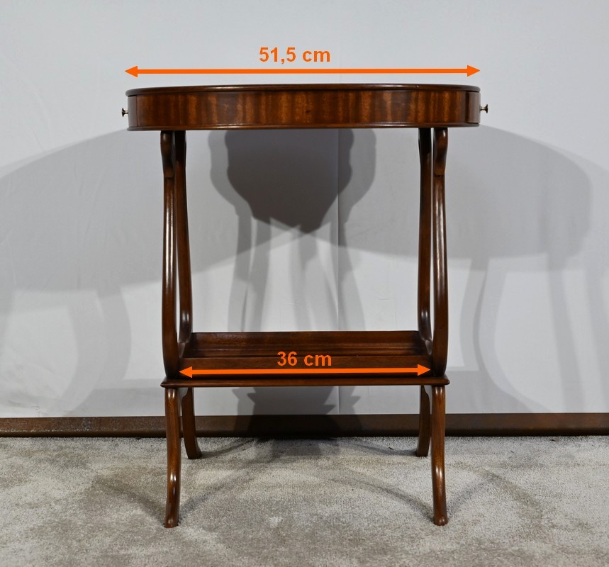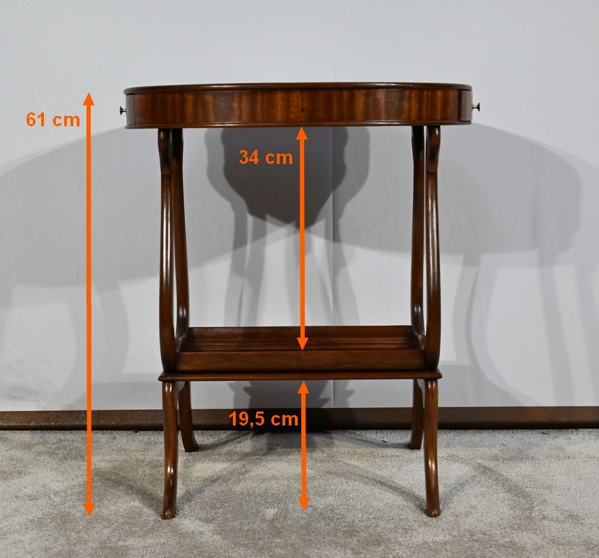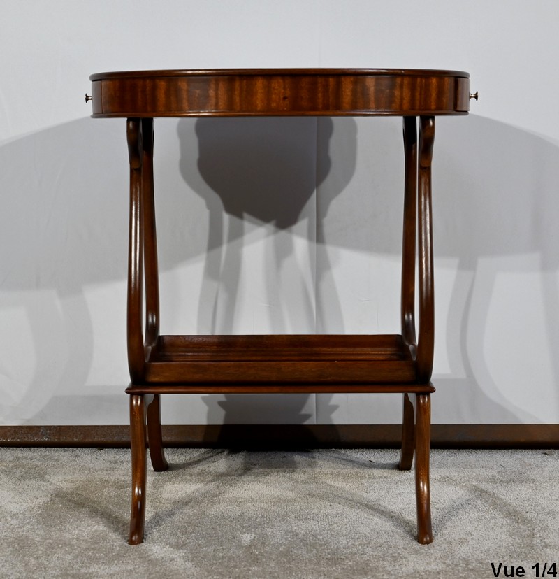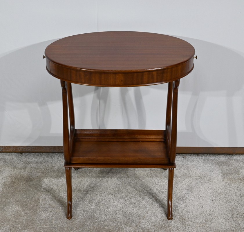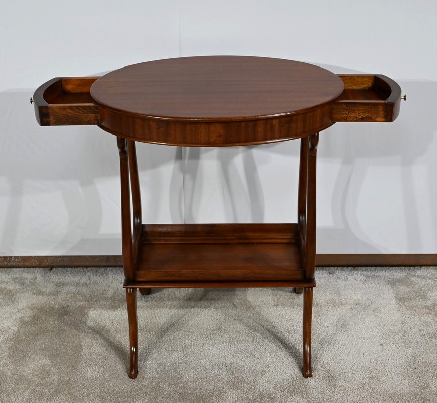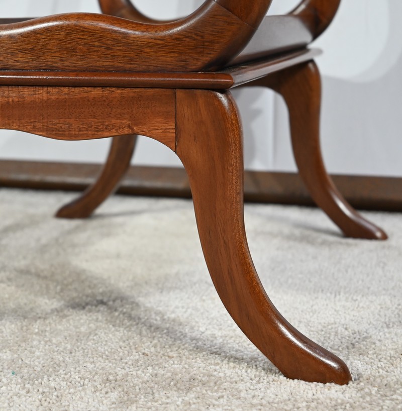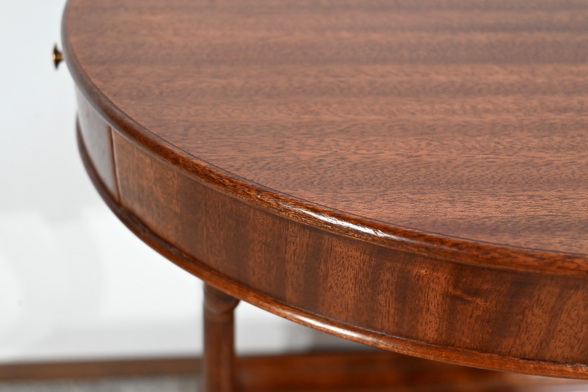 Cette table de salon en acajou massif présente un dessus ovale composé d’une planche.