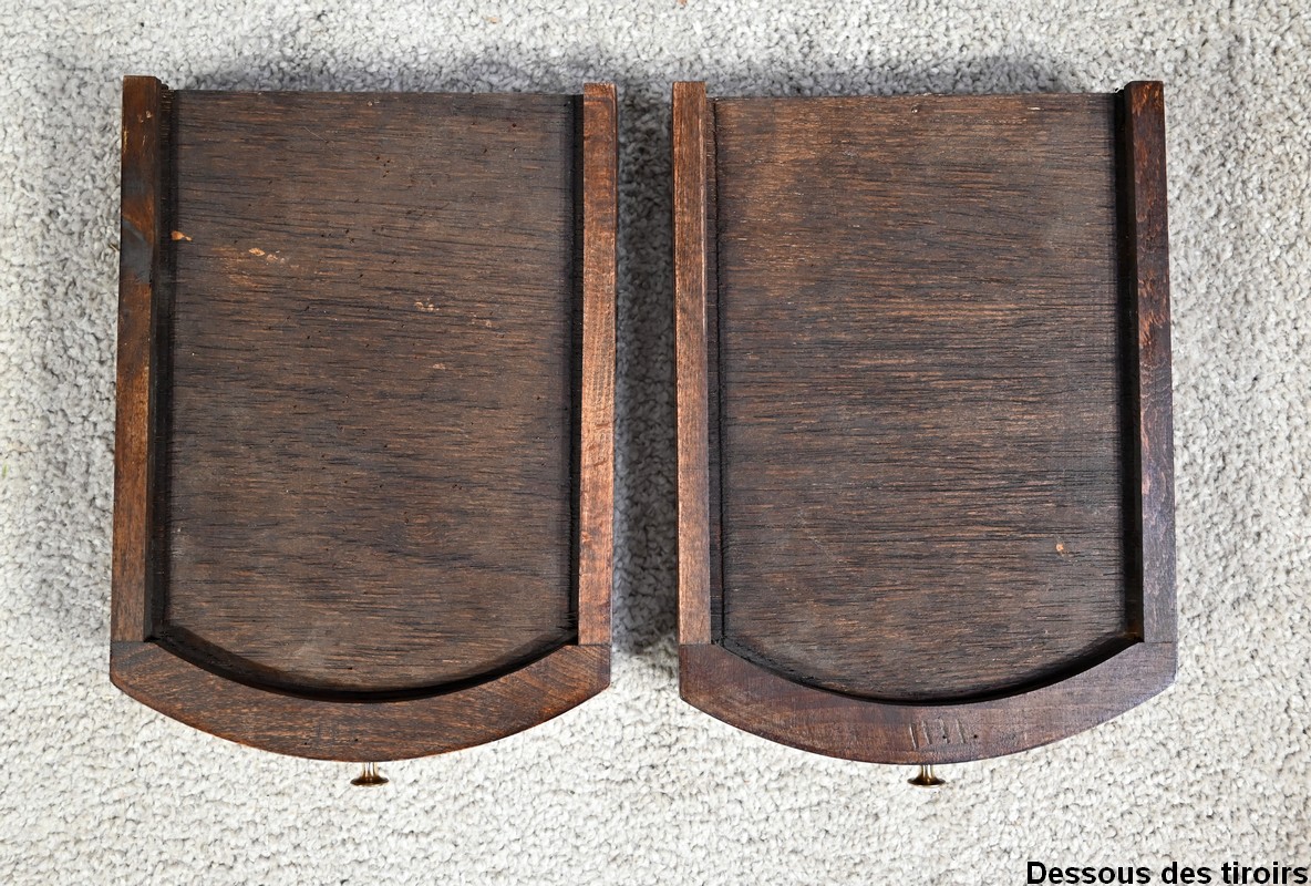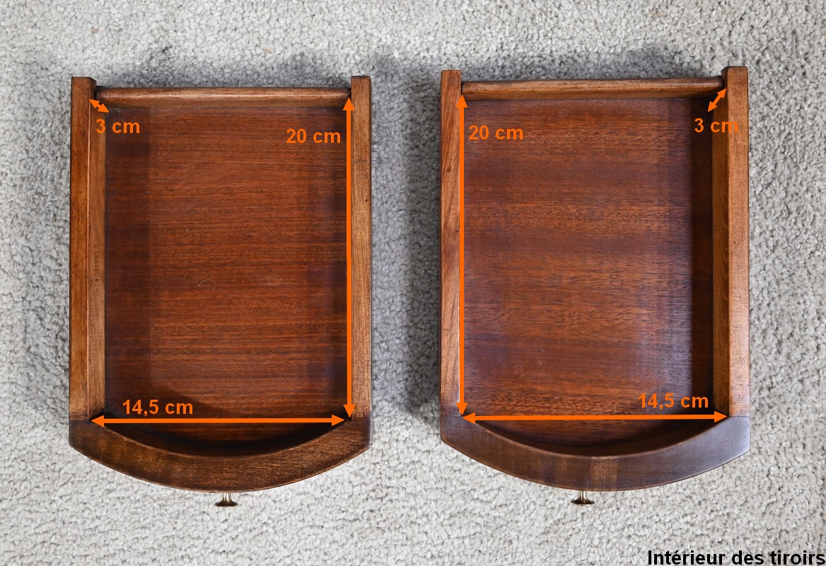 La ceinture en placage d’acajou en fil debout, soulignée par un jonc en saillie, offre deux tiroirs latéraux à boutons lentille.