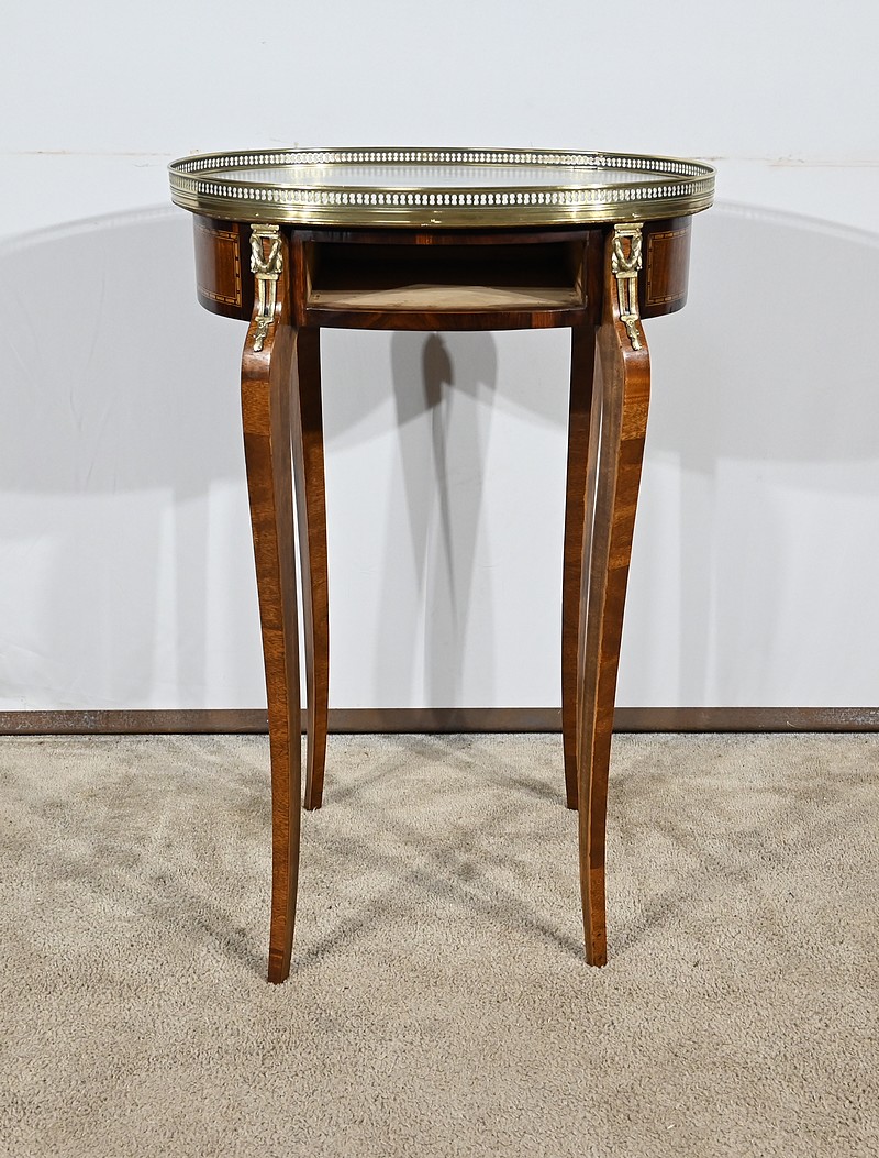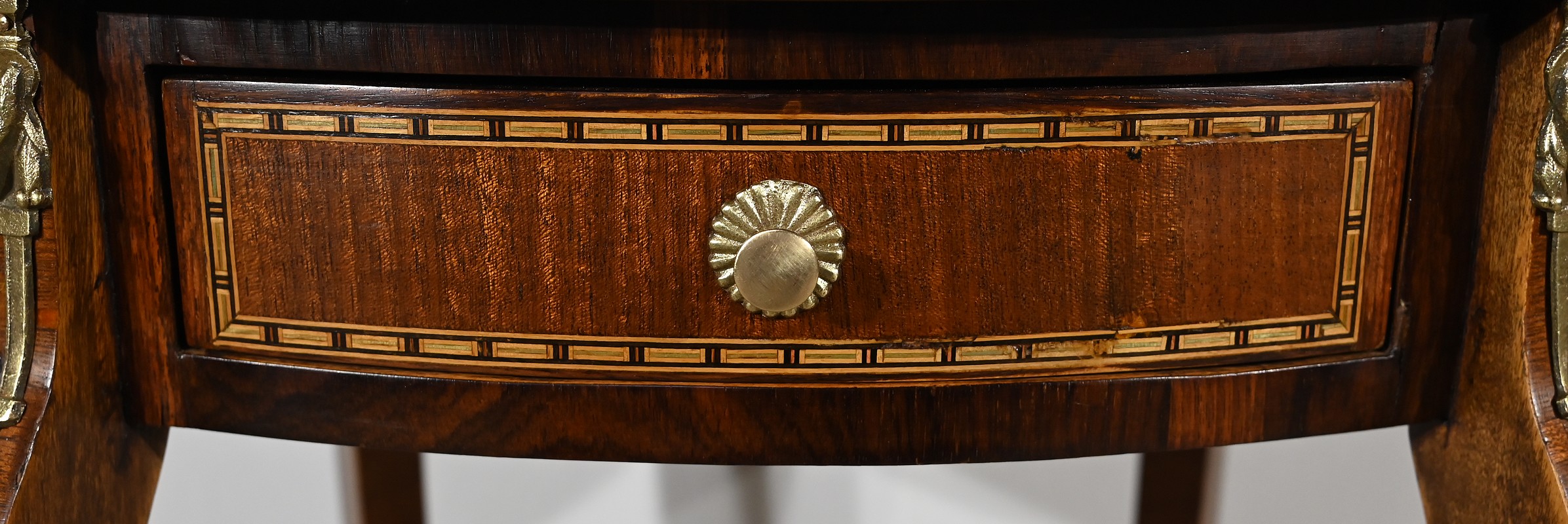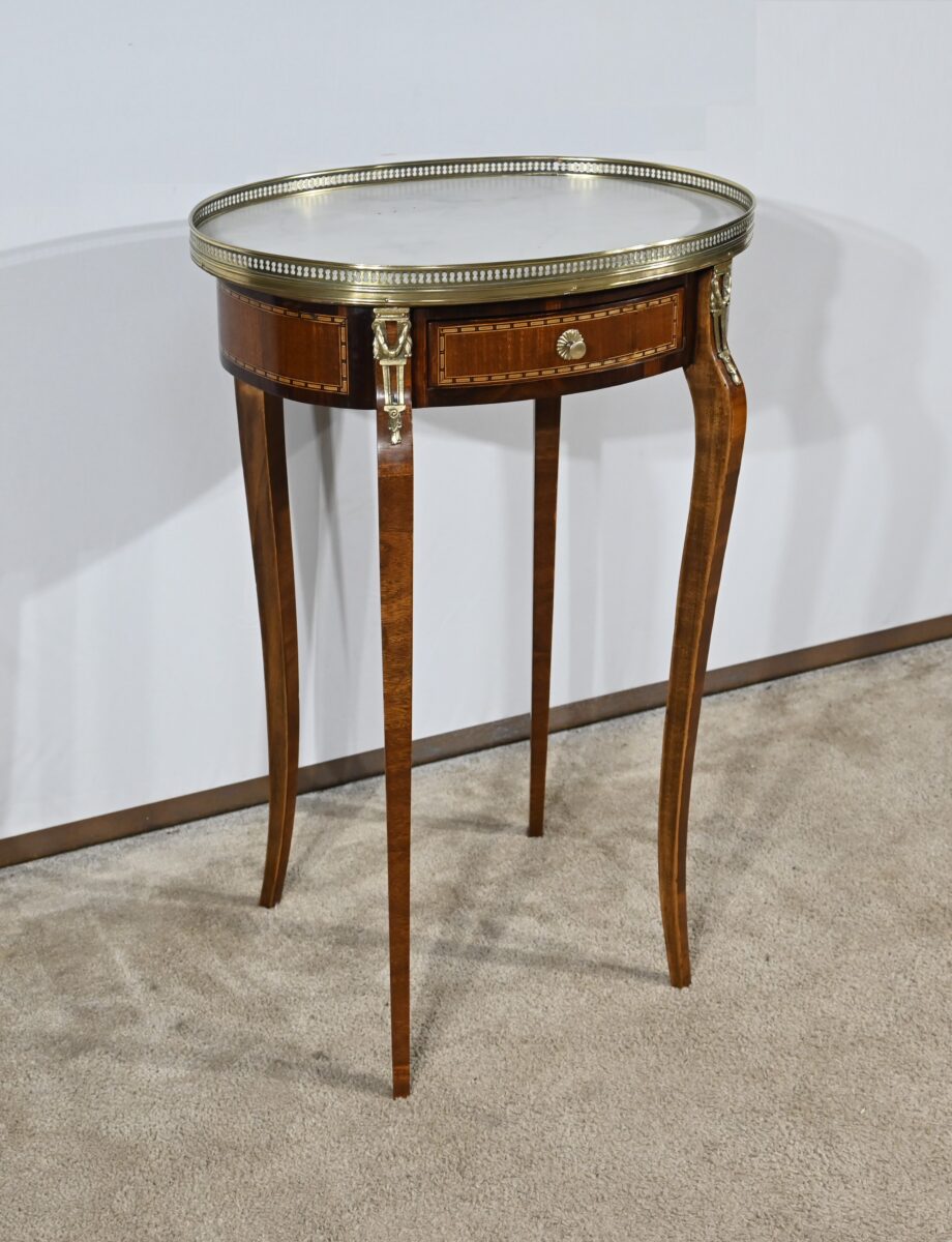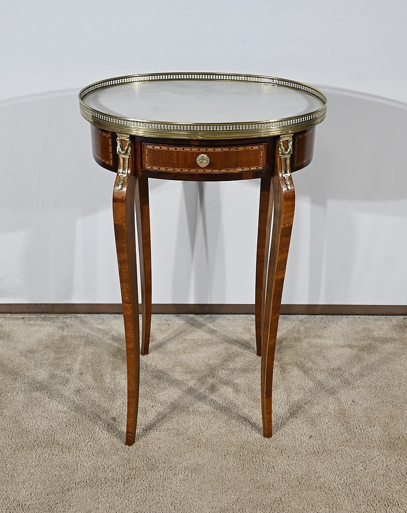 Charmante table de salon en acajou et placage d’acajou, de forme ovale et possédant un tiroir en ceinture. La façade est incrustée d’une composition de filets alternant plusieurs essences de bois en forme de rectangle. Un bouton de tirage avec rosace orne la façade. Les côtés et l’arrière de ce petit meuble sont constitués de la même marqueterie de bois précieux. Ce meuble repose sur quatre pieds à bosse légèrement en coup de fouet s’affinant vers le bas et garni en partie haute de chutes en bronze constituées de guirlandes de feuillage. Au dessus, un marbre blanc de Carrare est entouré d’une élégante galerie ajourée.