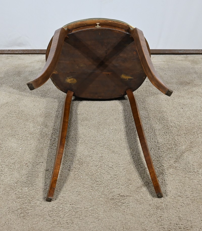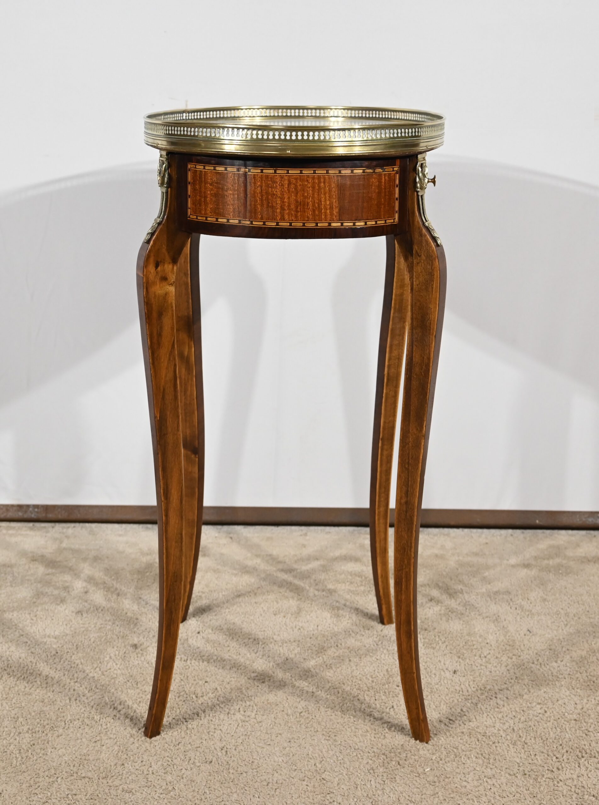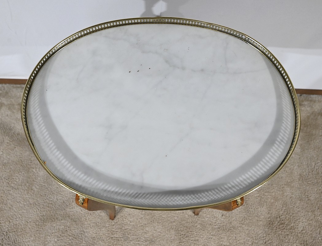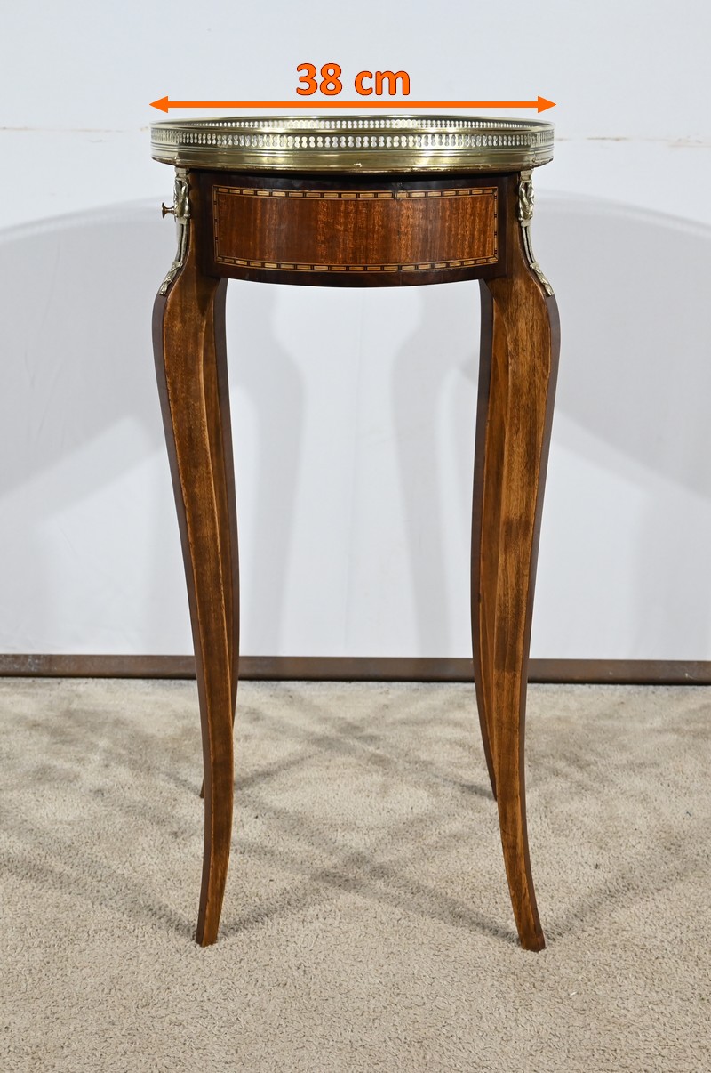 Charmante table de salon en acajou et placage d’acajou, de forme ovale et possédant un tiroir en ceinture. La façade est incrustée d’une composition de filets alternant plusieurs essences de bois en forme de rectangle. Un bouton de tirage avec rosace orne la façade. Les côtés et l’arrière de ce petit meuble sont constitués de la même marqueterie de bois précieux. Ce meuble repose sur quatre pieds à bosse légèrement en coup de fouet s’affinant vers le bas et garni en partie haute de chutes en bronze constituées de guirlandes de feuillage. Au dessus, un marbre blanc de Carrare est entouré d’une élégante galerie ajourée.