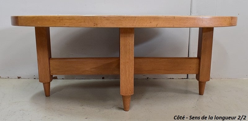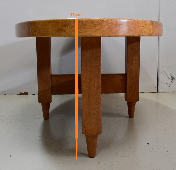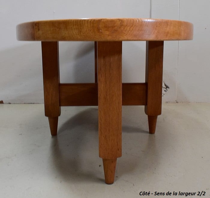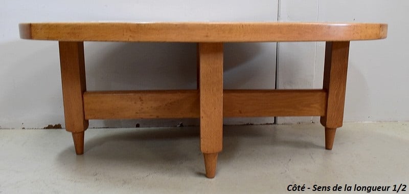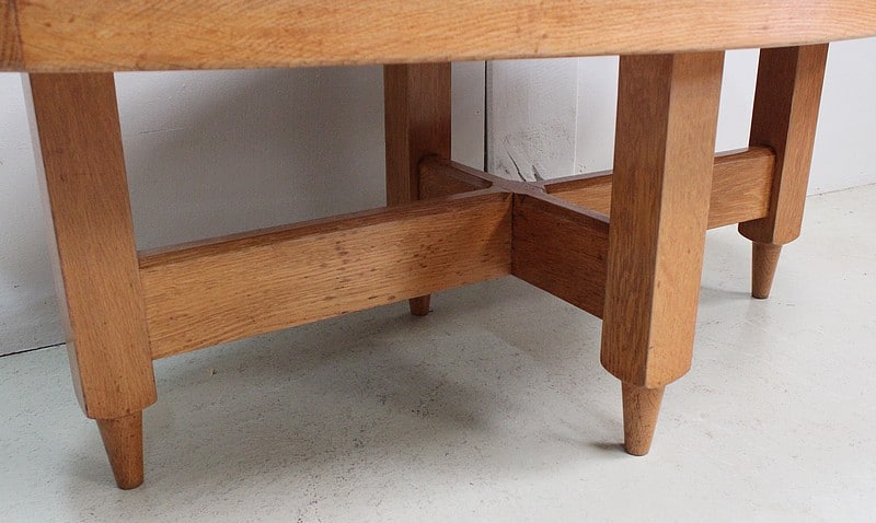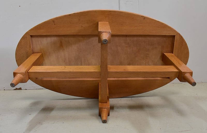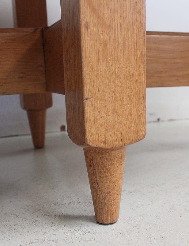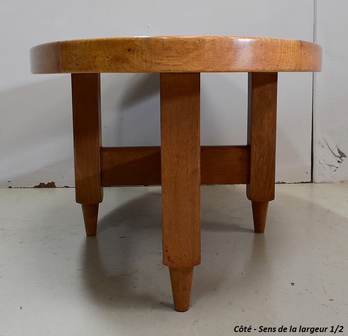 Table Basse en Chêne massif, résultat du travail conjugué de Robert Guillerme (1913 – 1990) et de Jacques Chambron (1914 – 2010). Le premier est un Designer et concepteur de meubles d’intérieur, sorti major de promotion de l’école Boulle à Paris. Le second, diplômé de l’école des Arts à Reims, est, au début de sa carrière, Peintre Décorateur. De la rencontre de ces deux hommes naîtra en 1949 la société ‘Votre Maison’. Alors associés à l’ébéniste Emile Dariosecq qui fabrique, Guillerme crée, et Chambron commerce. Depuis sa reprise par Bernard Defraye, l’entreprise Lilloise propose aujourd’hui, en sus de son activité initiale, un service de Restauration de Meubles Anciens.