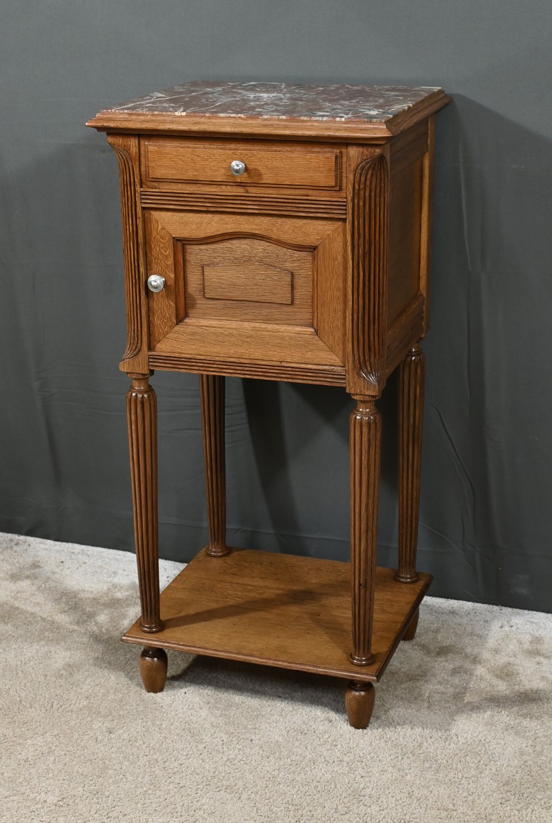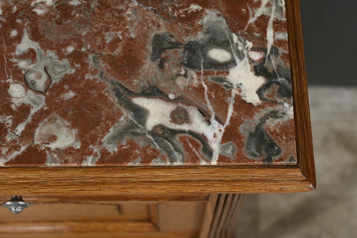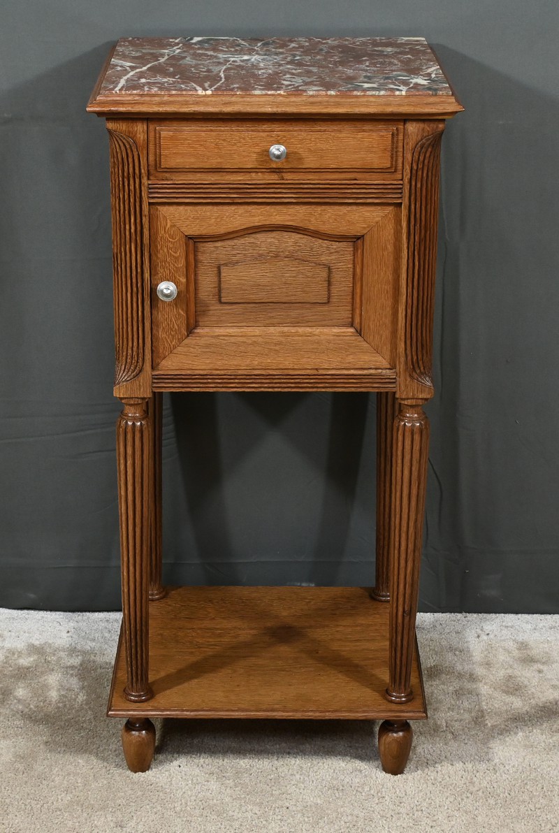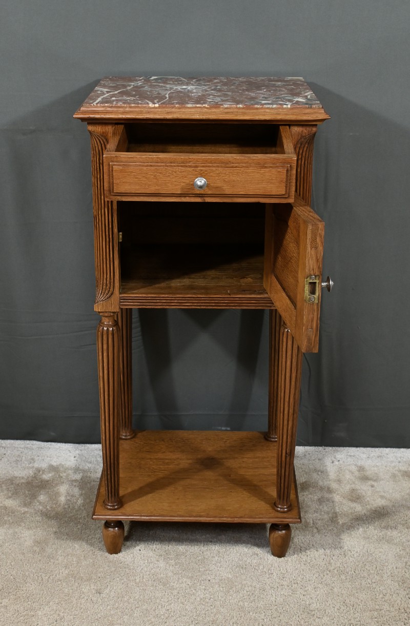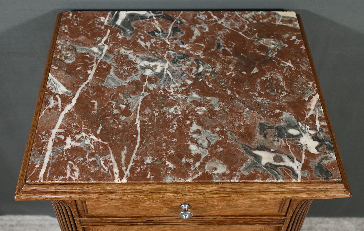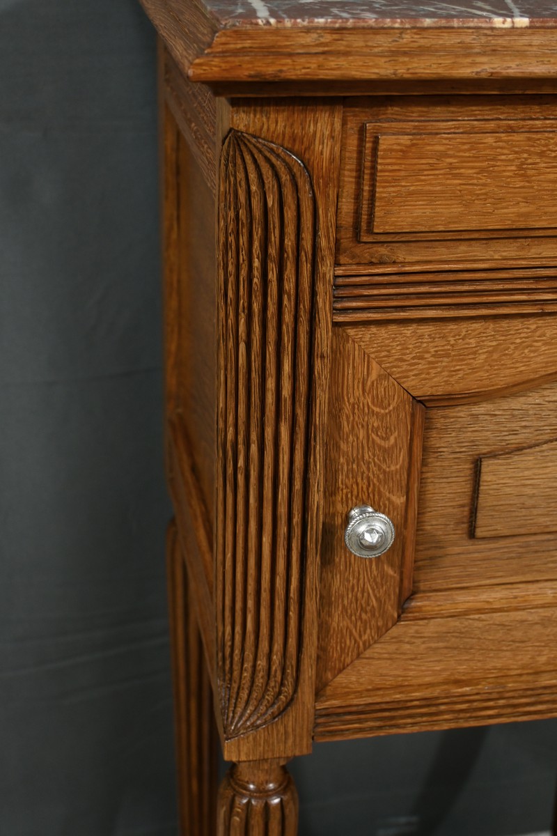 Petit meuble de rangement en chêne, doté d’un tiroir, d’une porte et d’une étagère. Ce chevet est sommé d’un marbre griotte rouge de Belgique. La façade du tiroir est moulurée en son pourtour et la porte possède un encadrement à coupe d’onglet et des moulurations en son centre. Les poignées de tirage en métal argenté sont rondes et ciselées. Les montants du meuble sont creusés et sculptés de stries dans le style Art Déco. Cette petite table repose sur des pieds cannelés s’affinant jusqu’à la tablette d’entretoise. Ce meuble de rangement est une pièce à la fois fonctionnelle et décorative.