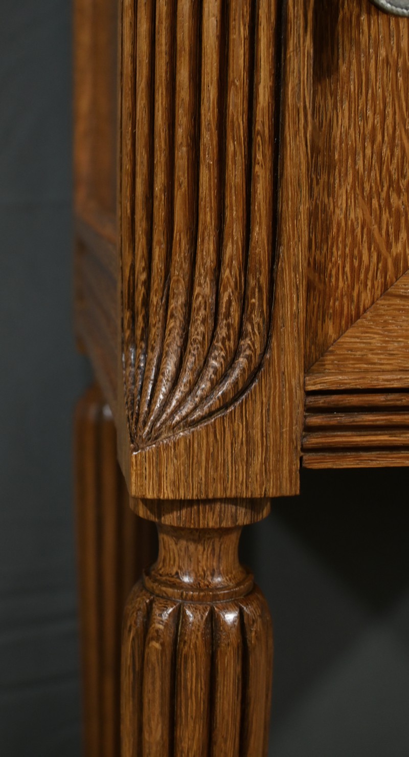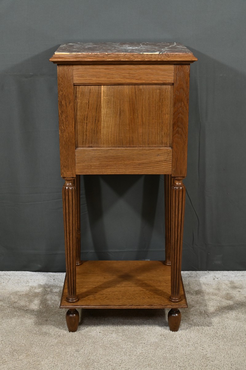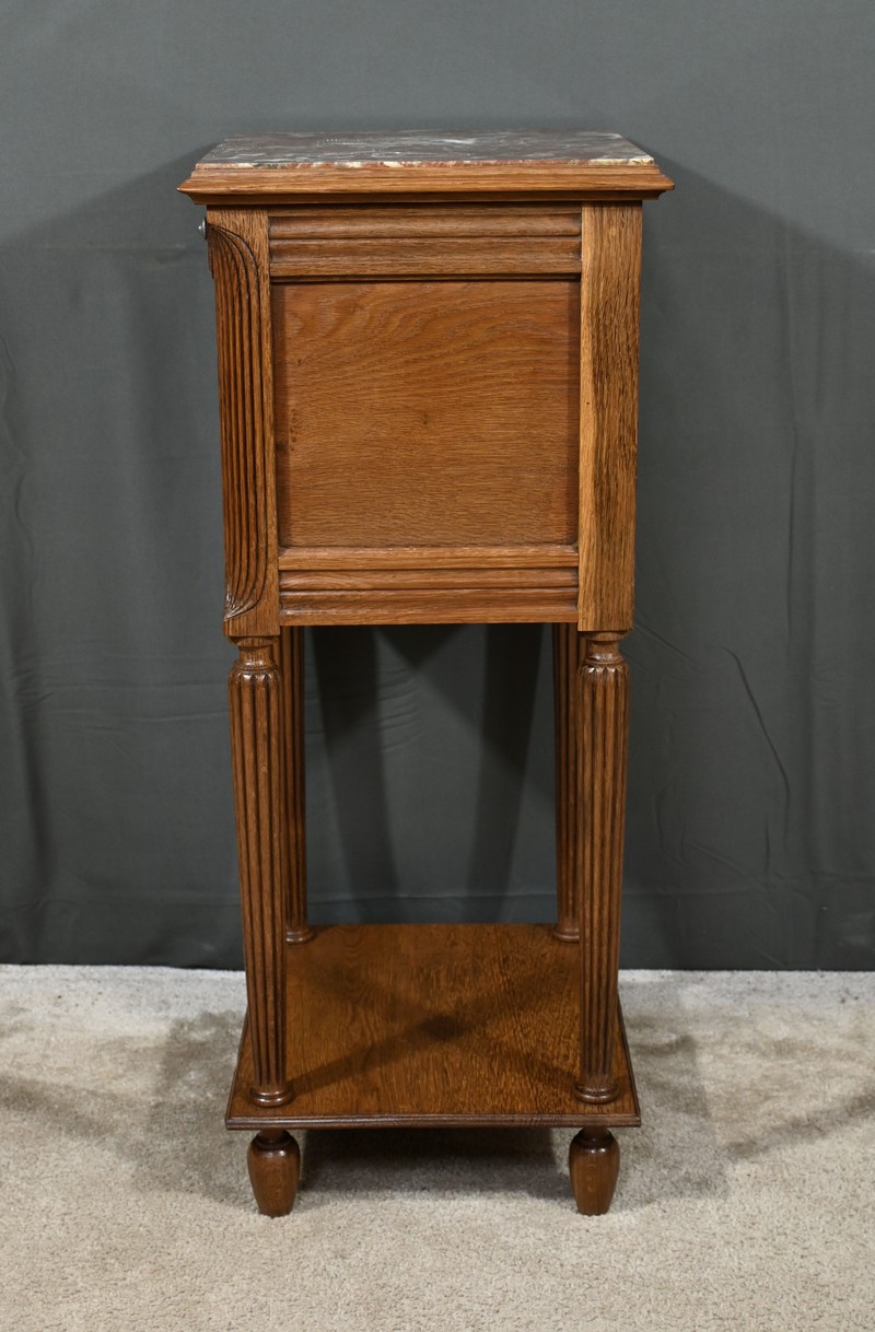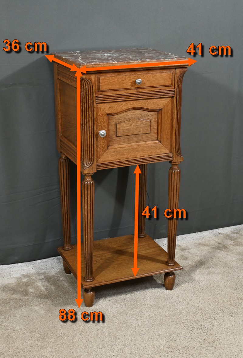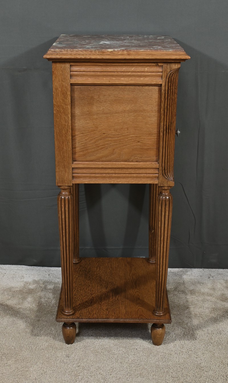 Petit meuble de rangement en chêne, doté d’un tiroir, d’une porte et d’une étagère. Ce chevet est sommé d’un marbre griotte rouge de Belgique. La façade du tiroir est moulurée en son pourtour et la porte possède un encadrement à coupe d’onglet et des moulurations en son centre. Les poignées de tirage en métal argenté sont rondes et ciselées. Les montants du meuble sont creusés et sculptés de stries dans le style Art Déco. Cette petite table repose sur des pieds cannelés s’affinant jusqu’à la tablette d’entretoise. Ce meuble de rangement est une pièce à la fois fonctionnelle et décorative.