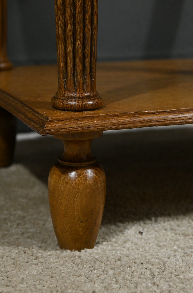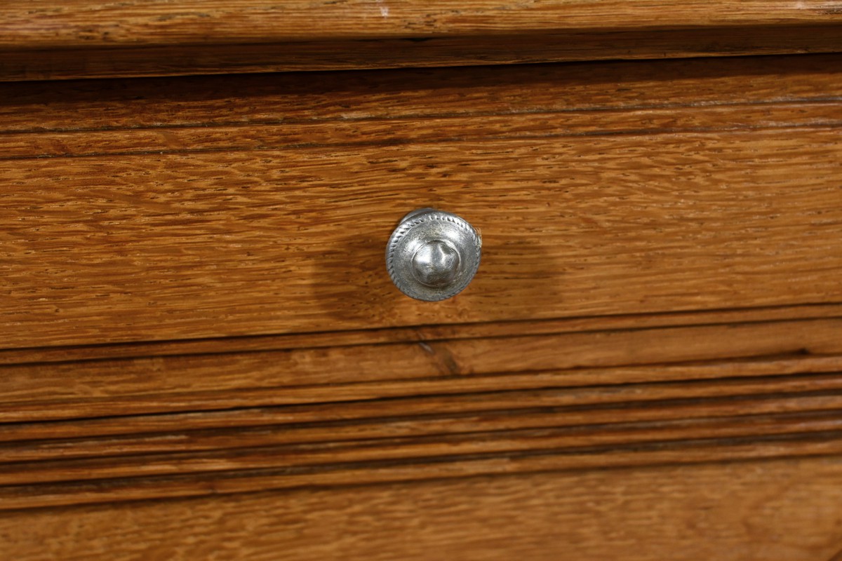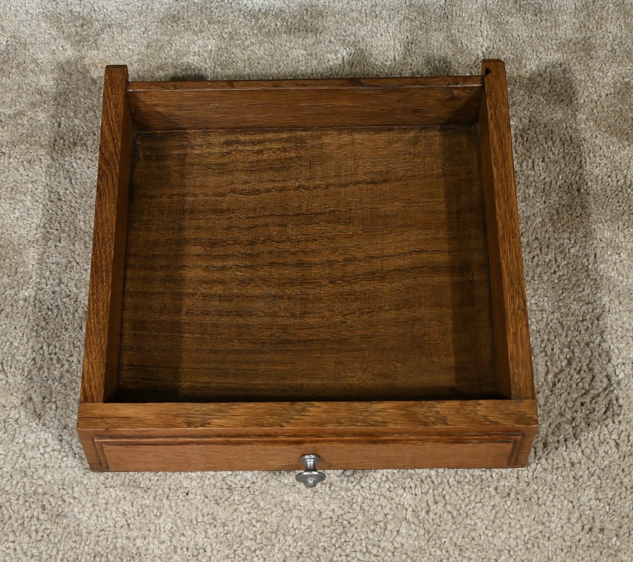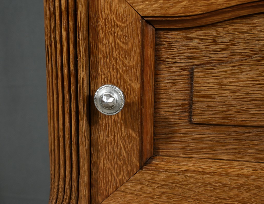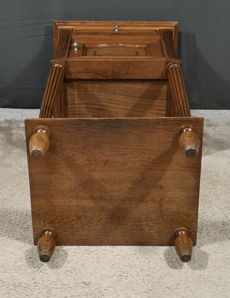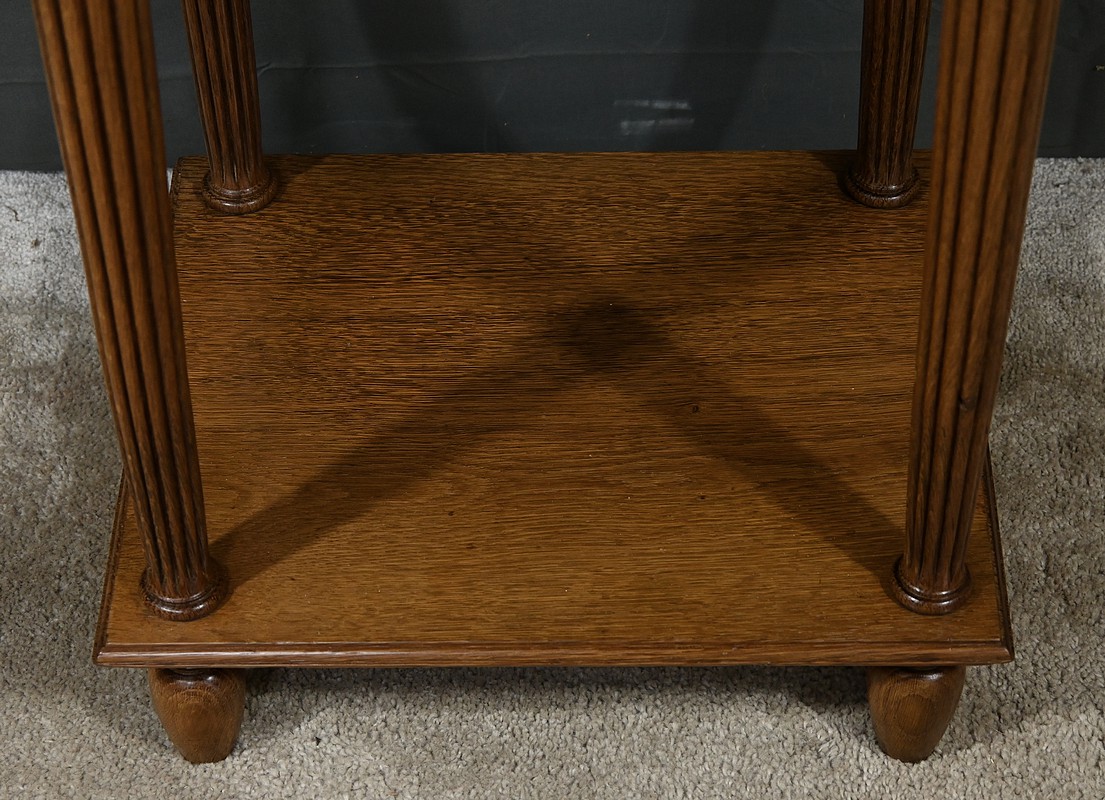 Petit meuble de rangement en chêne, doté d’un tiroir, d’une porte et d’une étagère. Ce chevet est sommé d’un marbre griotte rouge de Belgique. La façade du tiroir est moulurée en son pourtour et la porte possède un encadrement à coupe d’onglet et des moulurations en son centre. Les poignées de tirage en métal argenté sont rondes et ciselées. Les montants du meuble sont creusés et sculptés de stries dans le style Art Déco. Cette petite table repose sur des pieds cannelés s’affinant jusqu’à la tablette d’entretoise. Ce meuble de rangement est une pièce à la fois fonctionnelle et décorative.